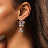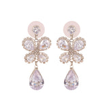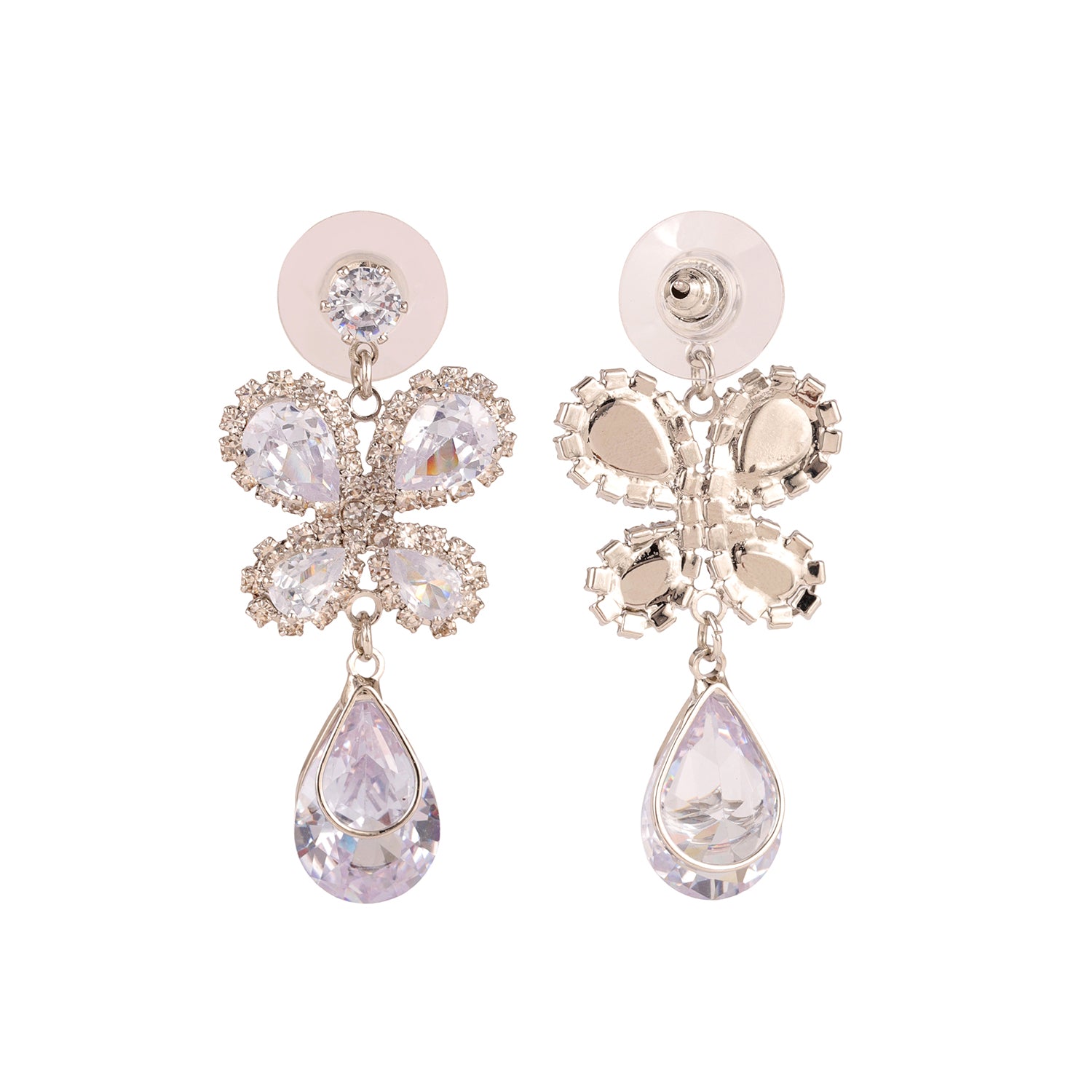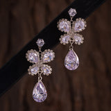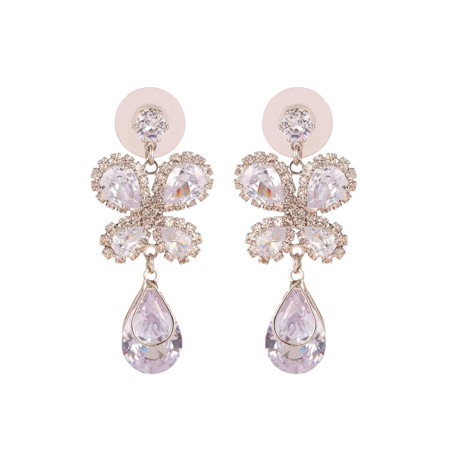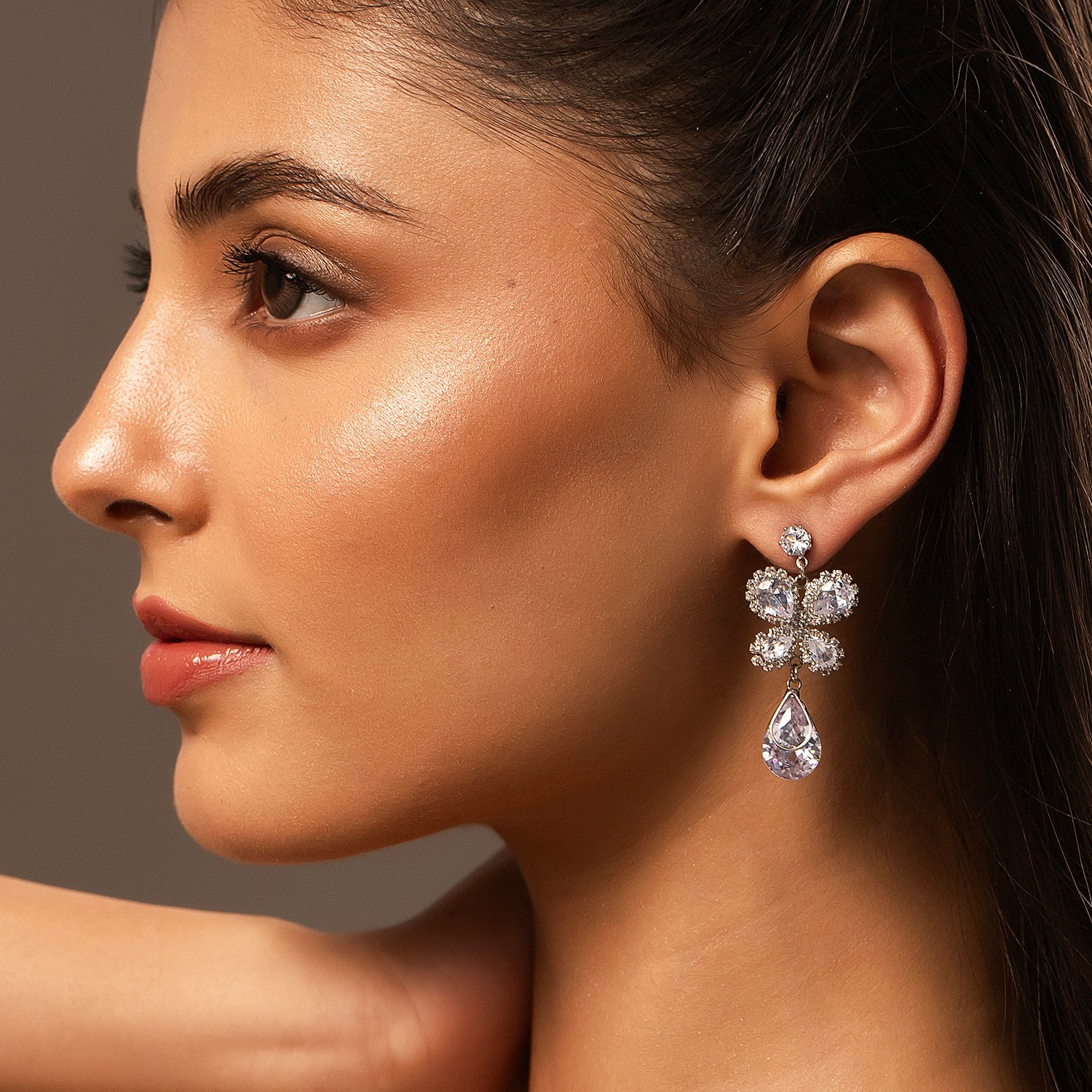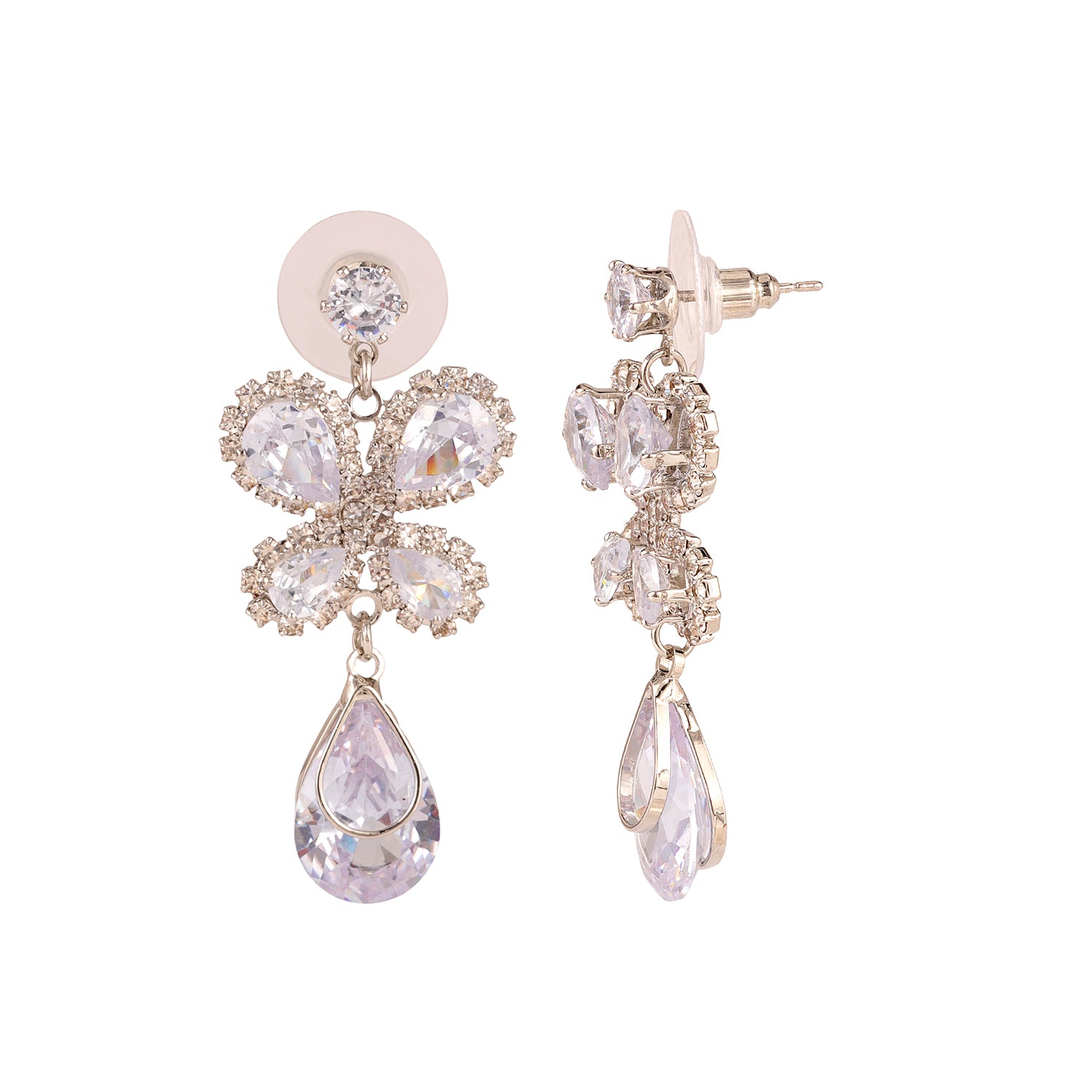 The Korean Bling Crystal Flutter Dangler Earrings are a delicate yet dazzling masterpiece, perfect for women who adore chic and versatile jewelry. Crafted from premium alloy and finished with radiant white rhodium plating, these earrings showcase an intricate floral design studded with luminous crystals that sparkle like dew-kissed petals. A teardrop-shaped crystal dangles gracefully, adding a subtle touch of sophistication. These statement earrings belong to the sought-after Korean Bling collection, celebrated for its blend of modern elegance and timeless charm. Their soft pastel hues effortlessly complement a variety of outfits, making them an ideal choice for office wear, travel, or glamorous parties. Whether gifted for Valentine's Day, Rakshabandhan, Christmas, or Diwali, these earrings are perfect for expressing love to sisters, girlfriends, wives, mothers, or friends. Truly a thoughtful gift for women of all ages, these latest trendy danglers redefine elegance for any occasion—be it everyday wear, a vacation ensemble, or a chic festive look.
