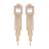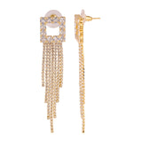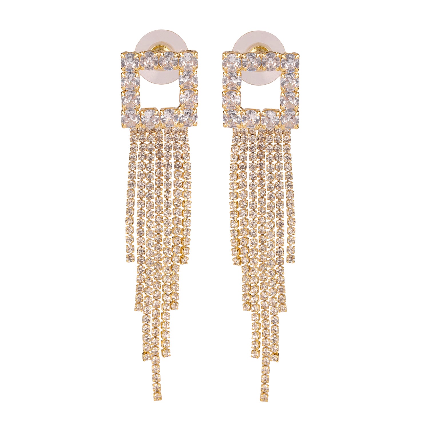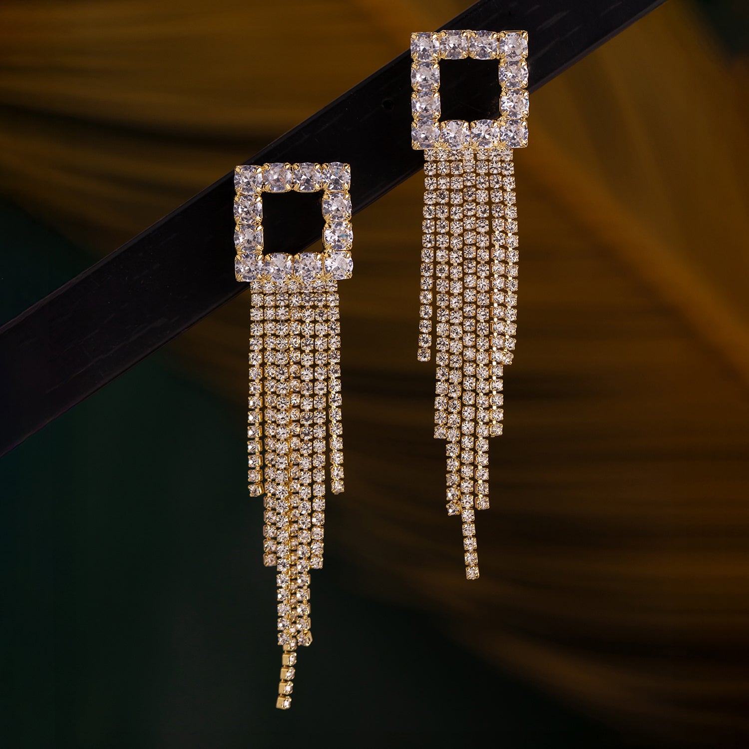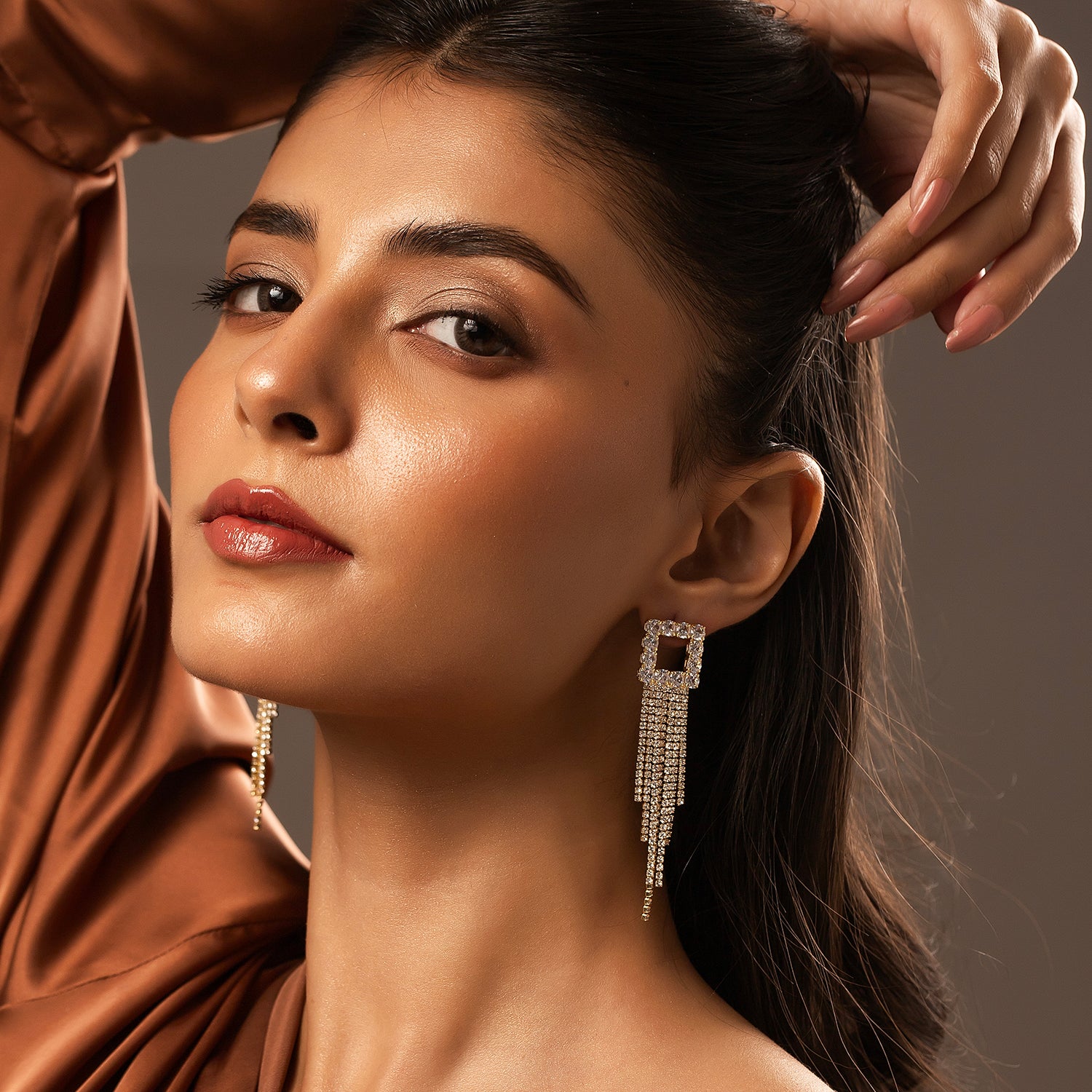 Korean Bling Golden Hour Sparkle Earrings—a vision of grace and shimmer, crafted for women who love a statement piece with a touch of poetic elegance. Designed in high-quality alloy and plated in yellow gold, these danglers blend classic charm with modern refinement, making them a must-have in the Korean Bling collection. The square stud is beautifully adorned with sparkling crystals, leading to cascading chains that add movement and drama to the design. Whether you're dressing up for a party, heading out for a stylish vacation, or adding a little glow to your office jewelry, these earrings transition seamlessly between occasions. The golden warmth paired with crystal brilliance complements both Western outfits and traditional ensembles, making them perfect for festivals like Diwali, Rakshabandhan, or Christmas. Looking for a gifting idea? These earrings make a thoughtful present for your girlfriend, wife, mother, sister, or best friend, ideal for occasions like Valentine’s Day, New Year, or even Rakhi. Chic, floral-inspired, designer, unique, and effortlessly trendy—this piece defines timeless sophistication for the modern woman.