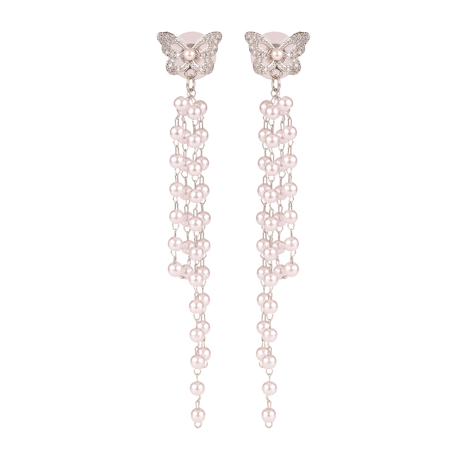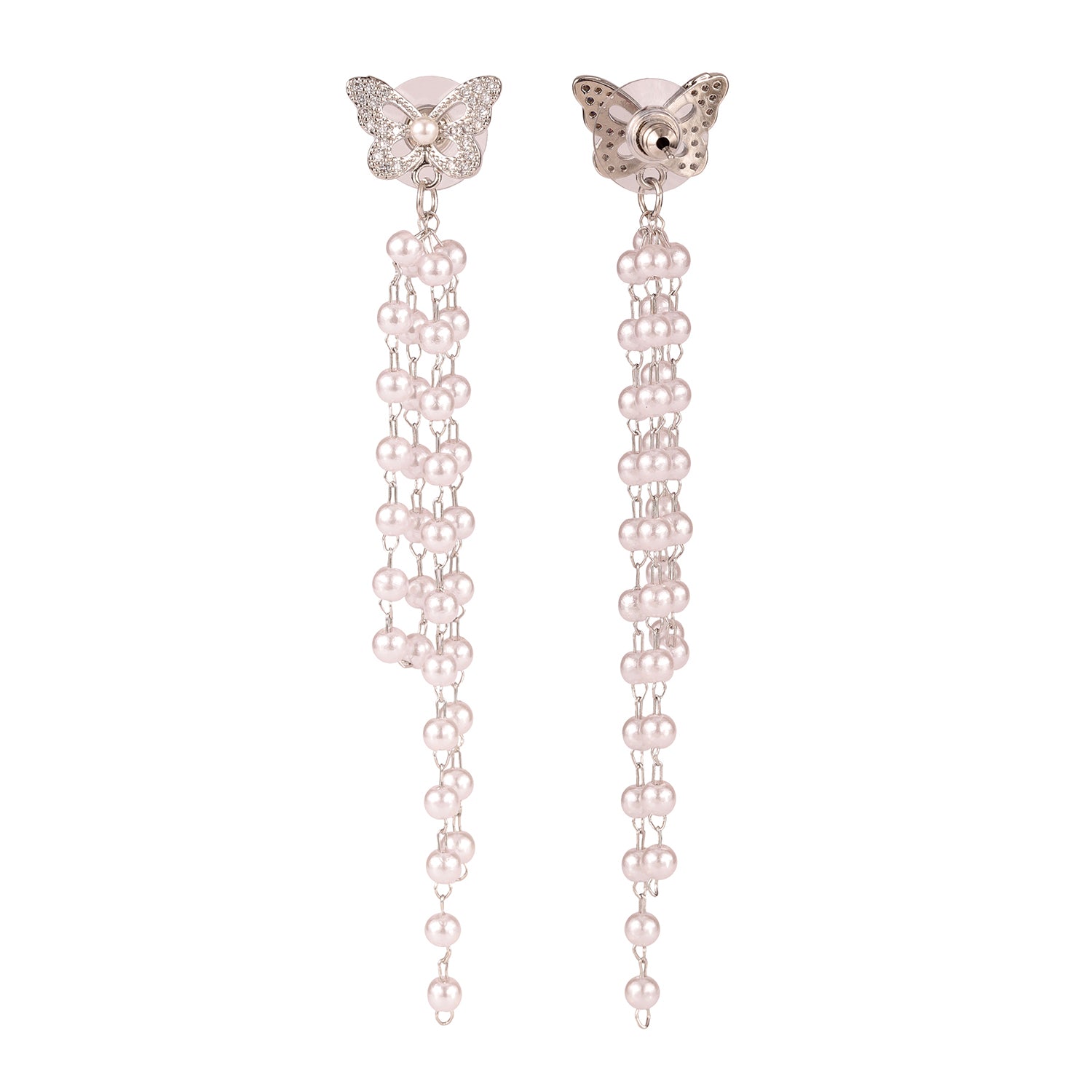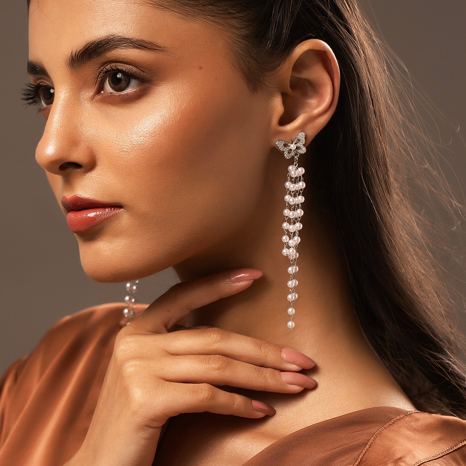 Unveiling the Korean Bling Wings of Wonder Earrings—a breathtaking fusion of elegance and artistry, designed to enchant. These statement danglers are crafted from premium alloy with a lavish white rhodium plating, ensuring a radiant shine that resists tarnishing while exuding a luxe appeal. The earrings feature delicate butterfly motifs, each adorned with dazzling crystals, capturing the essence of nature’s beauty and feminine grace. Suspended from these intricate details are cascading soft pink pearls, lending a graceful movement and timeless sophistication. Whether for office jewelry, a chic party look, or vacation wear, these earrings seamlessly adapt to any setting. Their versatile color palette pairs beautifully with everything from floral prints to sleek monochromes, making them ideal for styling with western wear, festive ensembles, and even romantic date-night outfits. The Korean Bling collection brings a touch of modern trendiness to classic aesthetics, making these earrings perfect for gifting—be it Valentine’s Day, Christmas, New Year, Diwali, Rakshabandhan, or as a thoughtful gesture to a sister, girlfriend, wife, mother, or best friend. A true designer piece, these earrings embody elegance, floral inspirations, and an irresistible chic aura that makes them the ultimate gift for women who love sophistication with a touch of whimsy.