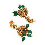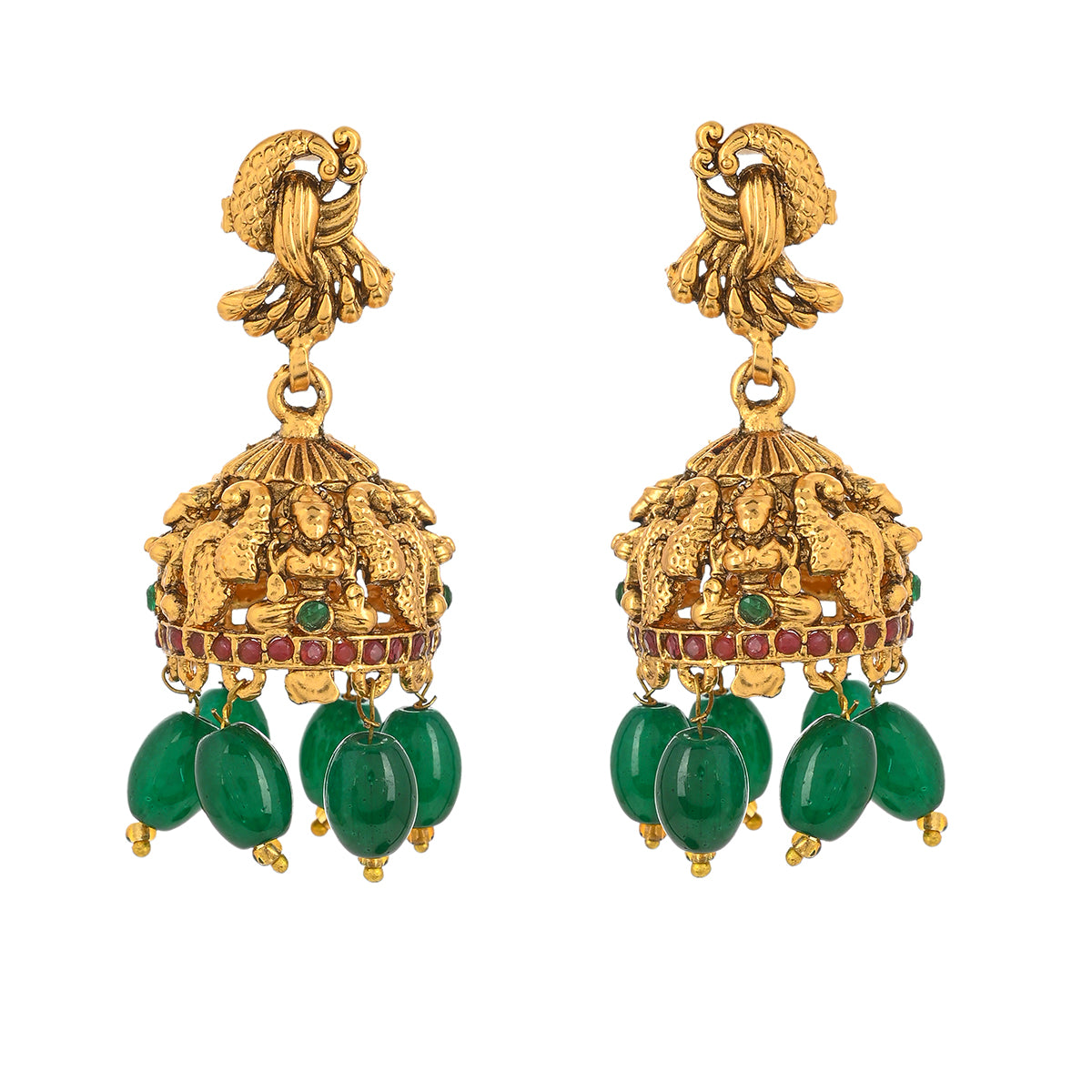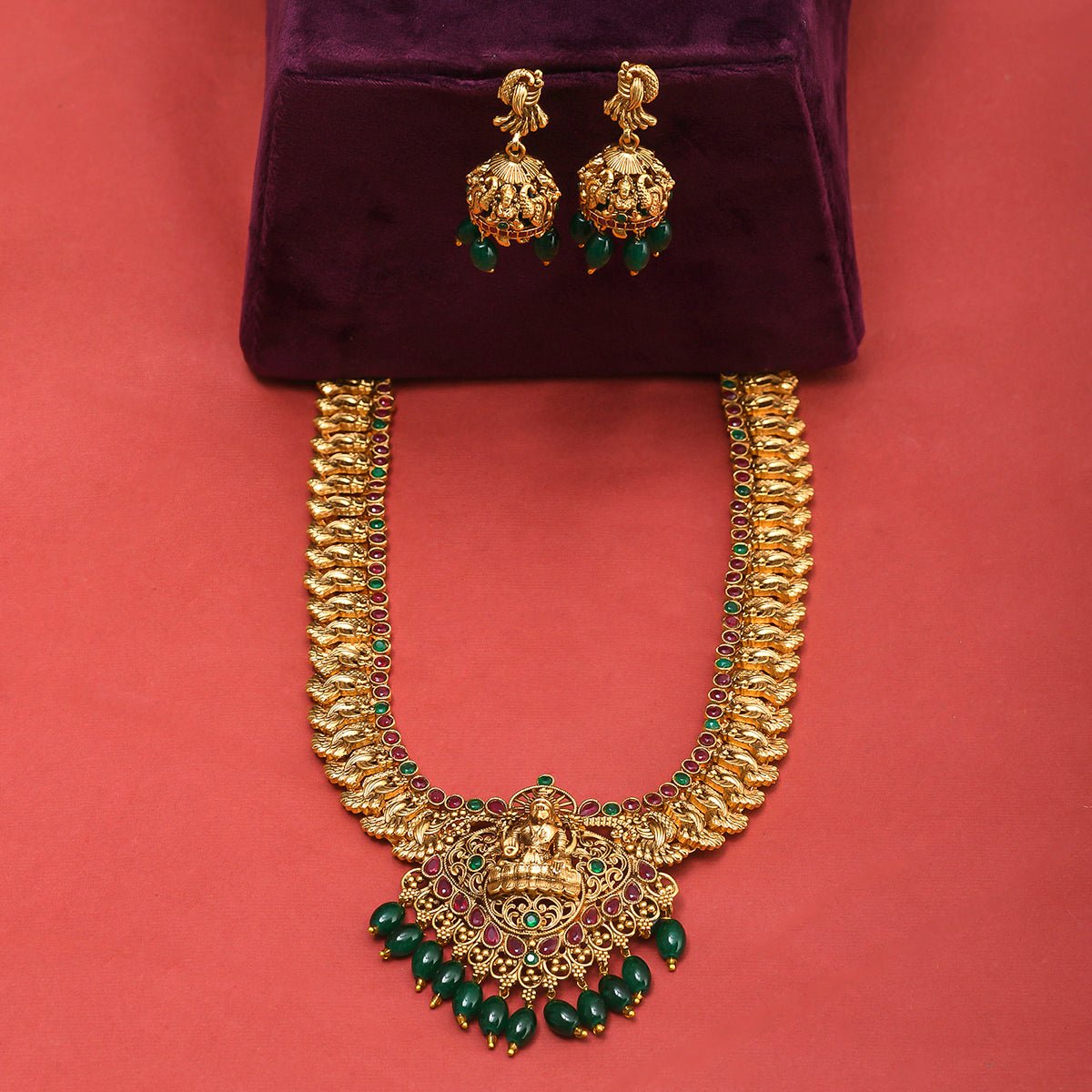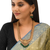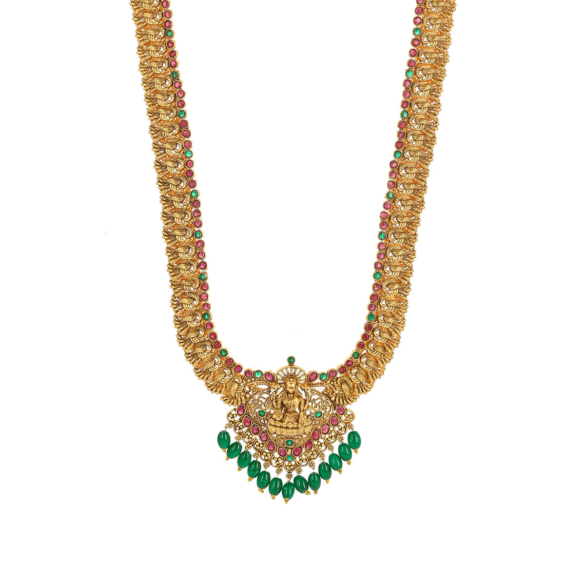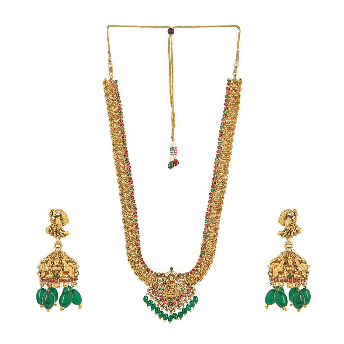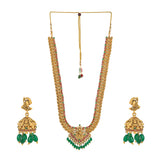 Brass temple design jewellery set, adorned with a divine goddess Lakshmi motif. Yellow gold plating and faux pearls and kundan embellishments add to the opulence of the long necklace and earrings. Pair the set with any of your favourite formal Indian outfits.