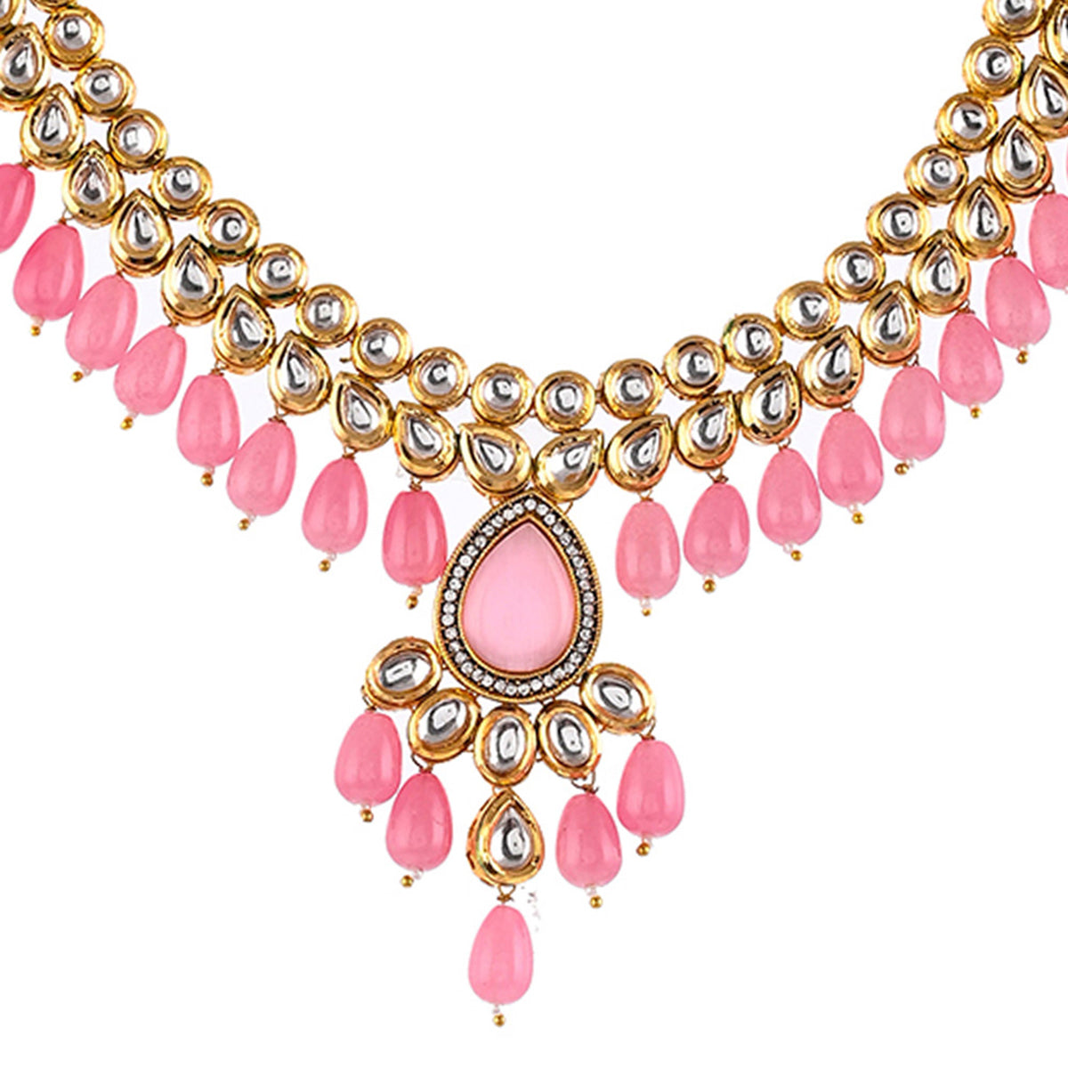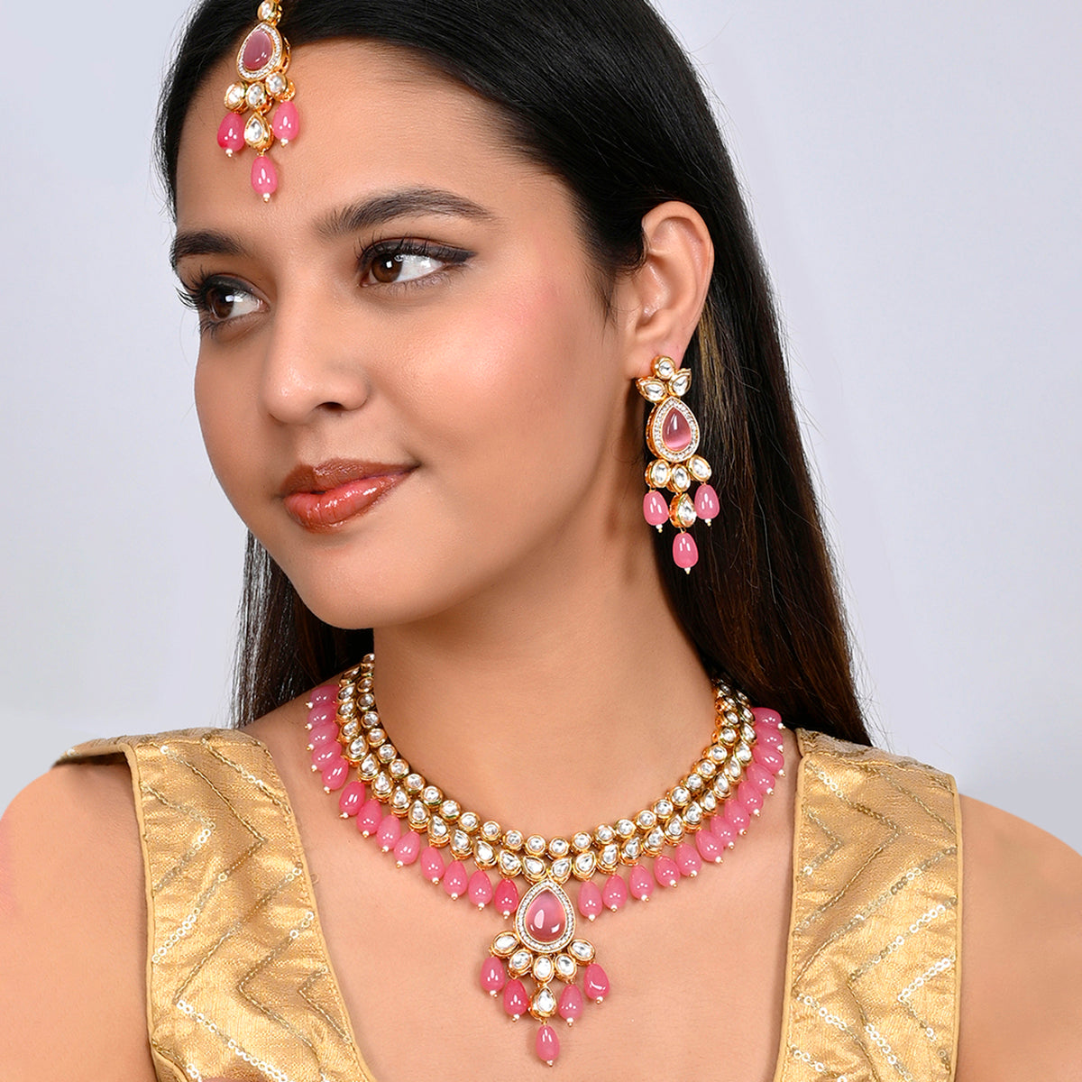 Beaded maang tika set with kundan gemstone embellishments. Gold plated and fashioned out of brass. Versatile and a comfortable wear at all times.