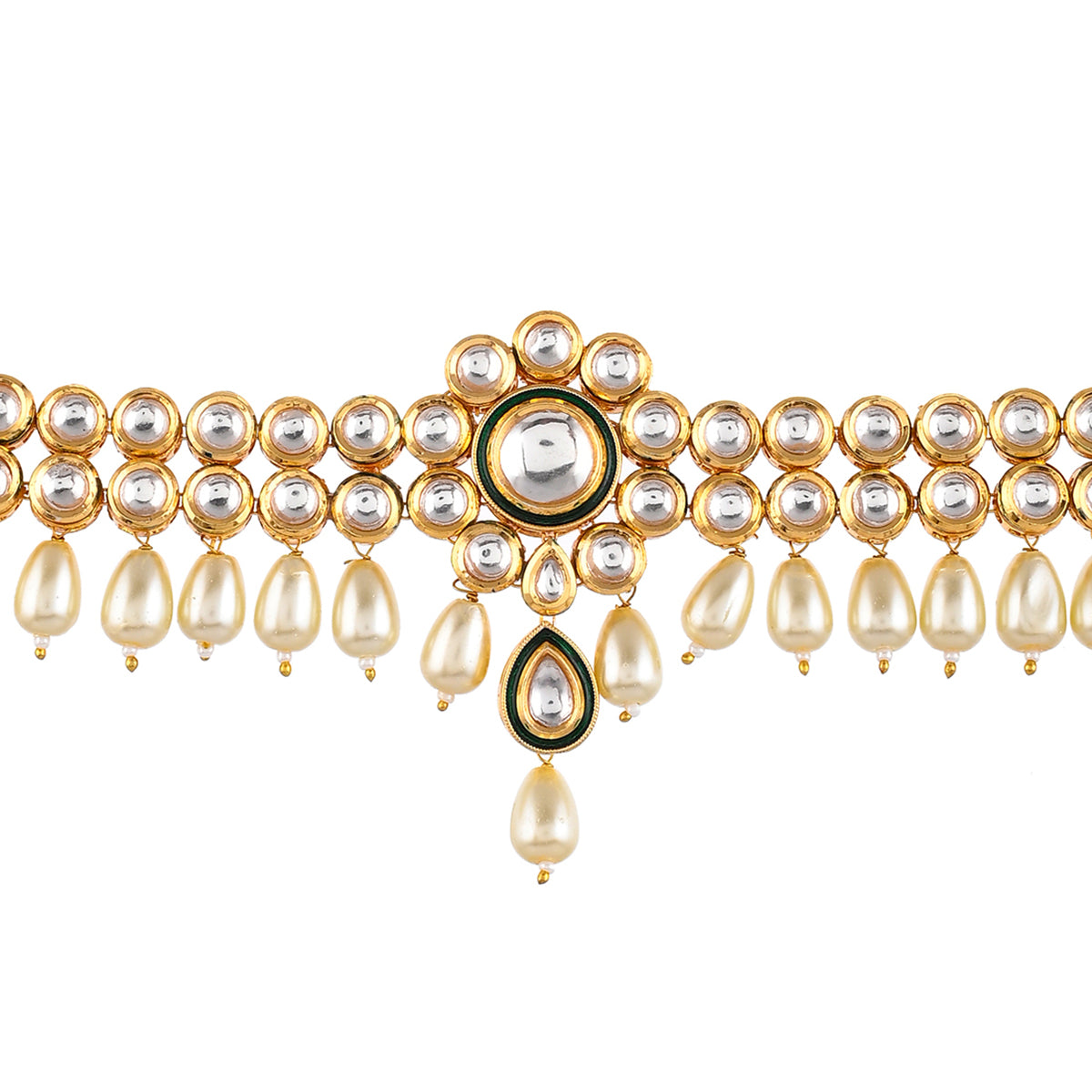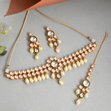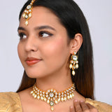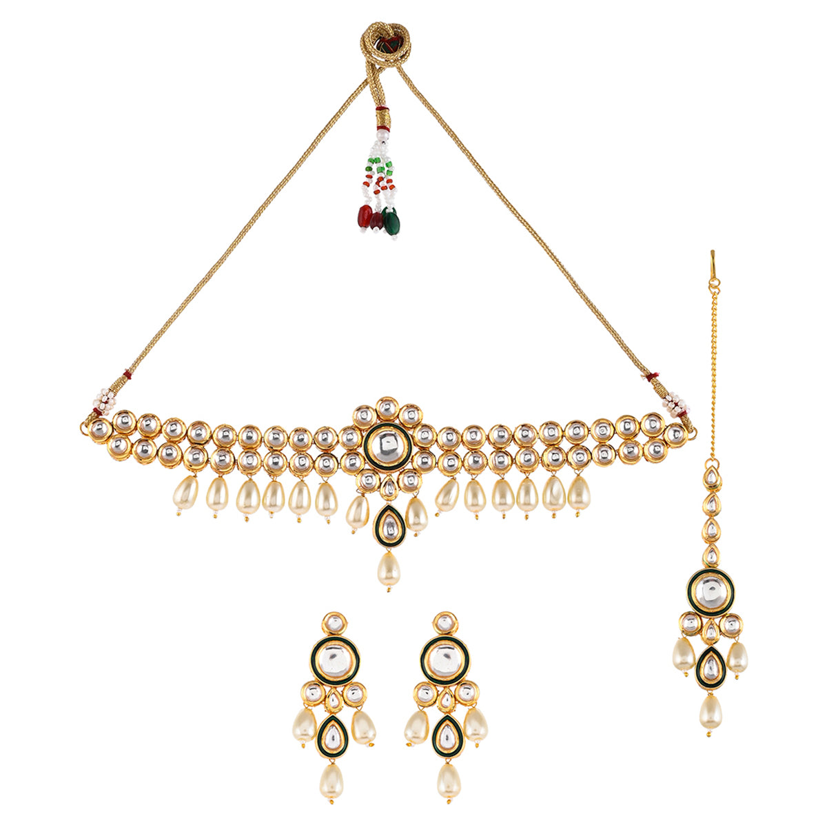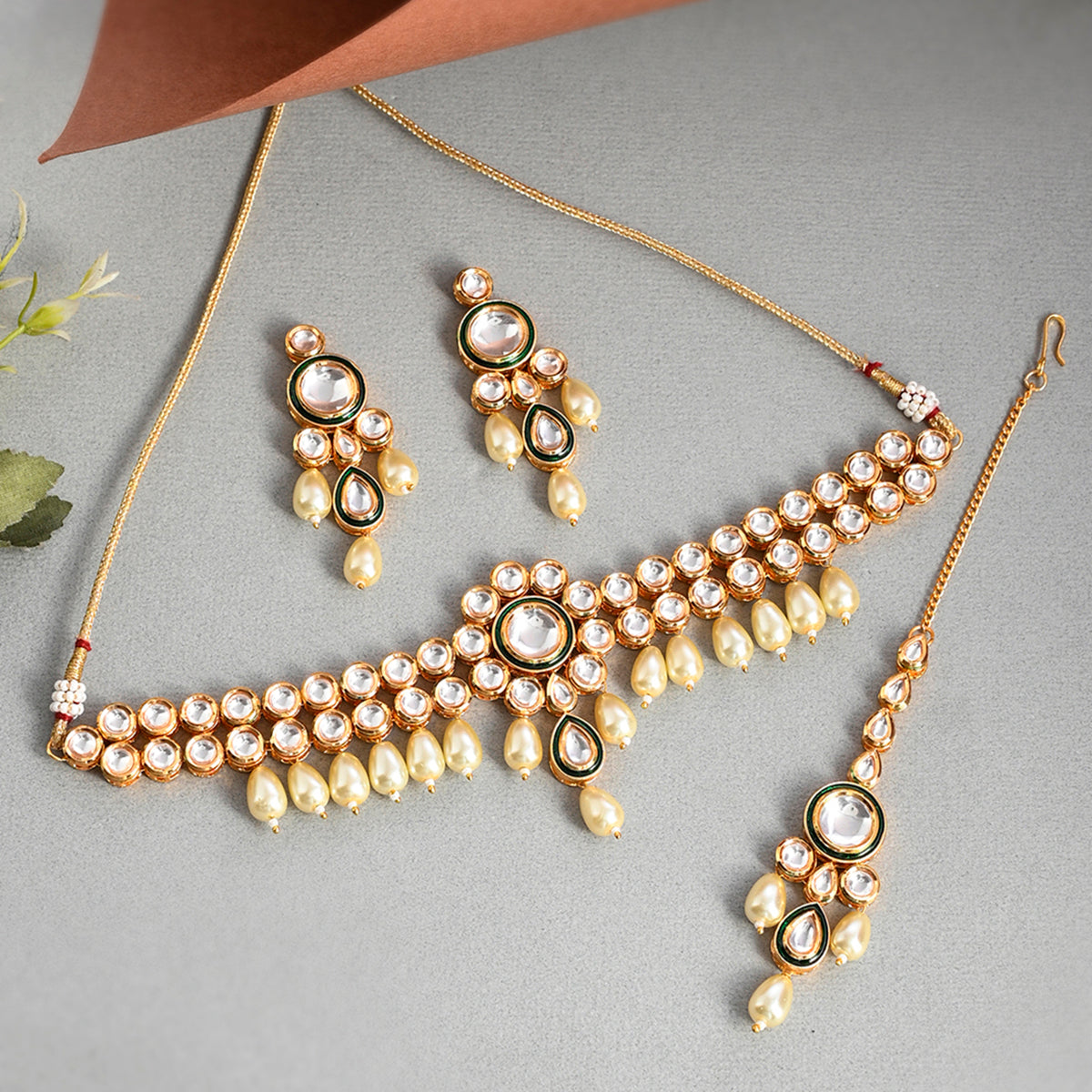 Pearls and kundan gems maang tika set, with yellow gold plating. Made from brass, the choker, earrings and maang tika are lightweight and comfortable. Pair with Indian attire.