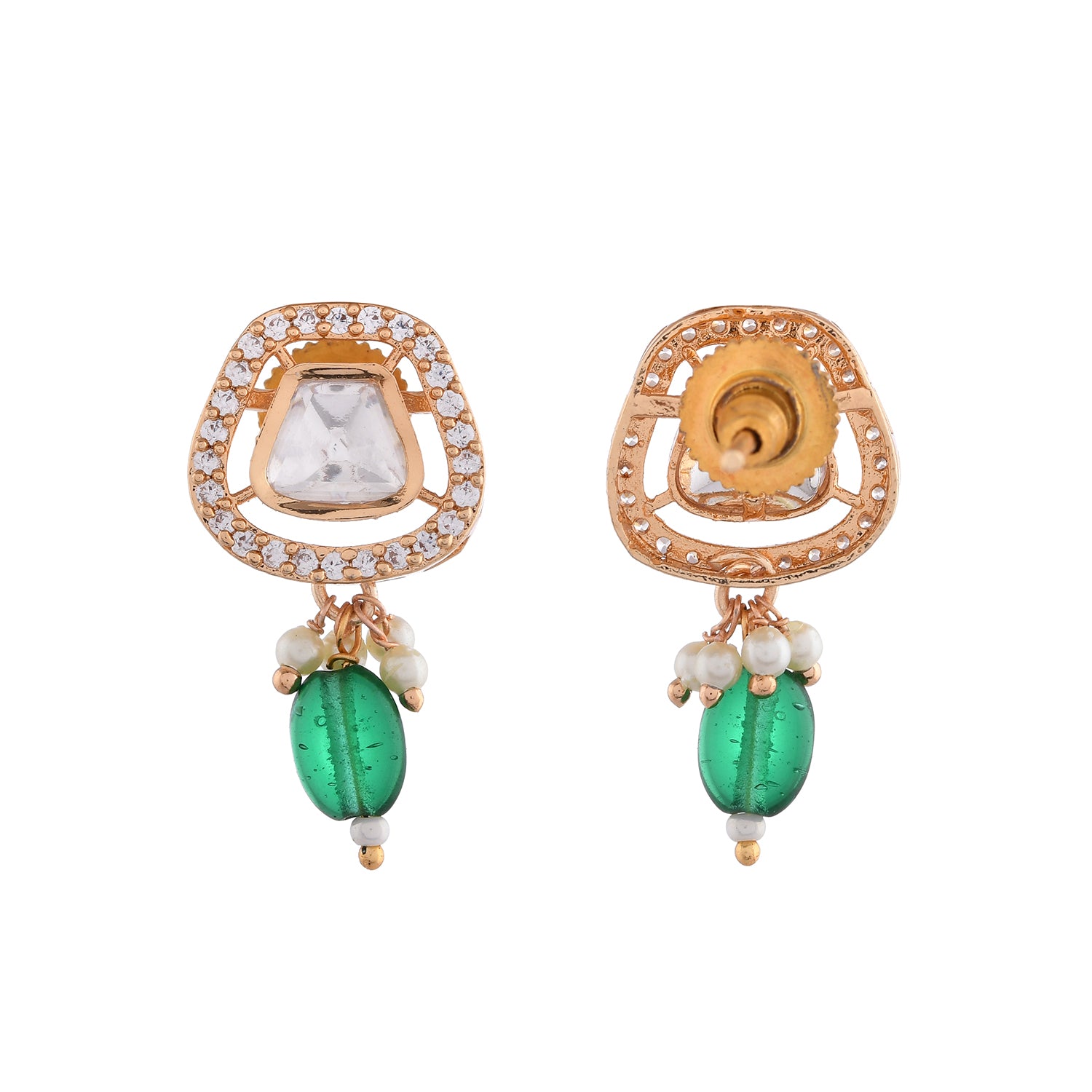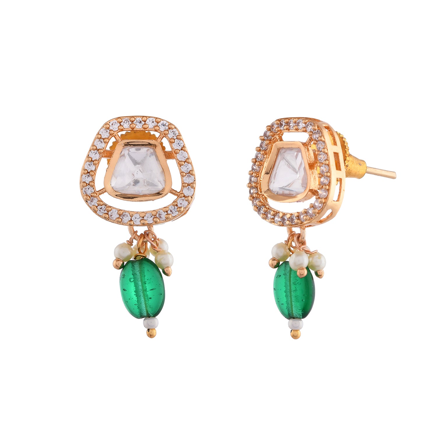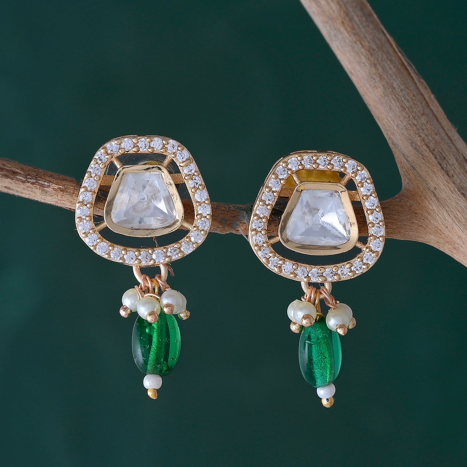 The Noor-e-Baali Drop Earrings are a luxurious addition to the Kundan Elegance collection, crafted with exquisite attention to detail and superior quality. Featuring a striking design with a central American diamond encircled by a halo of smaller diamonds, all set in a richly gold-plated brass base, these earrings are a true masterpiece. The drop element includes elegant green beads and delicate pearl accents, adding a touch of sophistication and charm. Perfect for any occasion, these earrings can be effortlessly styled with both traditional and contemporary outfits, making them a versatile accessory for everyday wear or special events. The rich gold and green color combination exudes a royal and festive vibe, making these earrings an ideal gift for loved ones on occasions like Diwali, Rakshabandhan, Valentine's Day, Christmas, and New Year. Whether for a wedding, cocktail party, or a simple day at work, the Noor-e-Baali Drop Earrings are sure to make a chic and elegant statement.