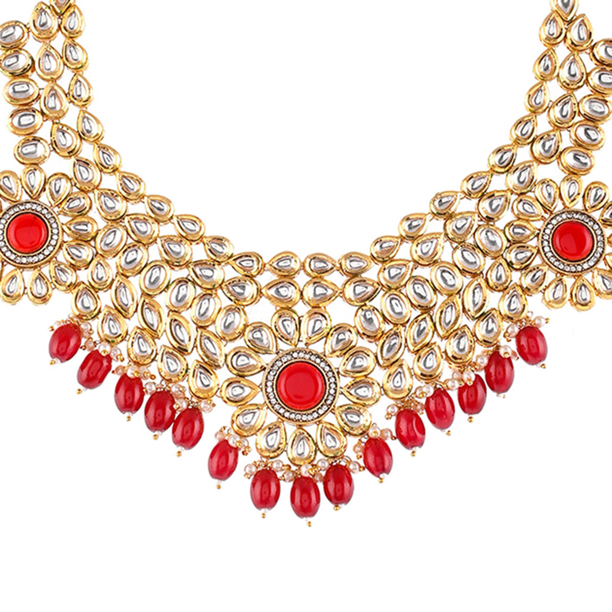 An opulent maang tika set with teardrop cut kundan gemstones. Made from brass and gold plated, the set will make a lovely addition to your jewellery collection.