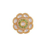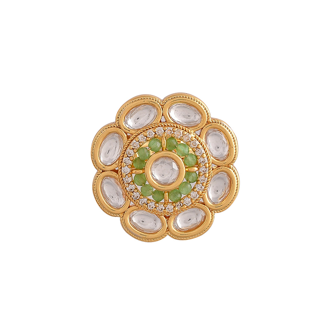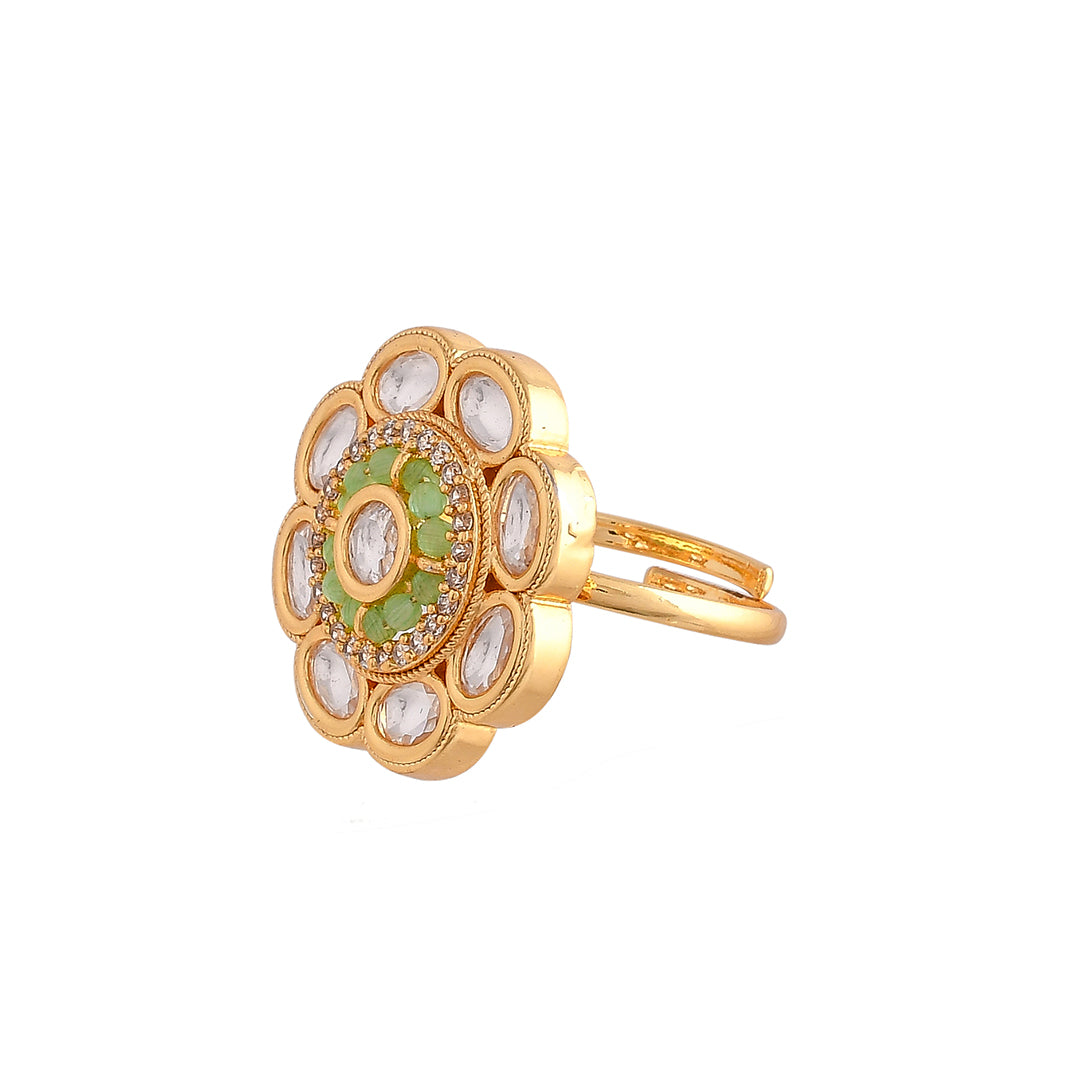 Ethnic style ring made from brass and yellow gold plated. Embellished with oval cut faux kundan gems and green beads. The perfect match for Indian and Indo-Western formal attire.