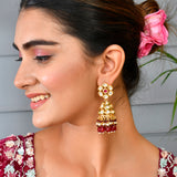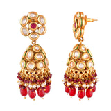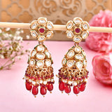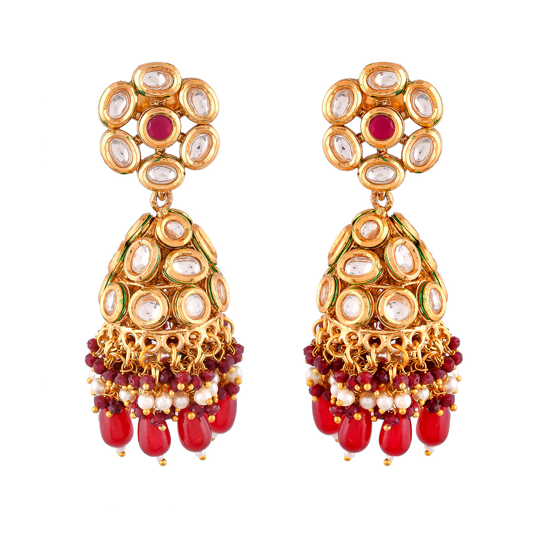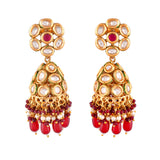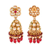 Kundan Elegance Pearl and Red Beads Faux Kundan Jhumka Earrings