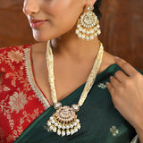 The Rajwada Haar Necklace Set from the Kundan Elegance Collection is a true testament to royal charm and sophistication. This exquisite set is meticulously crafted from high-quality brass and elegantly plated with gold, ensuring durability and a luxurious finish. The necklace features intricate detailing with American diamonds and Kundan work, highlighted by multiple strands and a stunning central pendant. Complemented by matching earrings adorned with delicate pearl drops, this set exudes timeless elegance. The rich gold color and intricate design make it the perfect accessory for festive occasions, weddings, cocktail parties, and everyday wear. Versatile and chic, it pairs beautifully with both ethnic and contemporary outfits, adding a touch of glamour to any ensemble. This elegant piece is also an ideal gift for women on special occasions such as Valentine's Day, Diwali, Rakshabandhan, Christmas, and New Year. Thoughtfully designed and masterfully crafted, the Rajwada Haar Necklace Set is a must-have addition to any jewelry collection, promising to elevate your style and make a lasting impression.