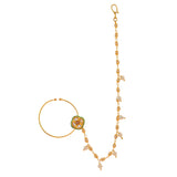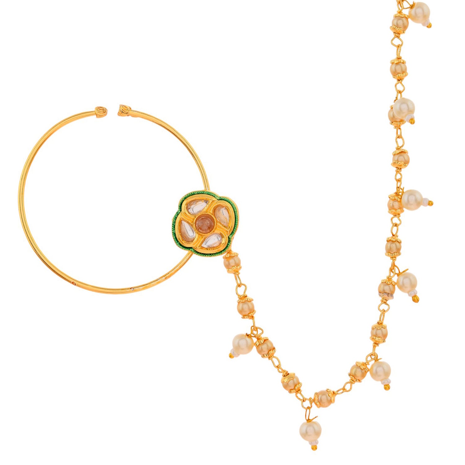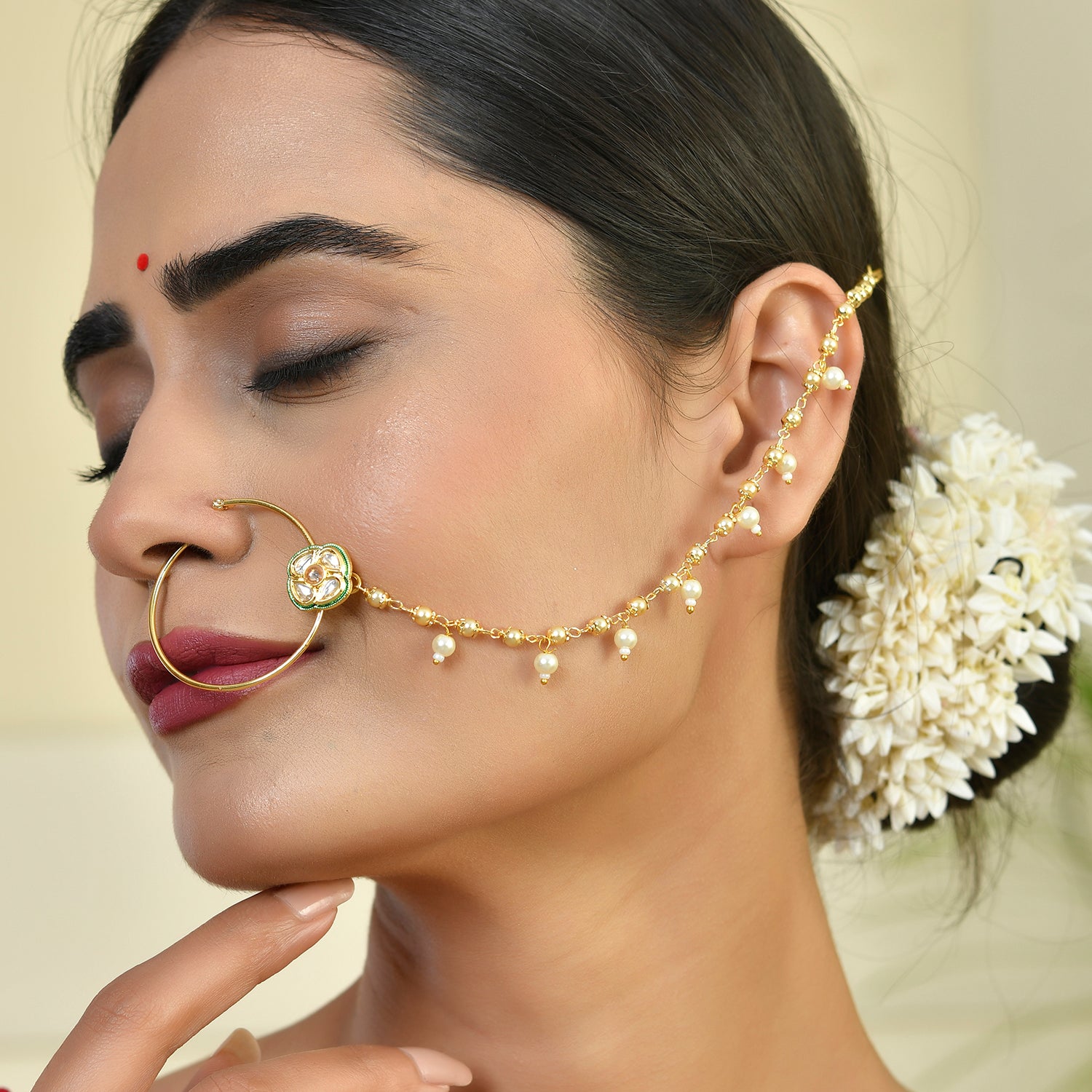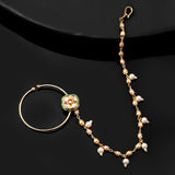 Discover the epitome of grace and sophistication with the Voylla Gold-Plated Brass Nose Ring, a perfect blend of traditional charm and contemporary design. This exquisite piece features a delicate hoop adorned with a beautifully crafted floral motif, accentuated by intricate enamel work in shades of green and pink. The centerpiece is embellished with shimmering American diamonds, adding a touch of sparkle that catches the eye.The nose ring is complemented by an elegant chain, meticulously designed with alternating gold-toned beads and lustrous pearls. Each pearl is carefully placed to create a harmonious balance, making this piece not just a nose ring, but a statement accessory. The chain is finished with a secure hook, ensuring it stays in place while you dazzle at any event.Crafted from high-quality brass and plated with gold, this nose ring is perfect for festive occasions, weddings, and parties. It also makes a thoughtful gift for women, whether for Valentine's Day, Diwali, Rakshabandhan, or Christmas. Celebrate the special women in your life—be it your sister, girlfriend, wife, or mother—with this timeless piece of jewelry.