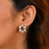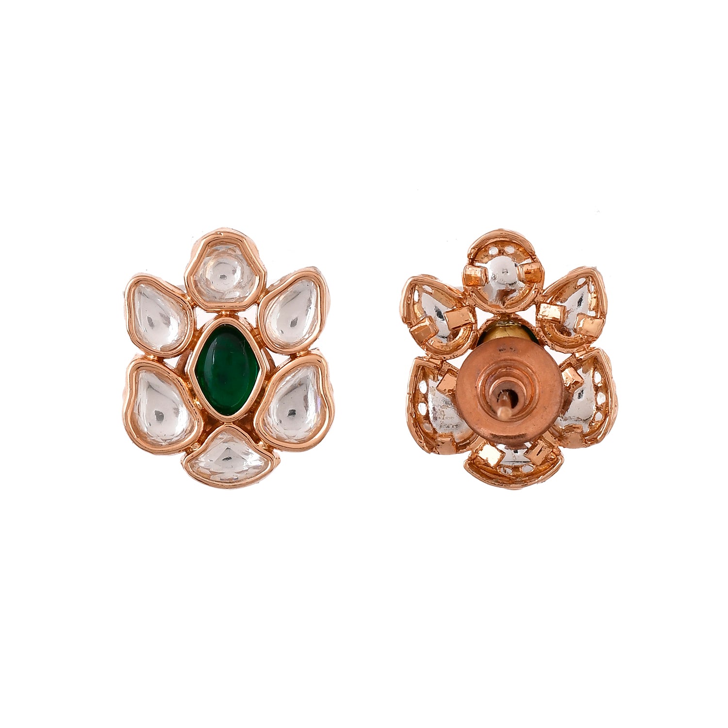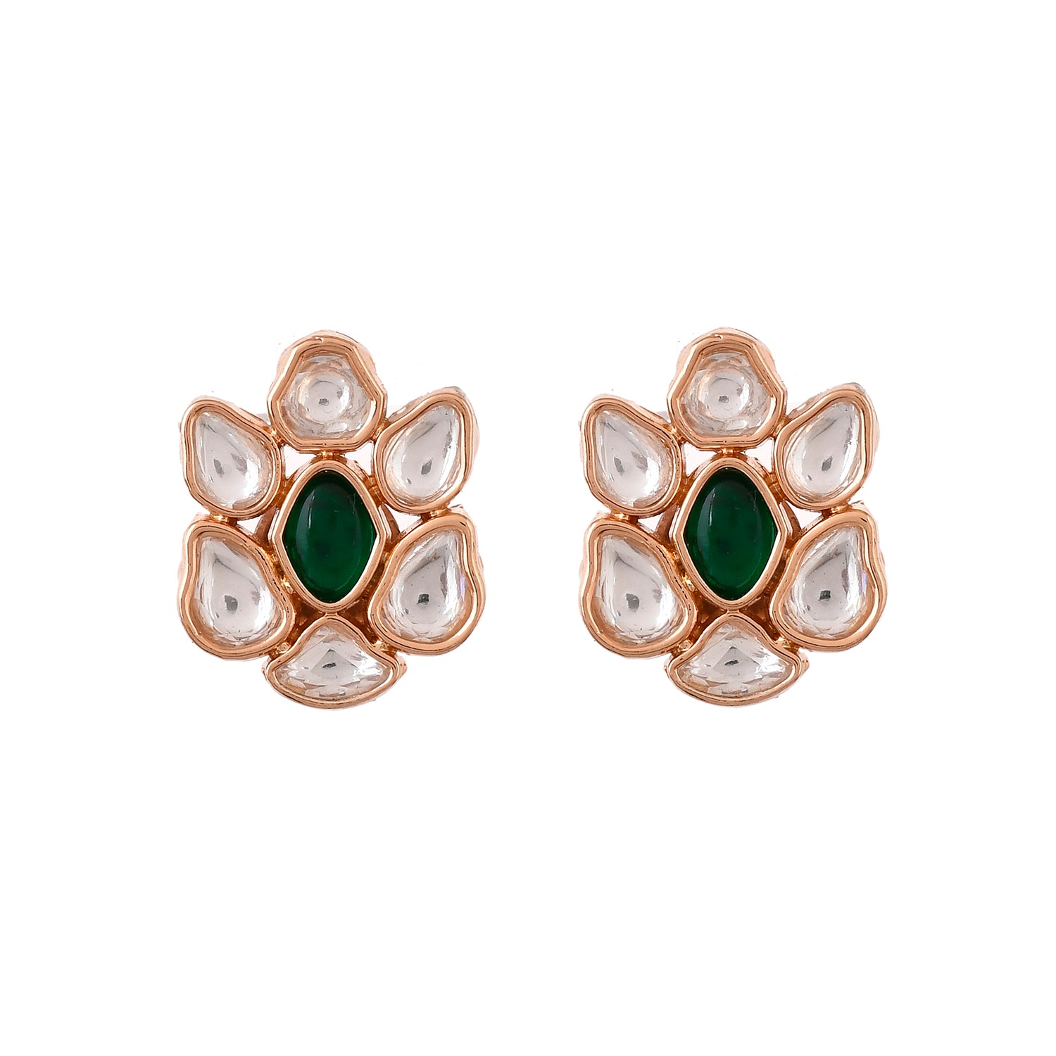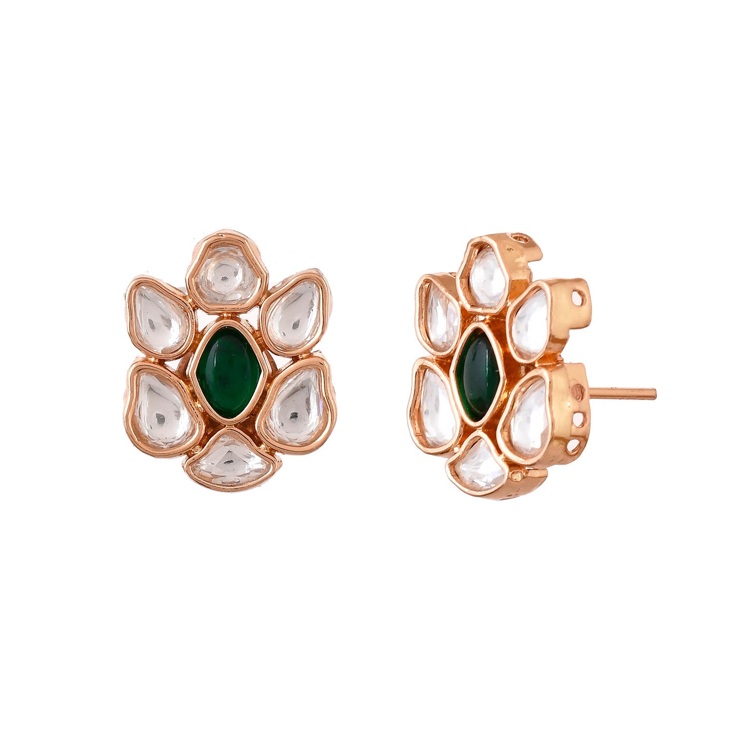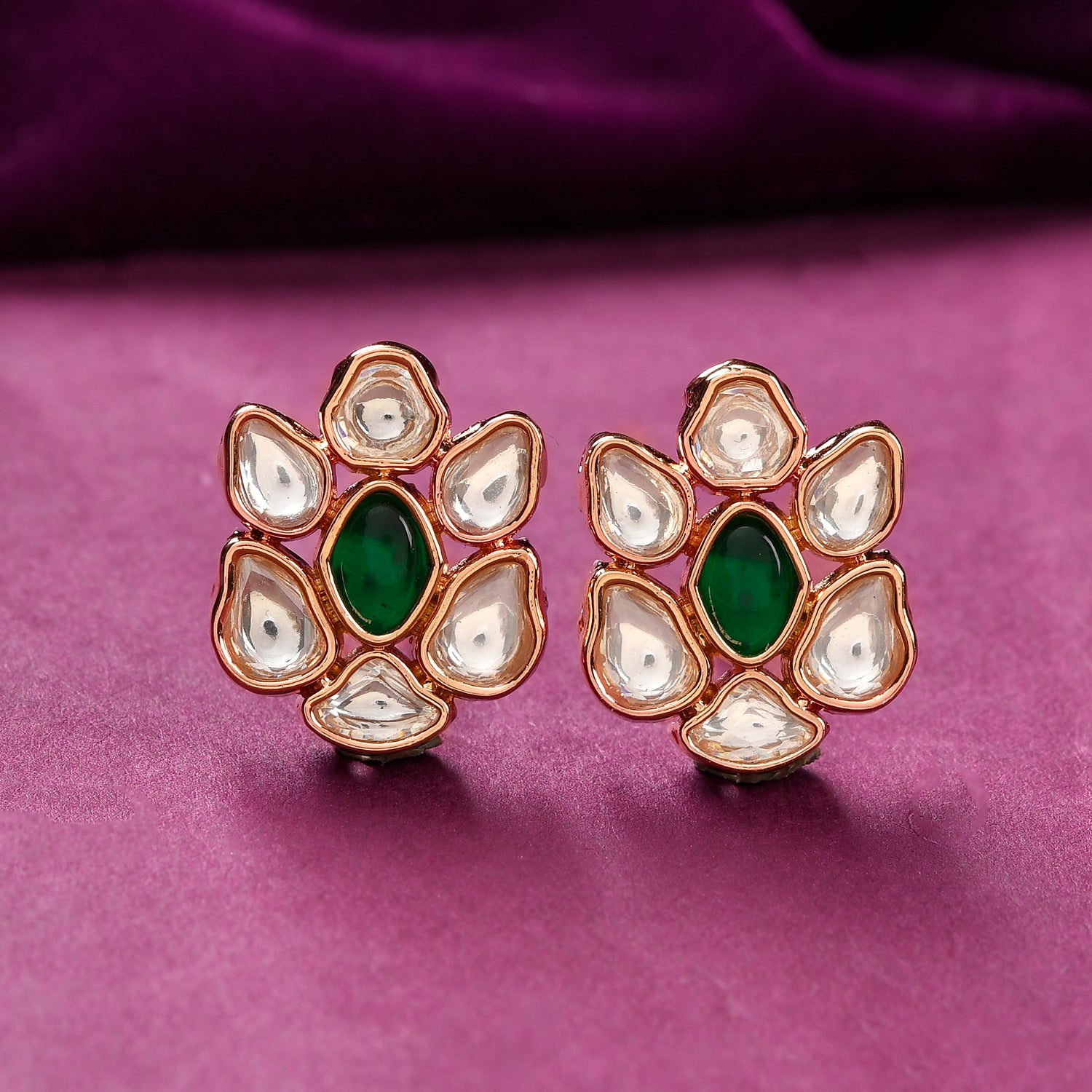 Adorn yourself with the luxurious Royal Emerald Studs, designed to captivate with their intricate detailing and timeless elegance. These earrings feature a central green oval-shaped stone surrounded by six clear, teardrop-shaped stones set in a gold-colored frame, creating a stunning floral motif. Part of the Kundan Elegance collection, these studs are crafted from high-quality brass with a gold plating, ensuring both durability and a luxurious finish. Perfect for weddings, festive occasions, or simply to add a touch of royalty to your everyday look, these earrings are versatile and elegant. Pair them with traditional attire for a classic look, or with modern outfits for a unique blend of tradition and contemporary style. They make an exquisite gift for loved ones on occasions like Diwali, Raksha Bandhan, Valentine's Day, and more, bringing joy and elegance to any special moment.
