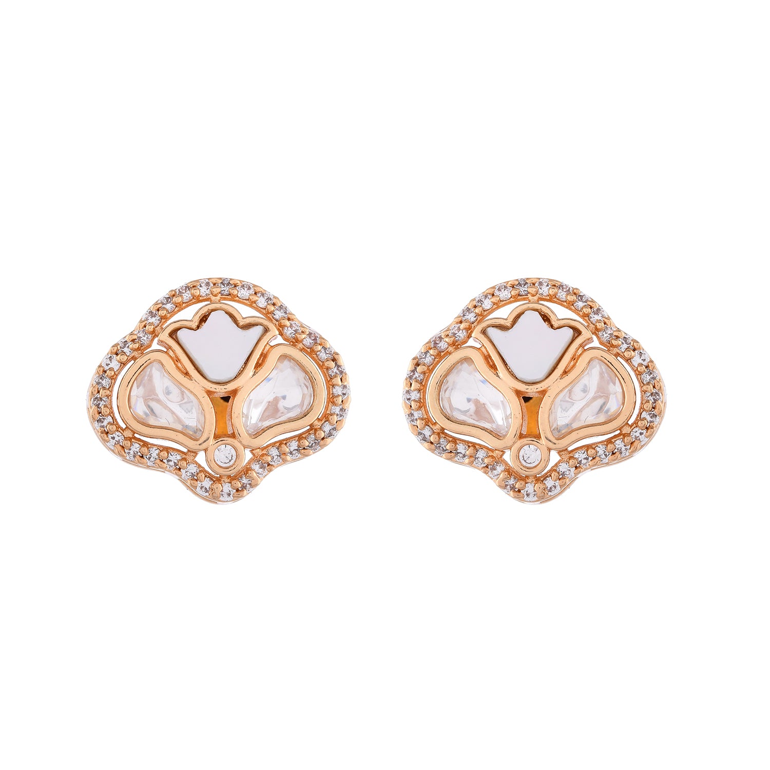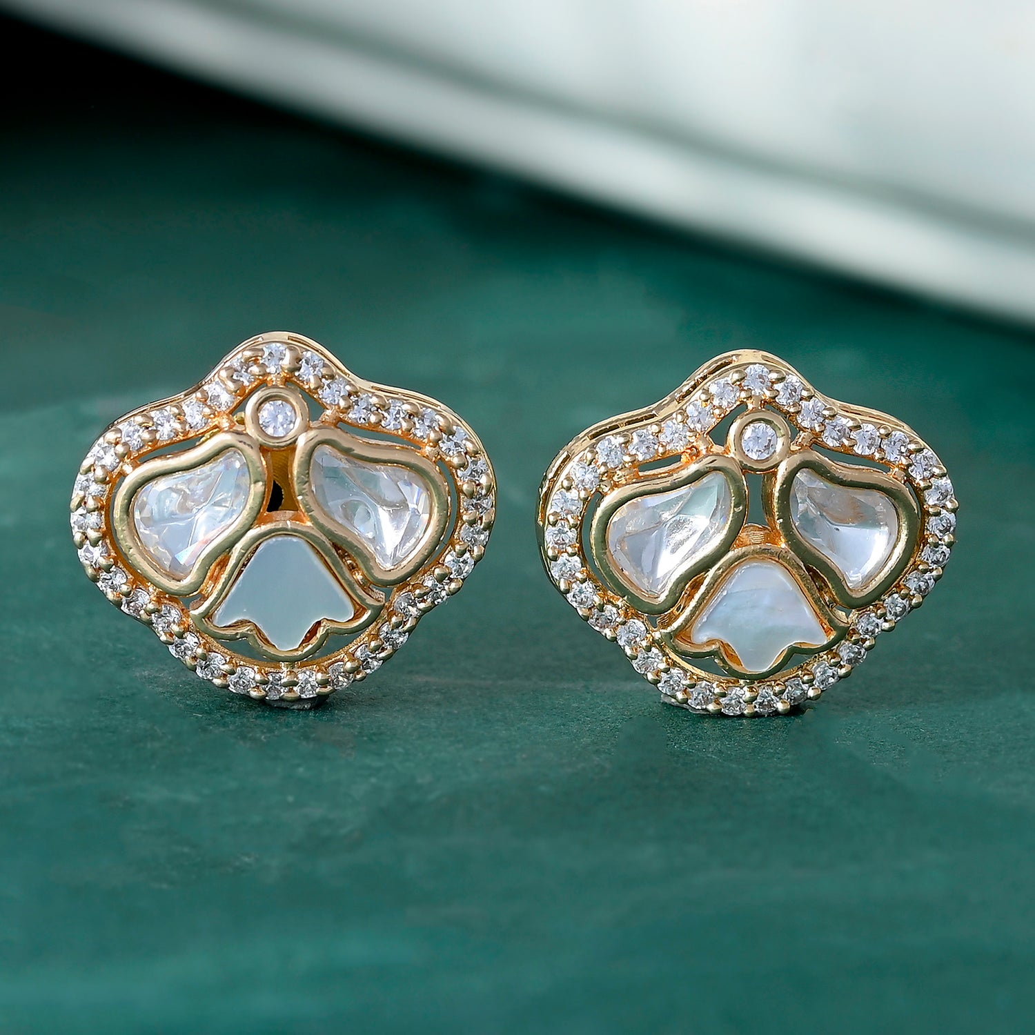 The Sundari Stud Earrings from the Kundan Elegance Collection are a timeless blend of classic allure and modern sophistication. Made from high-quality brass and elegantly plated with gold, these earrings are designed to radiate luxury and durability. The intricate heart-shaped motif is adorned with sparkling American diamonds, meticulously set to create a dazzling halo effect that catches the light beautifully. These versatile earrings are perfect for elevating everyday looks or adding a touch of elegance to festive occasions, parties, and weddings. The warm gold plating complements various outfits, enhancing both traditional and contemporary ensembles. Whether you're looking for the perfect gift for Valentine's Day, Diwali, Rakshabandhan, Christmas, or New Year, the Sundari Stud Earrings make an excellent choice for girlfriends, wives, mothers, sisters, or any woman you cherish. These earrings embody elegance and grace, making them a cherished addition to any jewelry collection.