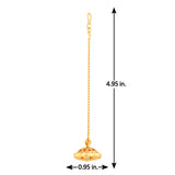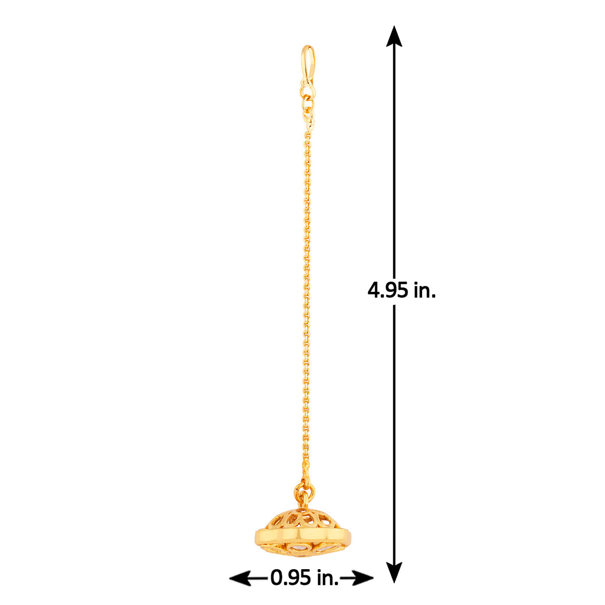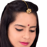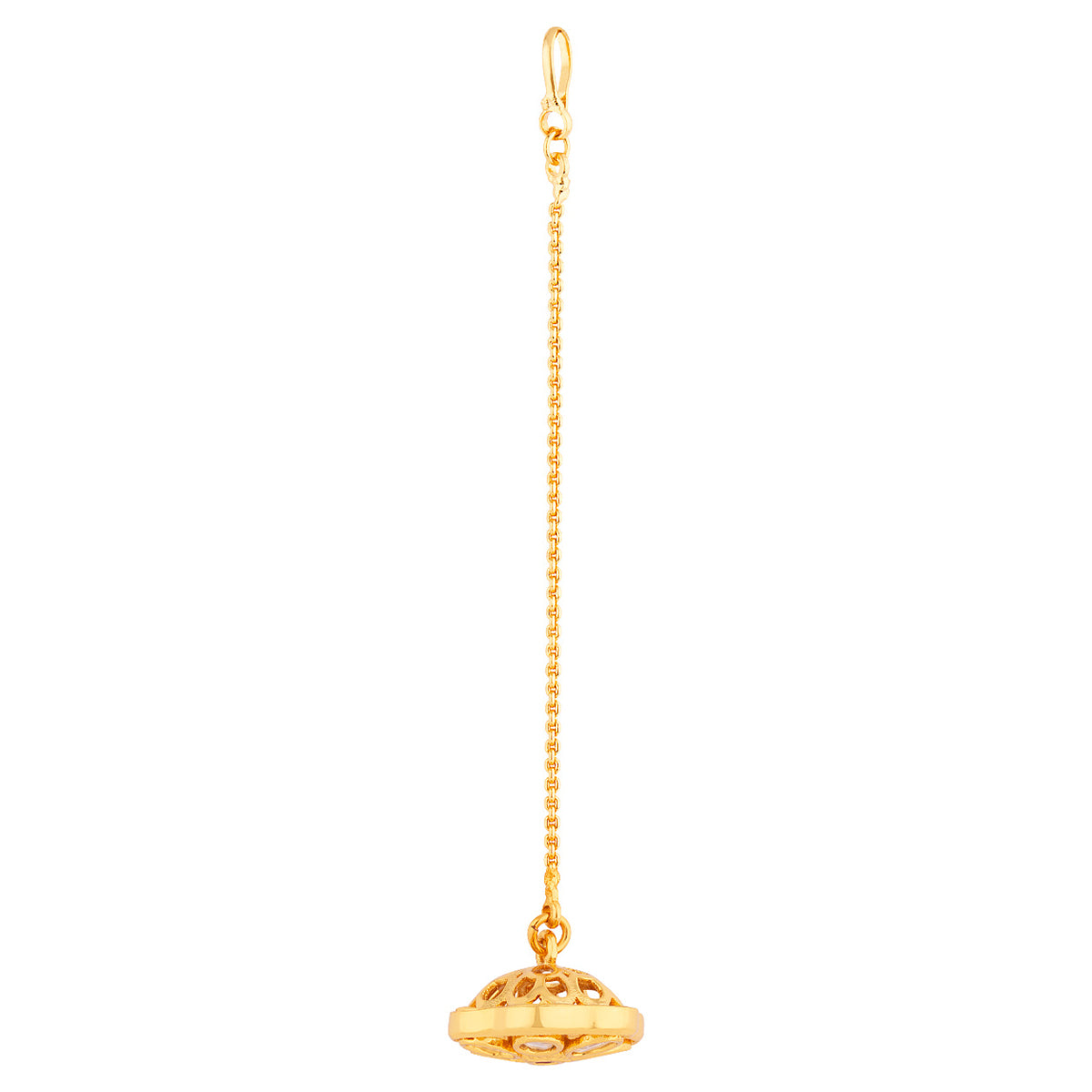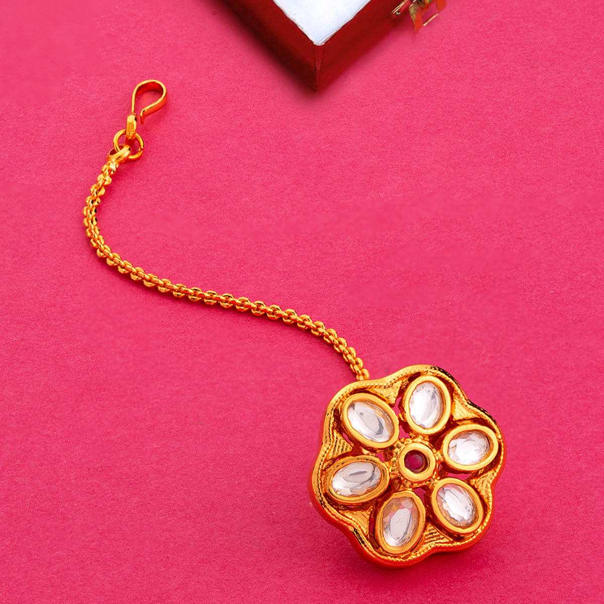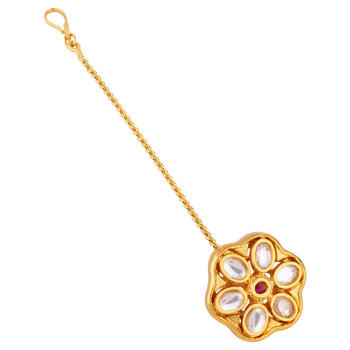 Traditional maang tika made from brass. Yellow gold plated and studded with faux kundan. Pair with ethnic attire.