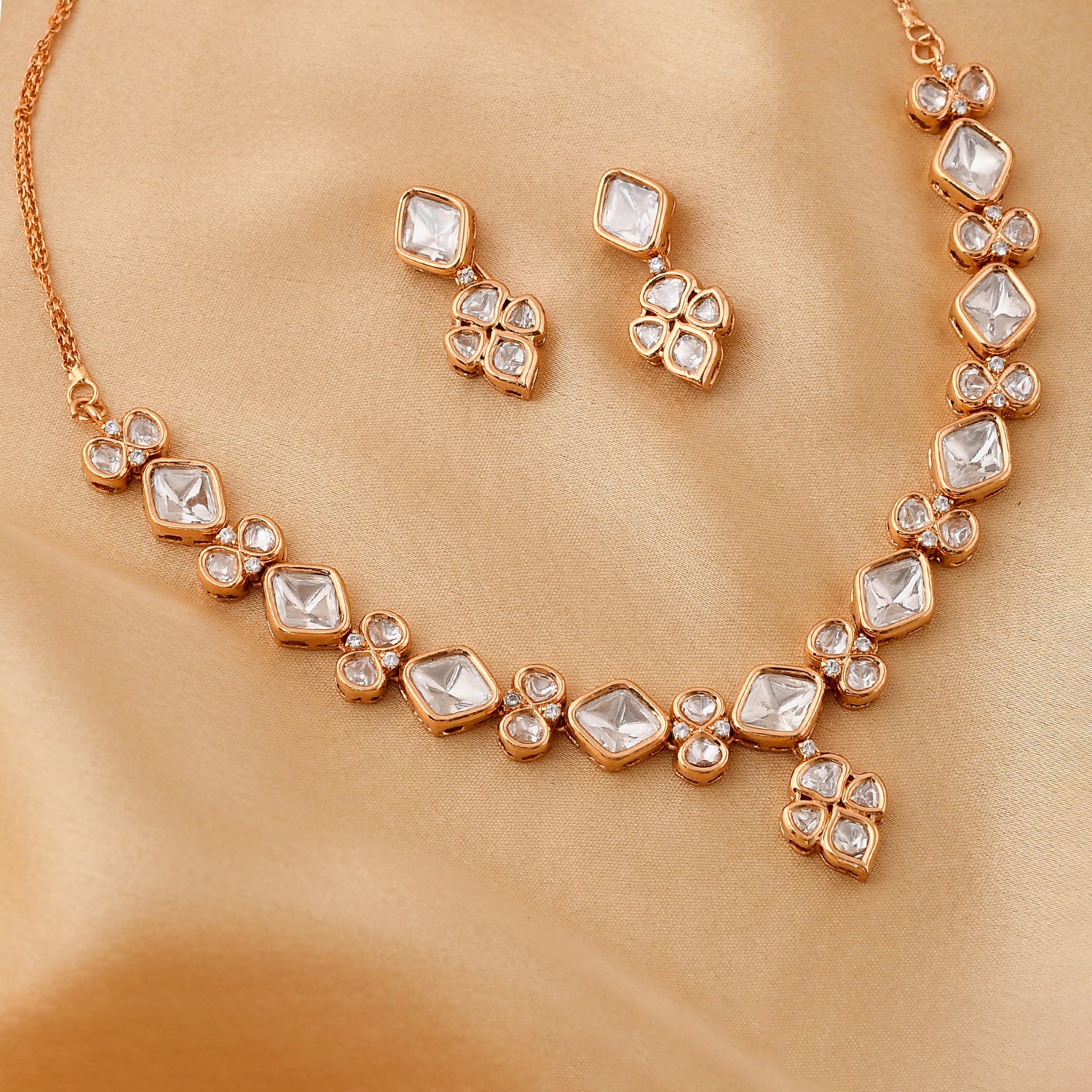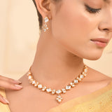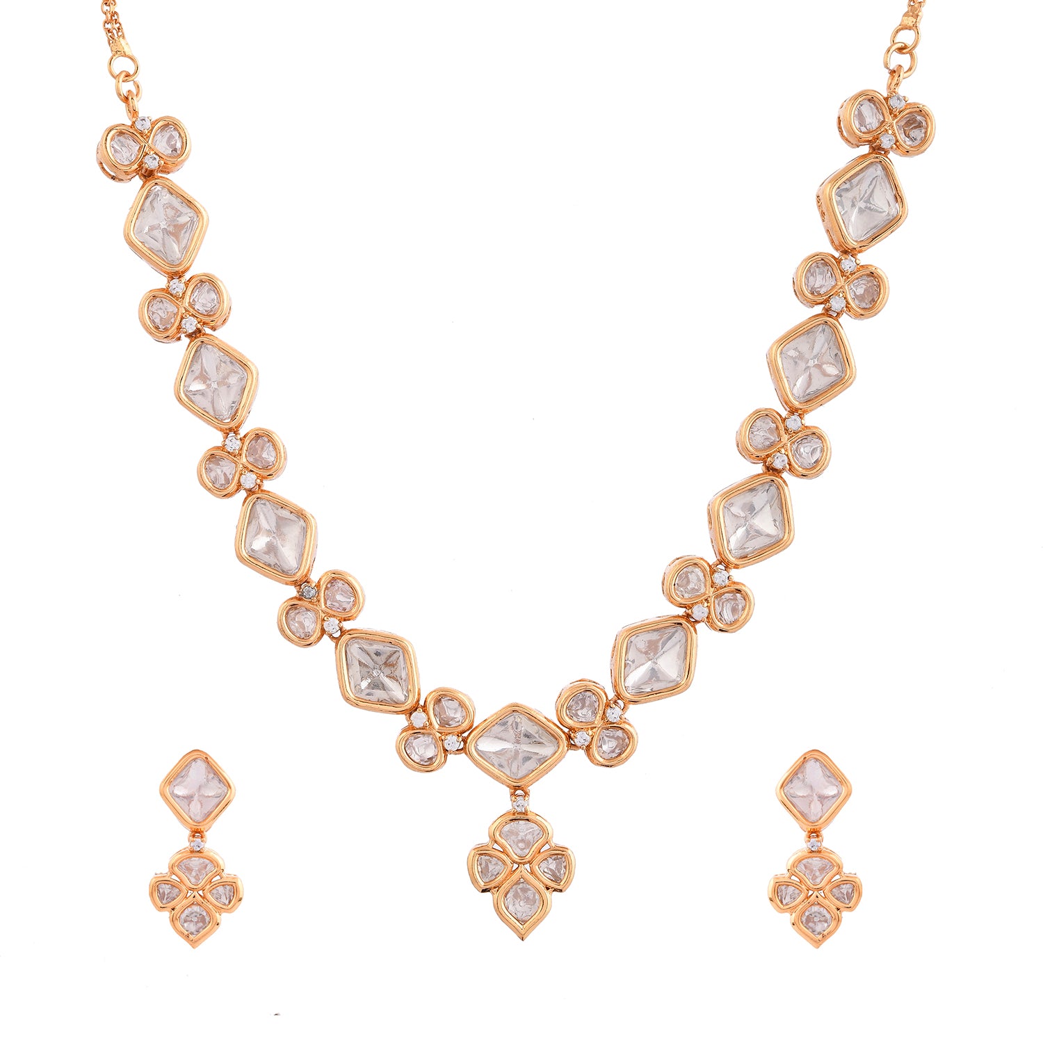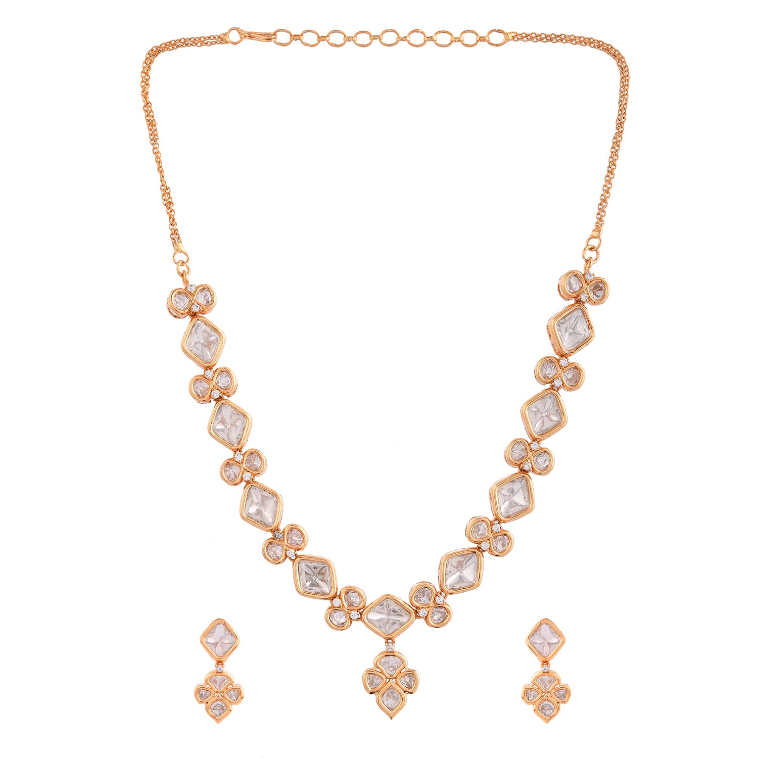 Immerse yourself in the opulence of traditional Indian craftsmanship with this exquisite necklace set by Voylla. Crafted from high-quality brass and adorned with an impeccable gold plating, this set is a harmonious blend of heritage and modernity. The intricate arrangement of Kundan stones, complemented by the scintillating sparkle of American Diamonds, creates an enchanting silhouette that gracefully adorns the neckline. The design seamlessly weaves together geometric symmetry and delicate floral motifs, making it a versatile choice for both Wedding Wear and Party Wear. Whether you’re celebrating Diwali, Rakshabandhan, or any festive occasion, this necklace set is a symbol of elegance and love. Gift it to your beloved sister or mother, and let its Cubic Zirconia elements add allure to every moment. It’s not just jewelry; it’s a keepsake that resonates with festivity and timeless beauty.