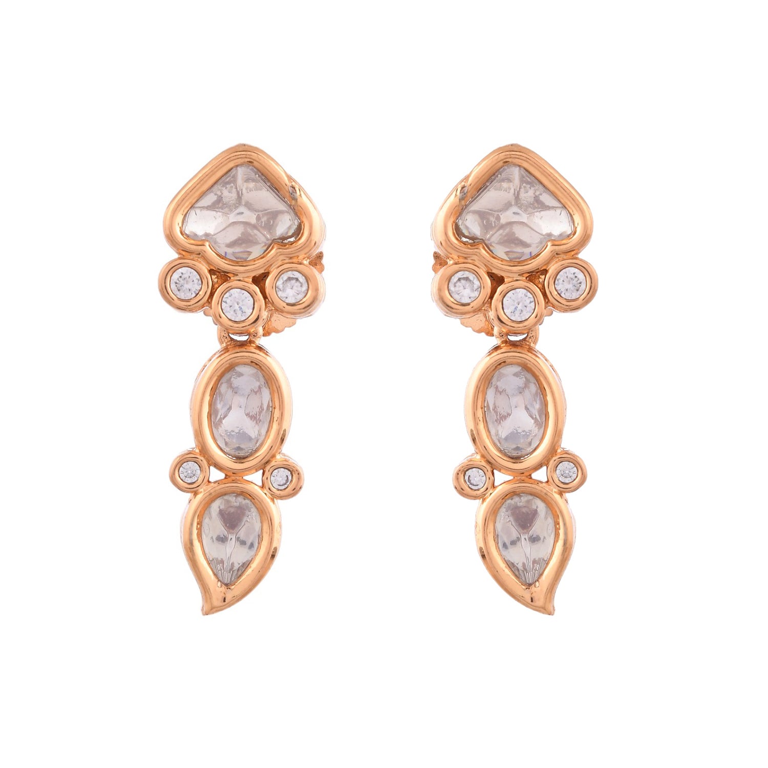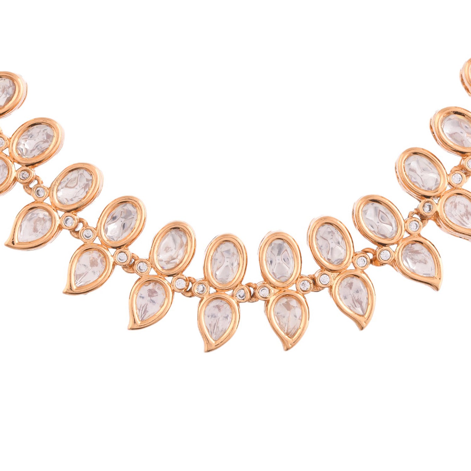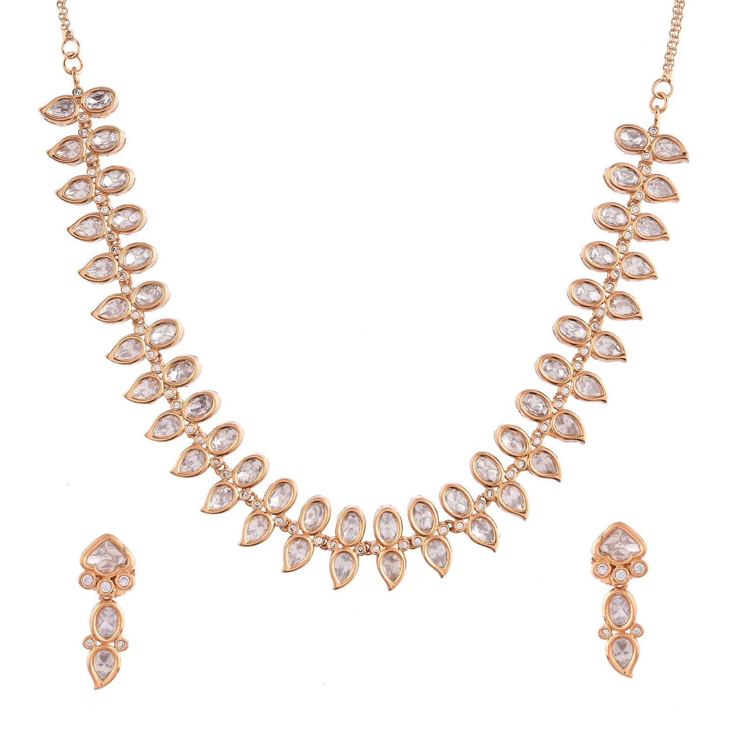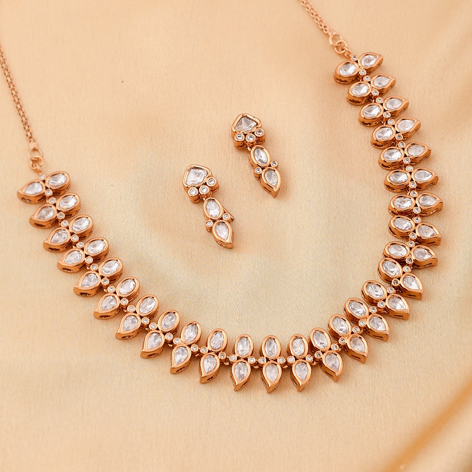 Crafted meticulously from high-quality brass, this set is a true reflection of traditional artistry and modern sophistication. The necklace features a mesmerizing arrangement of teardrop-shaped Kundan stones, which are carefully set in a lustrous gold-plated base. Each stone is accentuated with sparkling American diamonds, adding a layer of brilliance that catches the eye from every angle. Whether you're dressing up for a wedding, party, or festive celebration, this set effortlessly elevates your ensemble, ensuring you stand out in the crowd. The lightweight design ensures that you can adorn this set for extended periods without any discomfort, making it perfect for long events such as weddings, poojas, or festive gatherings. The gold plating adds a layer of opulence, making the set a perfect choice for special occasions like Diwali, Rakshabandhan, or even as a Rakhi gift for your sister or mother. The radiant combination of Kundan and American diamonds makes this set an ideal gift for women who appreciate fine craftsmanship and timeless elegance