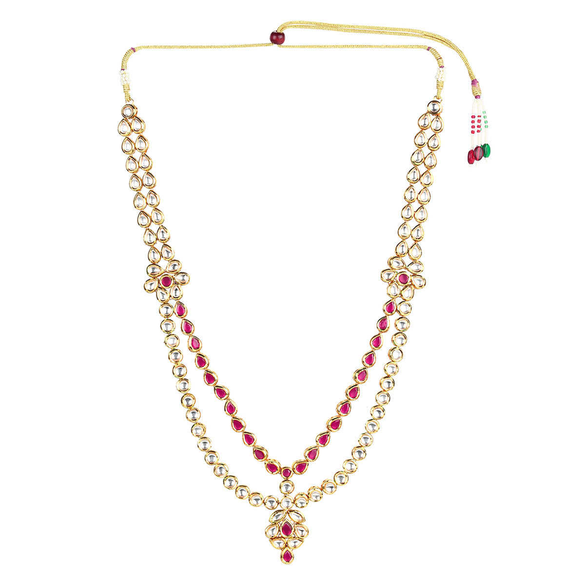 Showcase your traditional style with this 2 layered designer necklace set studded with kundan stones. Club this hair accessory with your ethnic or Indo-western attire.Weight (Gms): 68Size (LxW)(Inch): 13*3.4Material: BrassPlating: Yellow GoldColor: GoldSales Package: Product Code: 8905124453546