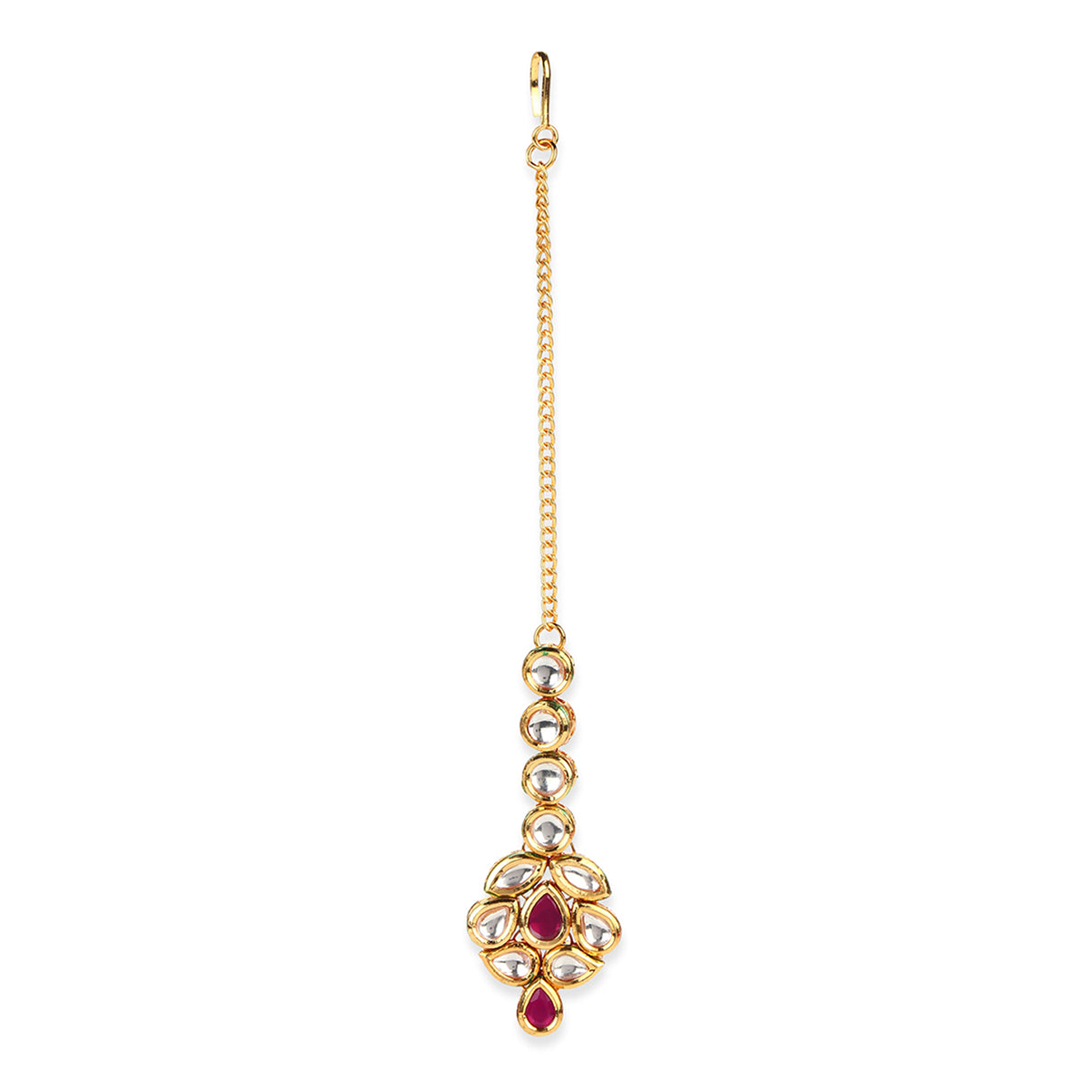Teardrop cut kundan gems maang tika set. Made from brass and gold plated. Pair with Indian attire.Caring for your fashion jewelry: We, at Voylla, take care of every piece of jewelry so that you don't spend hours caring for them....
