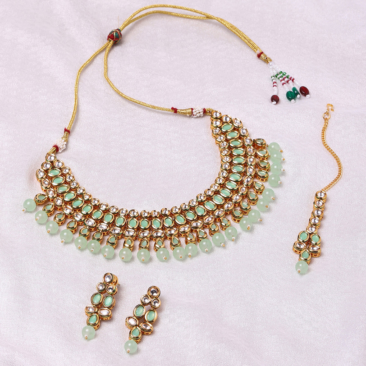 Kundan Gold Plated Mint Green Tumble Beads Necklace Set