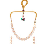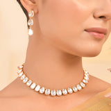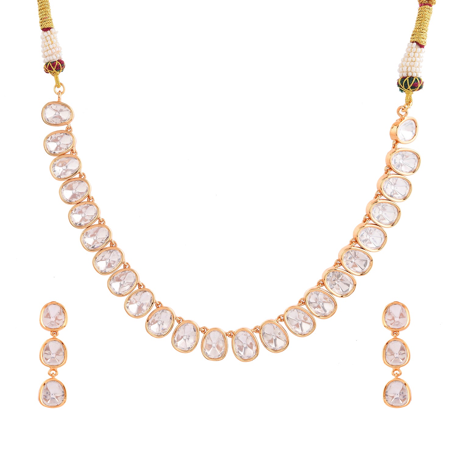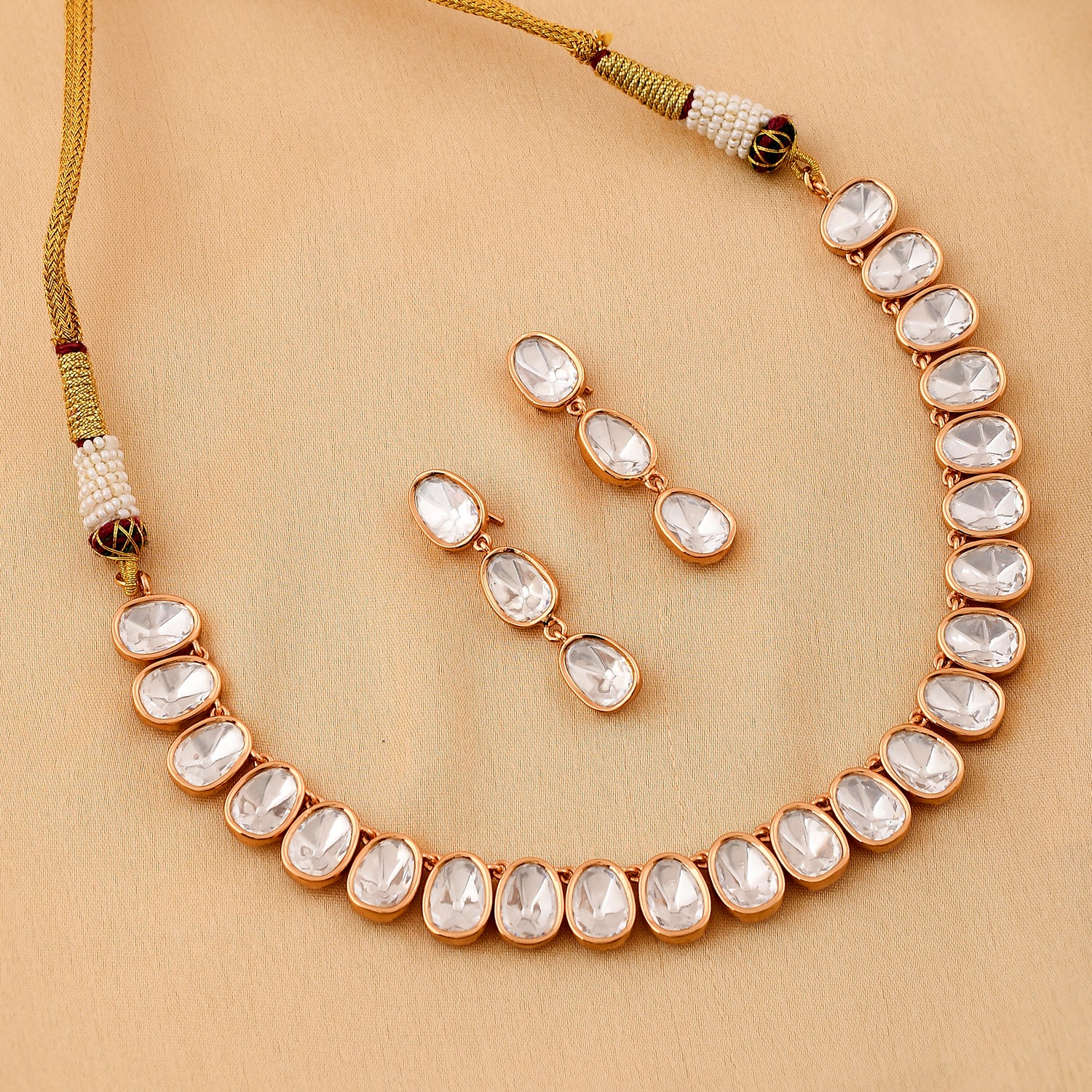 Crafted from high-quality brass, the necklace features intricate gold plating that exudes opulence. The focal point of this design lies in the meticulously arranged Kundan stones and American Diamonds, which create a mesmerizing interplay of light and color.The Kundan work, with its rich heritage, adds an authentic touch to the piece.The American Diamonds, with their brilliant sparkle, enhance the overall allure, making this necklace set perfect for both special occasions and everyday wear. Whether you’re attending a wedding, celebrating Diwali, or participating in a Pooja ceremony, this necklace set complements your ensemble flawlessly. It’s a thoughtful gift for your sister, mother, or any woman who appreciates timeless beauty. And during Rakshabandhan, consider it as a heartfelt Rakhi gift—a symbol of your love and affection.
