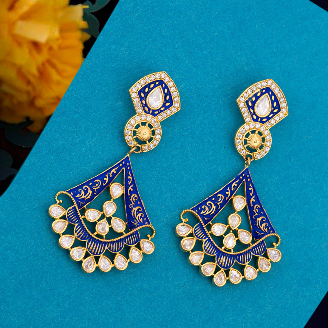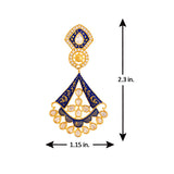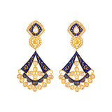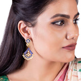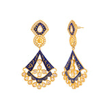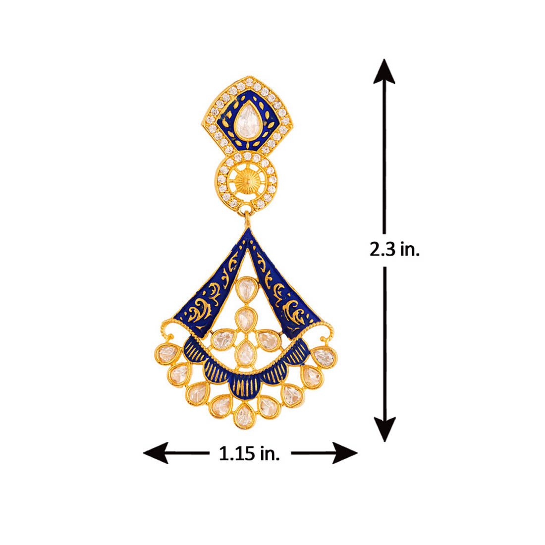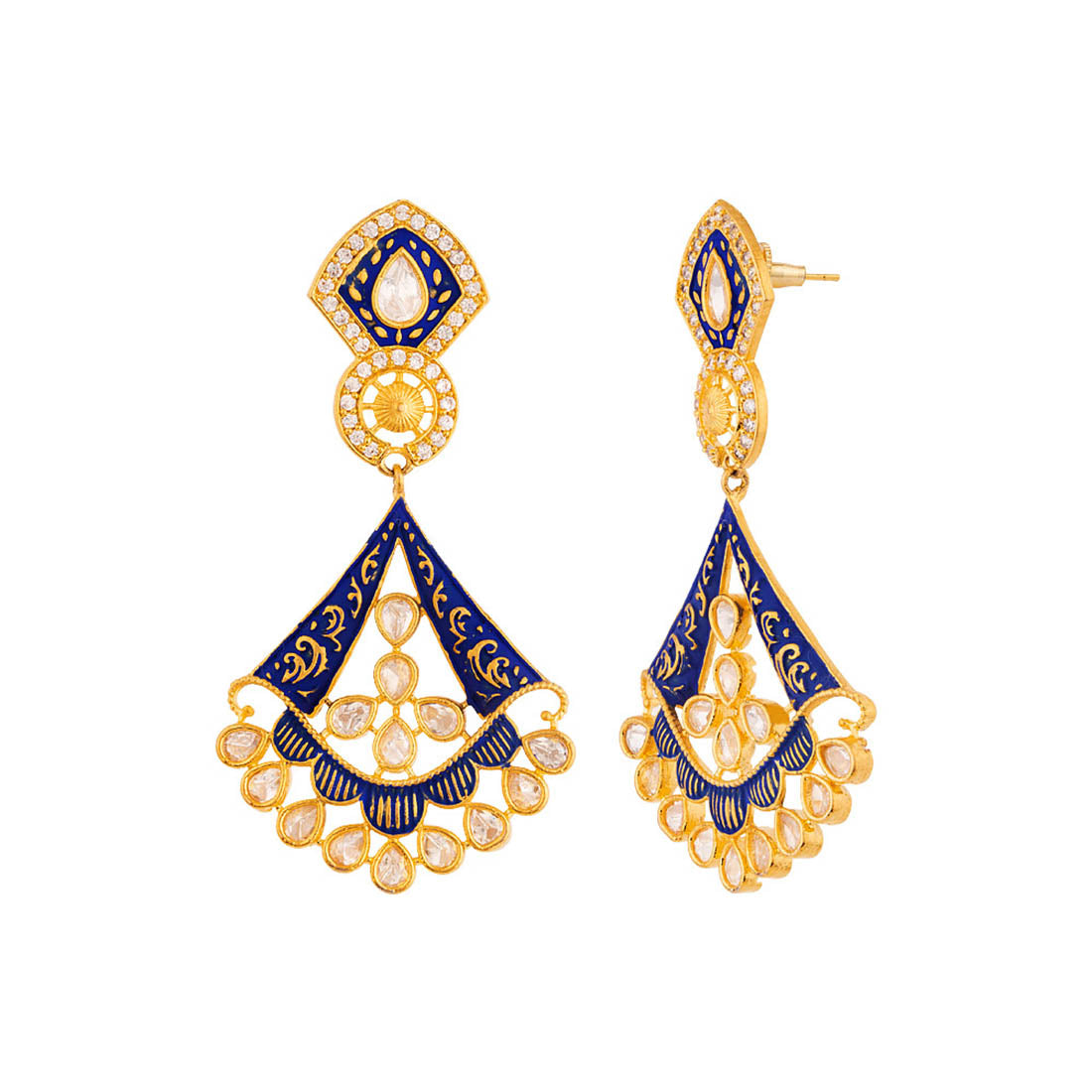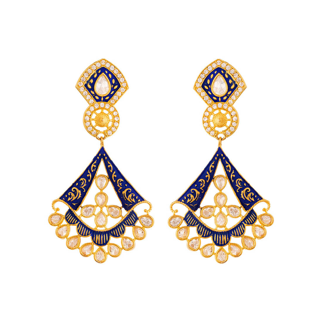 Enameled drop earrings fashioned out of brass. Faux kundan gems adorned and yellow gold plated. Wear with a traditional saree.
