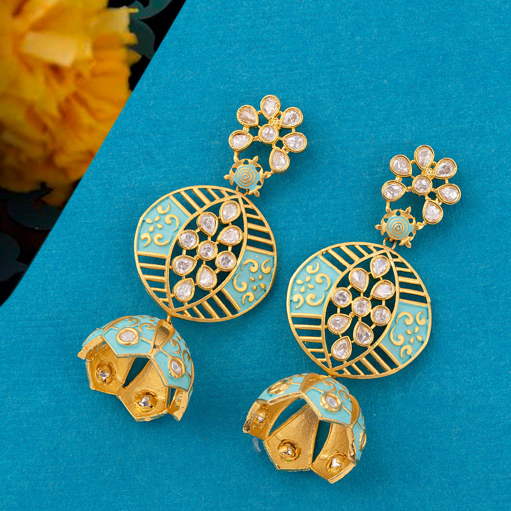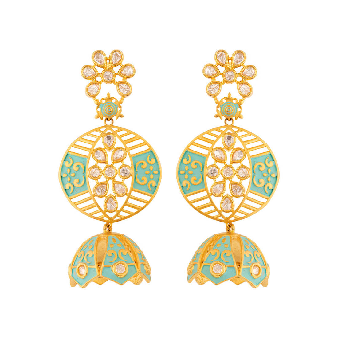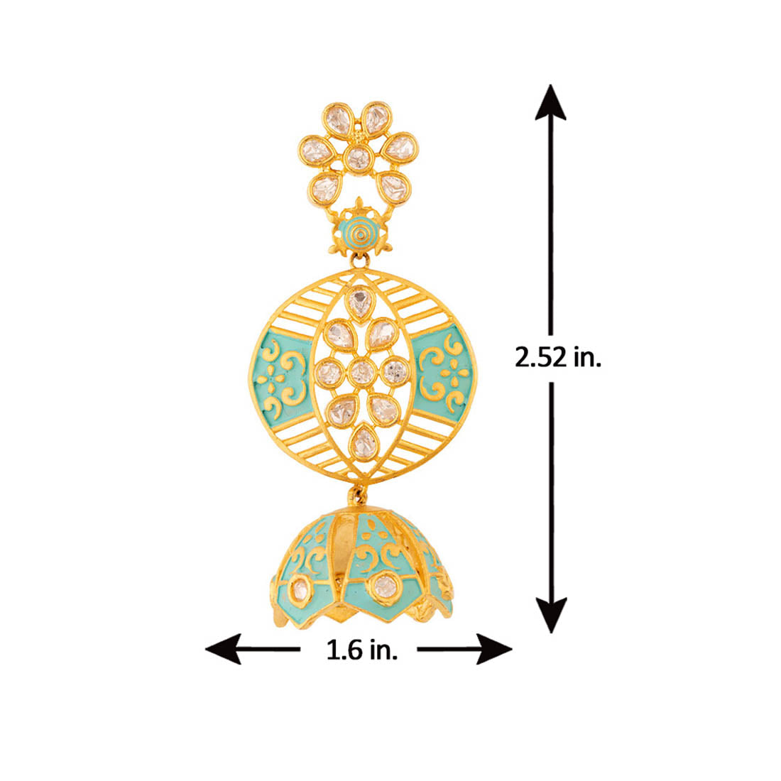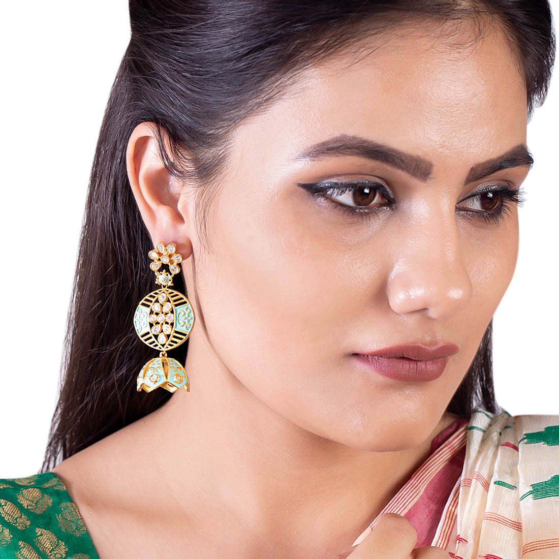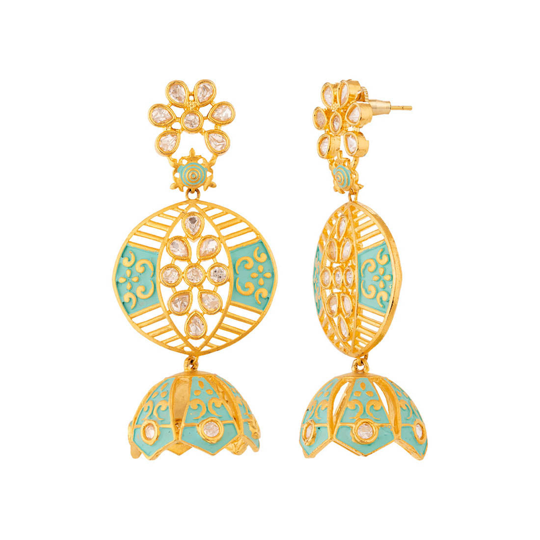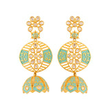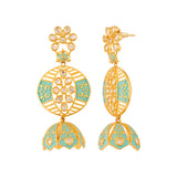 Brass floral motifs drop earrings with yellow gold plating. Enameled and embellished with faux kundan gems. Pair with Indian attire.