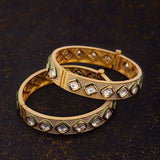 Antique inspired bangles with faux kundan gems. Yellow gold plated and made from brass. Pair with a silk saree.