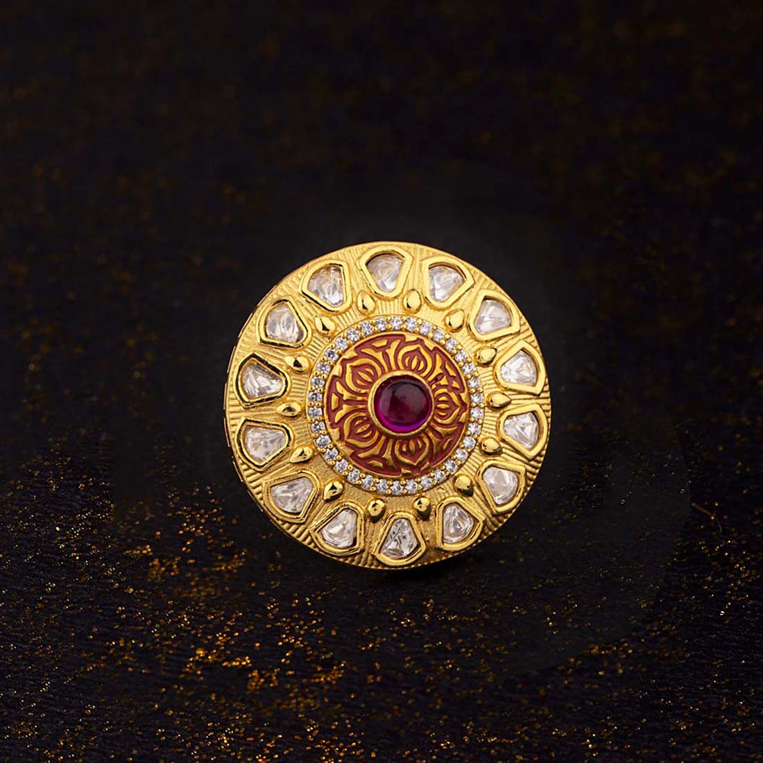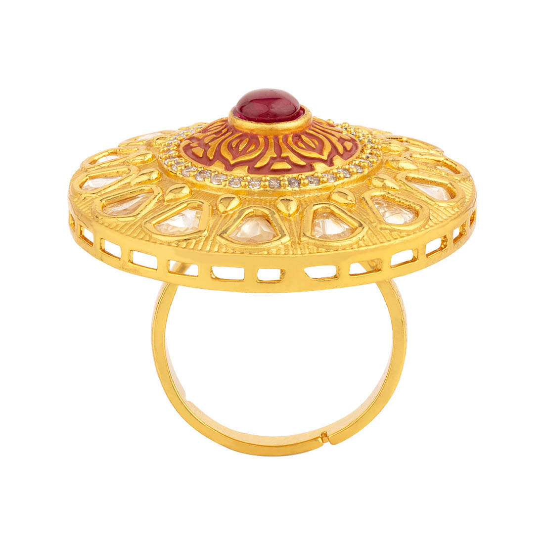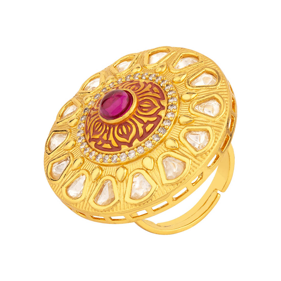 Dome style statement ring with yellow gold plating. Made from brass and embellished with faux kundan gems. Pair with a traditional saree.