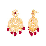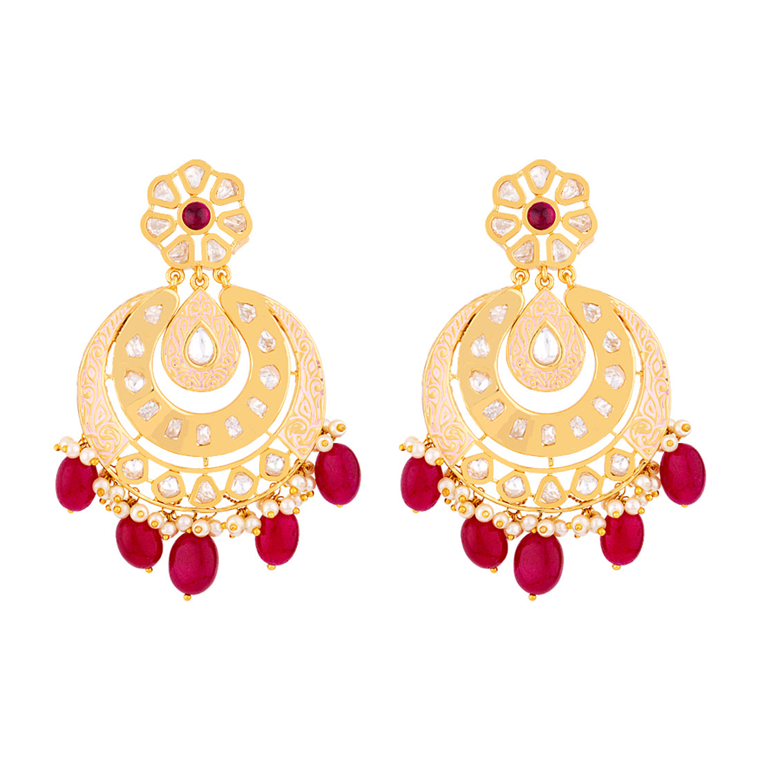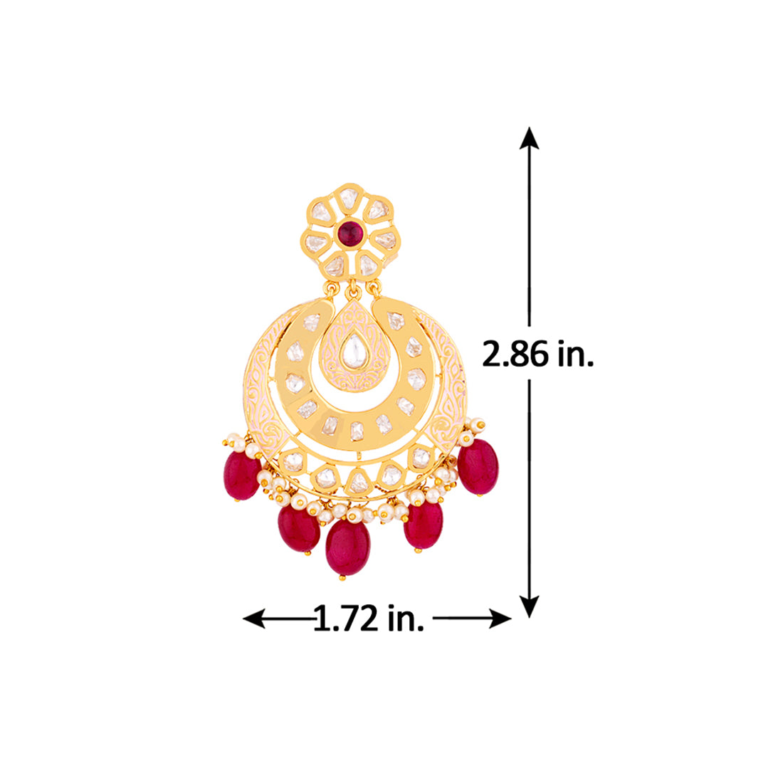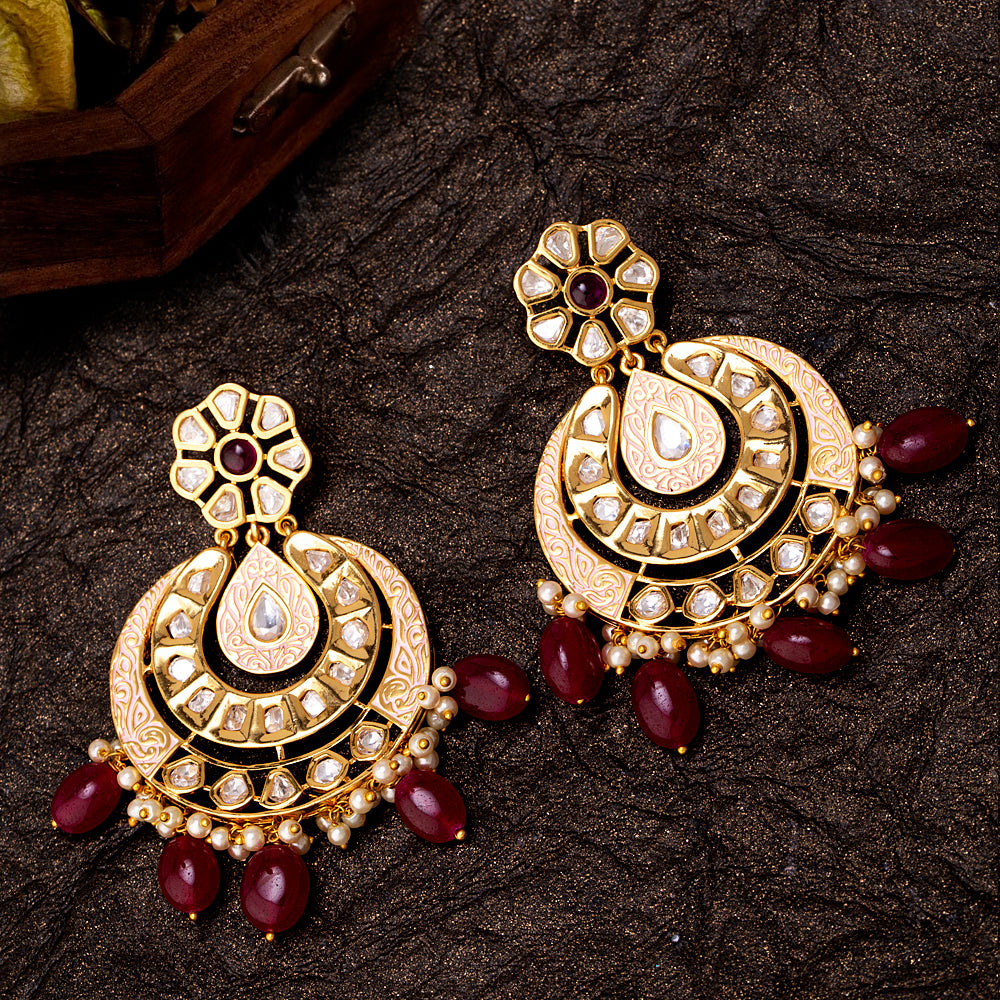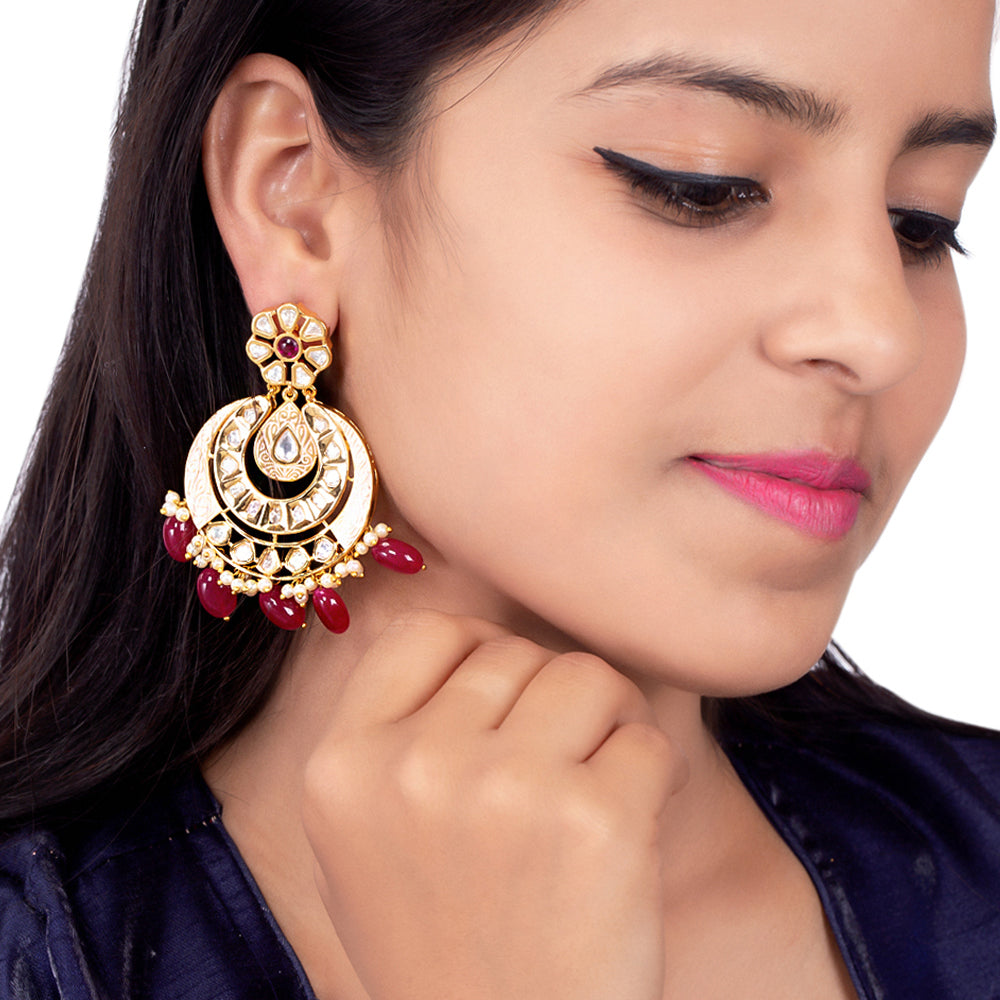 Drop earrings made from brass and yellow gold plated. Embellished with faux pearls and kundan gems. Wear with a traditional silk saree. This piece of jewelry comes with the Voylla assurance of quality and durability.