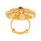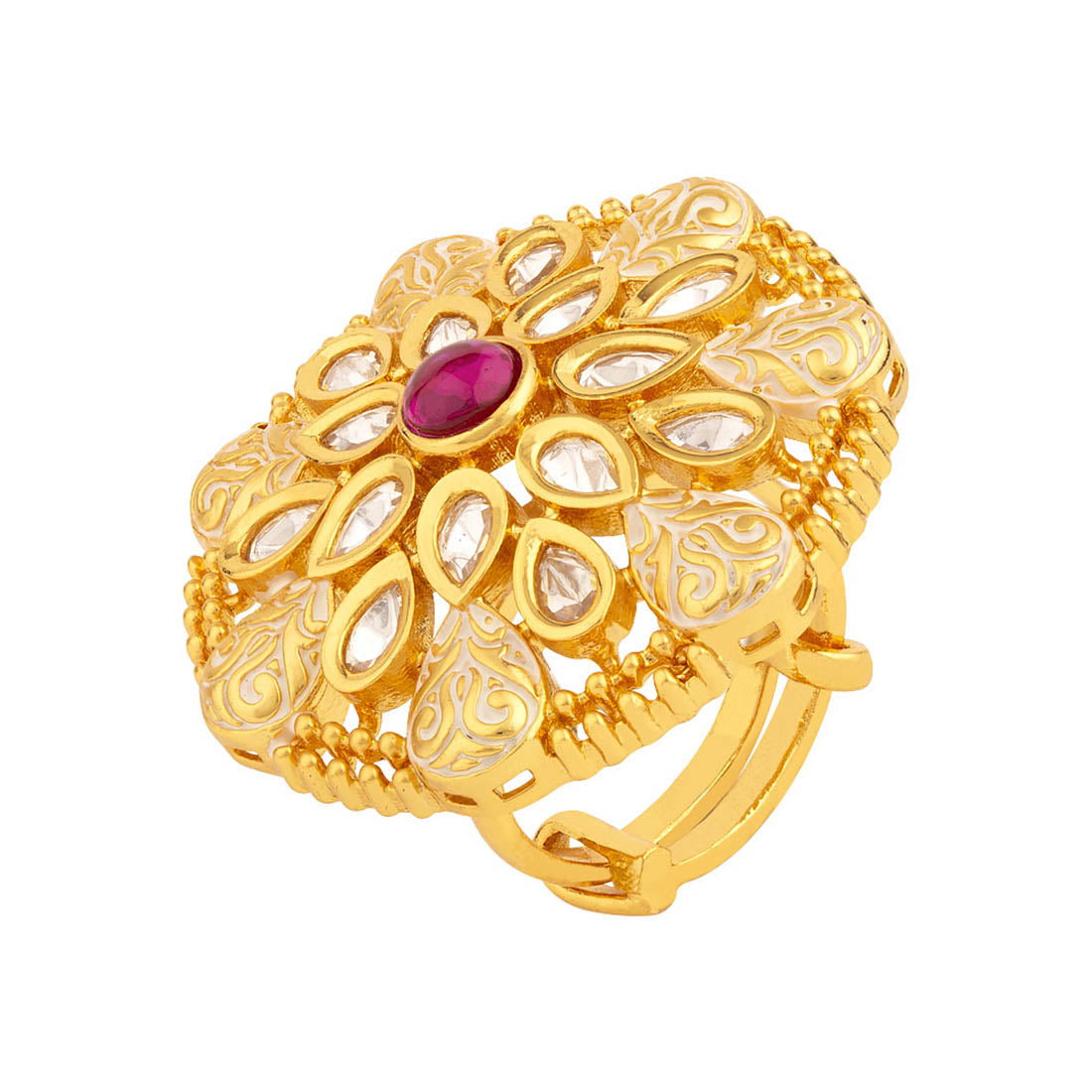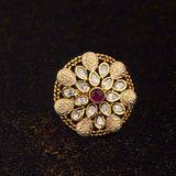 Cocktail ring fashioned into a classic floral motif from brass. Yellow gold plated and faux kundan gems embellished. Pair with Indian attire.