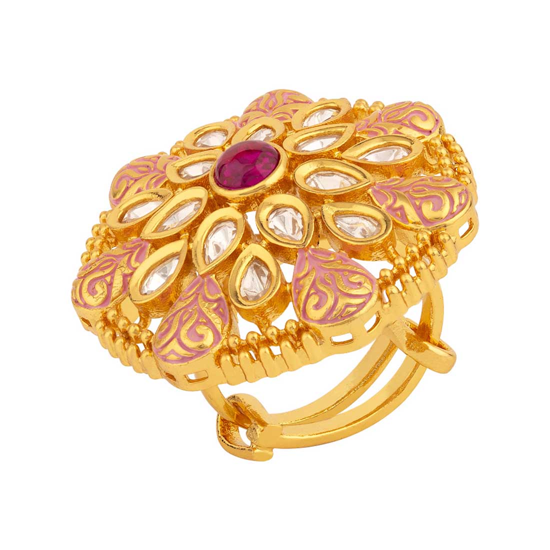 Statement ring in a floral pattern, fashioned out of brass. Yellow gold plated and faux kundan gems embellished. Wear with a traditional saree.