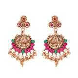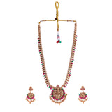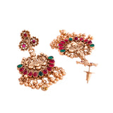 The Lakshmi Vilasam Temple Necklace Set, part of the Gold Opulence Collection, is a masterpiece of ethnic elegance and divine charm. Crafted from high-quality alloy and plated with gold, this set boasts intricate designs adorned with exquisite red and green kundan stones. The centerpiece of the necklace is a beautifully detailed pendant depicting Goddess Lakshmi, symbolizing prosperity and grace. Paired with matching earrings, this set offers a regal look that's perfect for weddings, festivals, or any special occasion. The vibrant colors and detailed craftsmanship make this set a versatile piece that can be styled with traditional sarees, lehengas, or even contemporary outfits for a unique fusion look. It's an ideal gift for women on occasions like Diwali, Rakshabandhan, Valentine's Day, Christmas, and New Year, making it a thoughtful present for mothers, sisters, girlfriends, wives, and lovers. Celebrate the opulence and grandeur of South Indian temple jewelry with this exquisite set.
