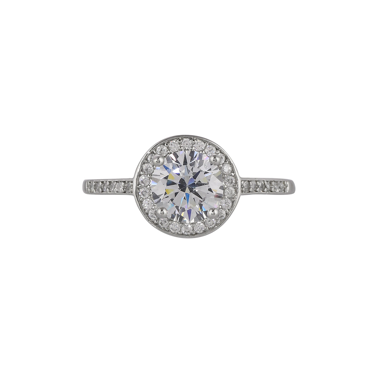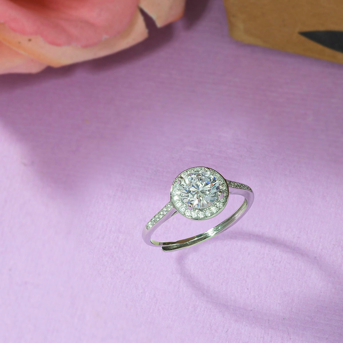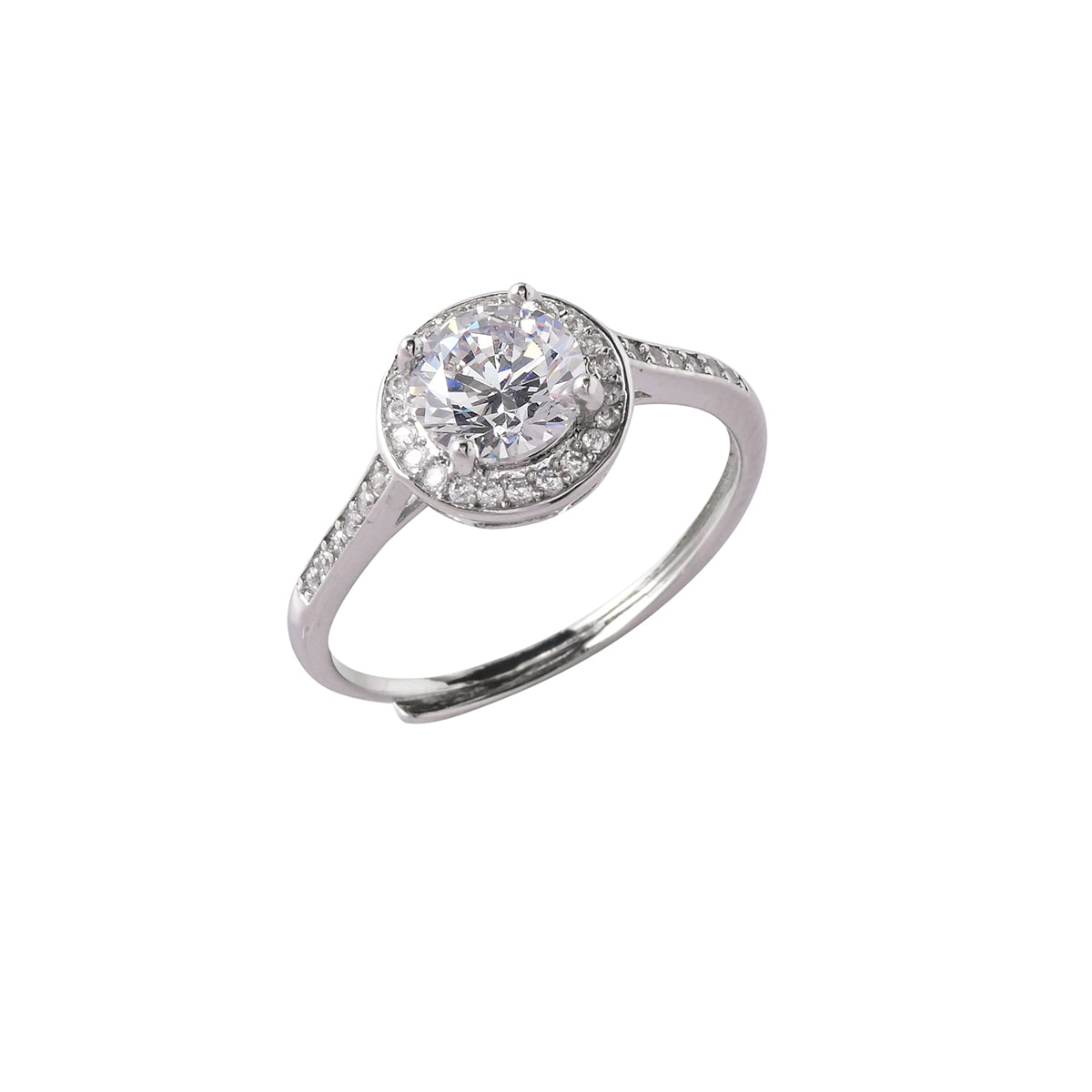 A sparkly finger ring for women, fashioned out of brass and silver plated. Embellished with a large, round cut clear zirconia gemstone, the ring will instantly illuminate every look you pair it with. Also good for everyday wear.