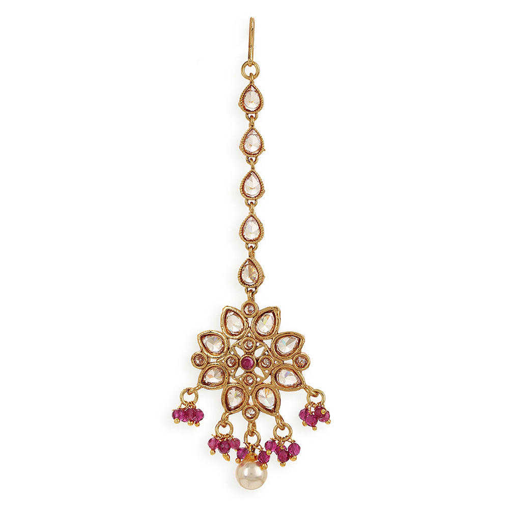 Maang Tika is an authentic ornate to uplift your Indian look up to 100x times better. This beautiful Tika with gold details with a flower in it makes it a perfect choice to pair up with any suit, or lehenga at your best cousin's wedding.