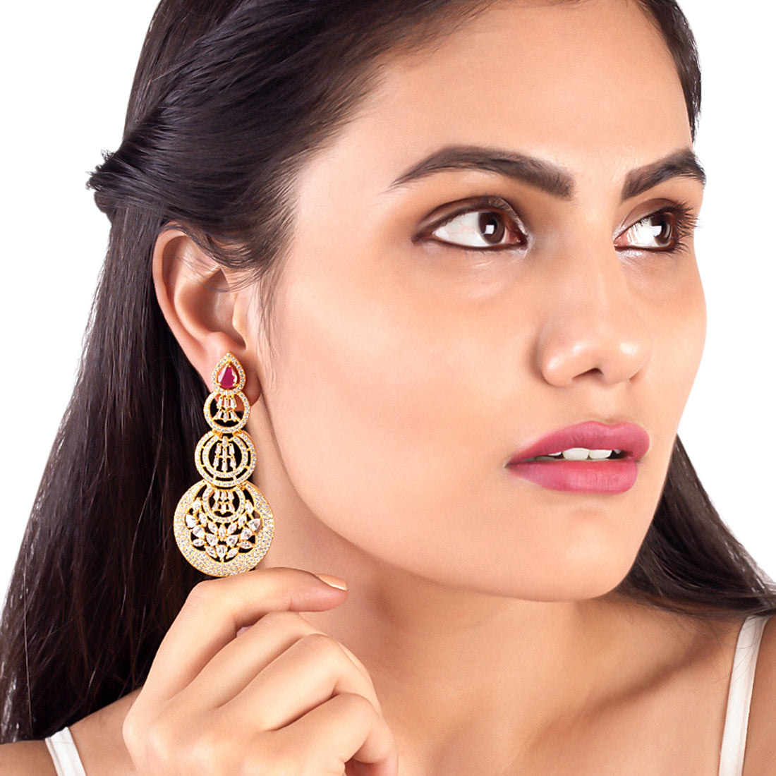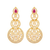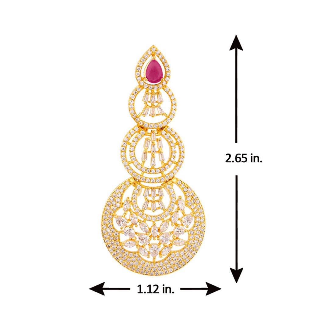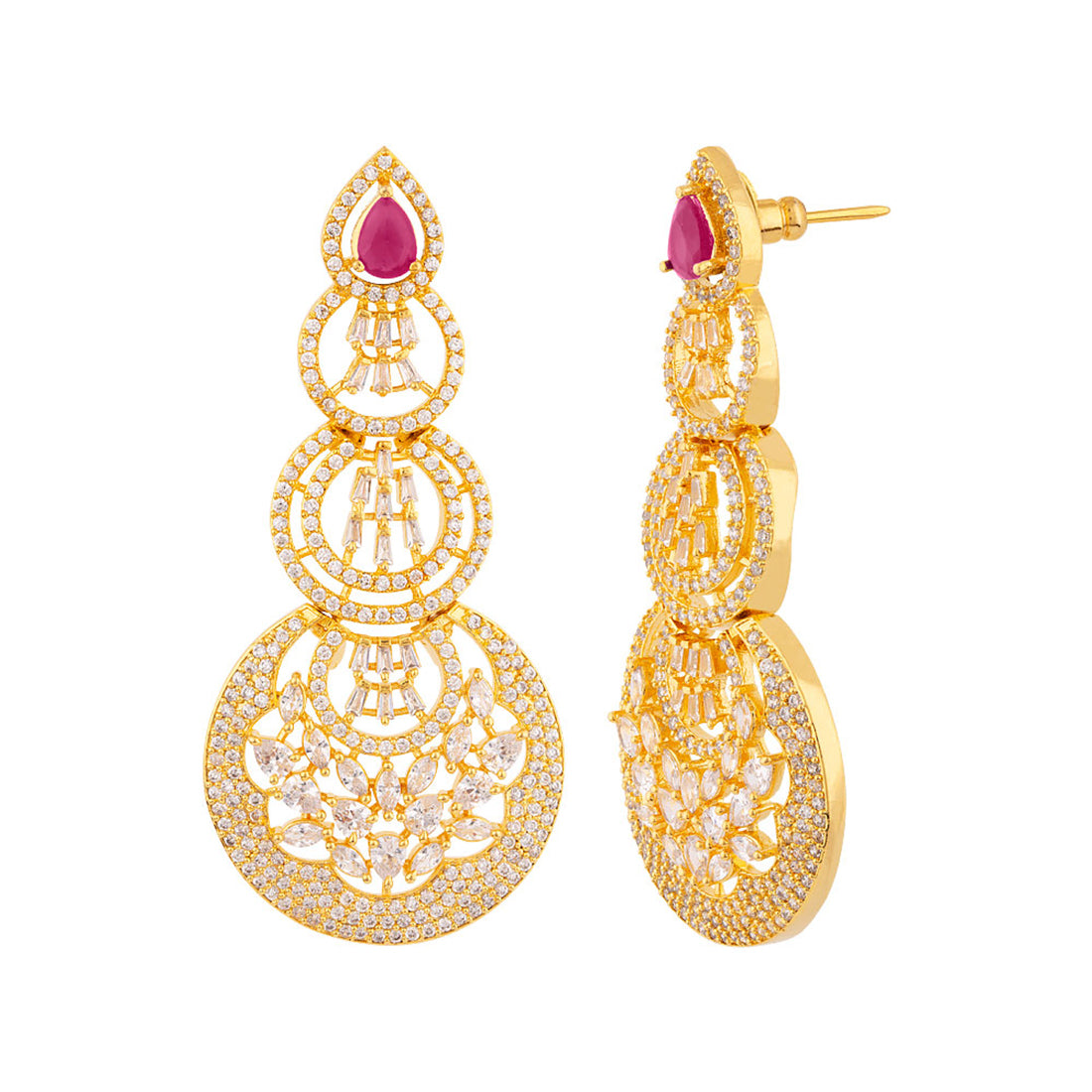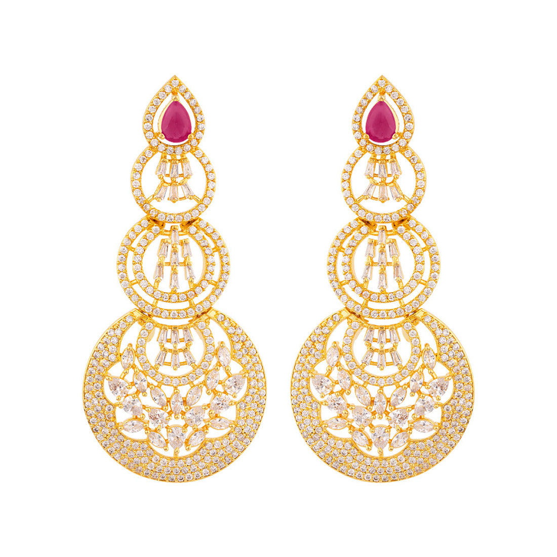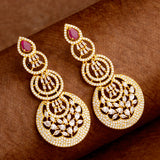 Layered circles drop earrings made from brass. American Diamond gems embellished and yellow gold plated. Wear with a summer dress. This piece of jewelry comes with the Voylla assurance of quality and durability.