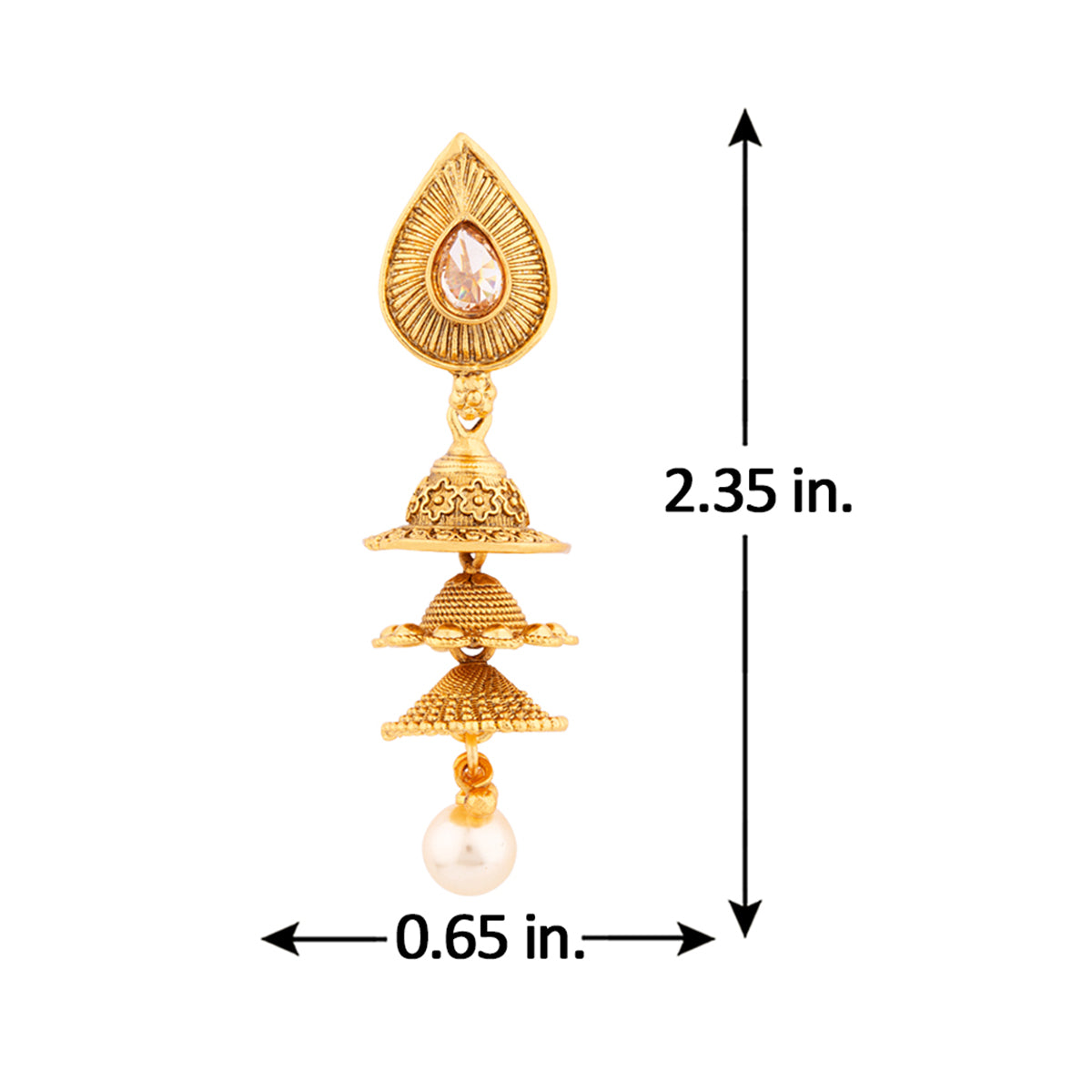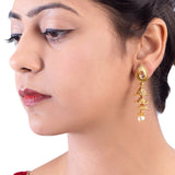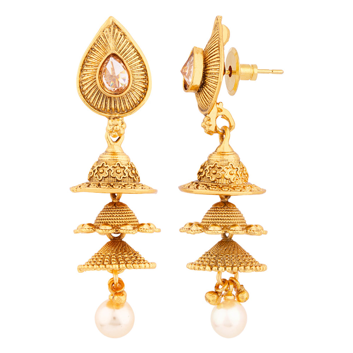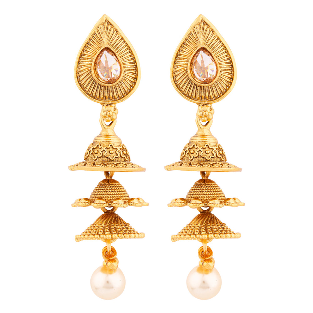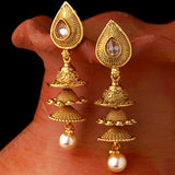 Brass layered drop style earrings with American Diamond gems and faux pearls. Yellow gold plated and good for formal ethnic looks.