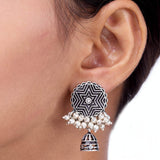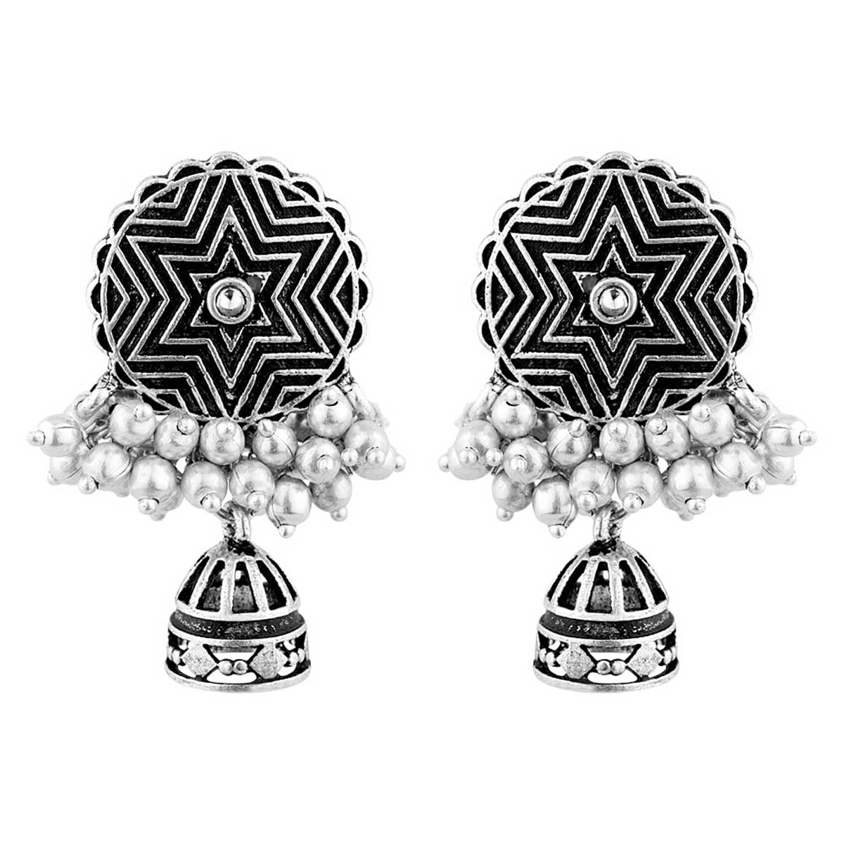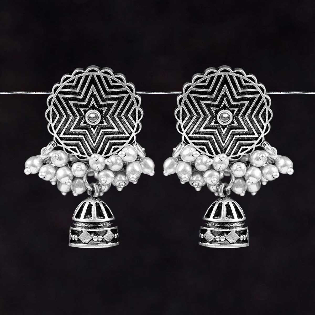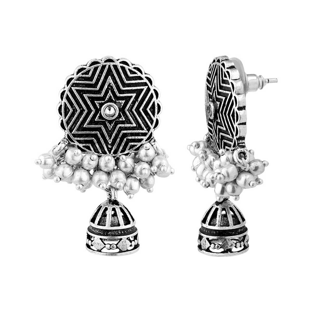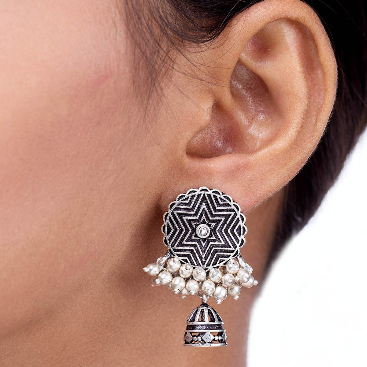 Oxidized earrings with antique black finish in multi-star texture.The design boasts clustered ghungroo beads and dome drops.These earrings are secured with a post-close.