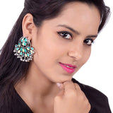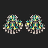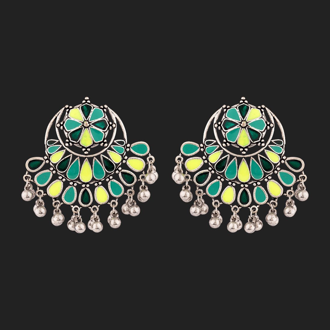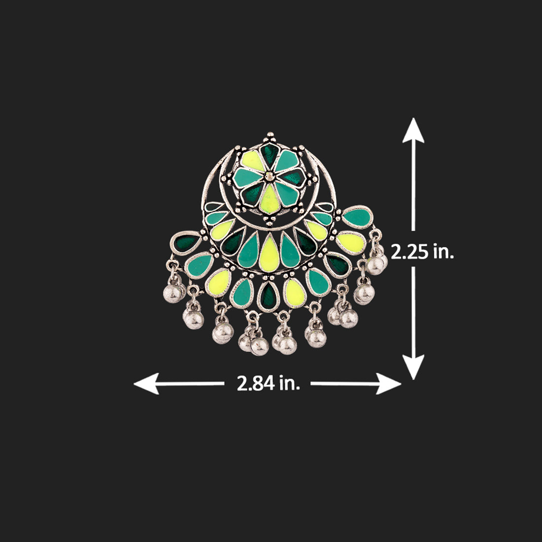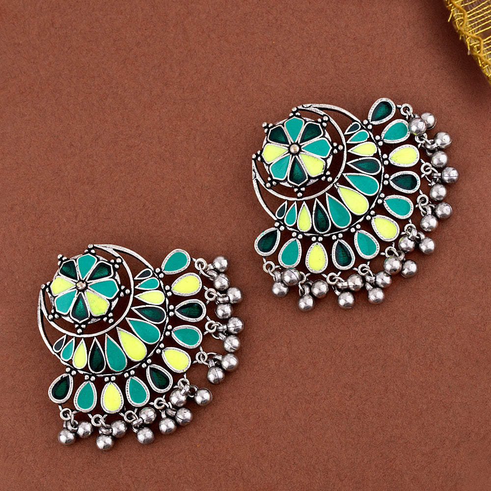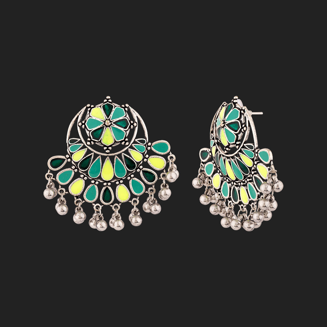 The traditional dye art of Rajasthan, Lehariya, has inspired these ethnic earrings. Made from brass and oxidised silver plated, the enameled pair has been embellished with tiny ghungroos. Pair with a casual saree.