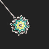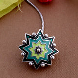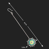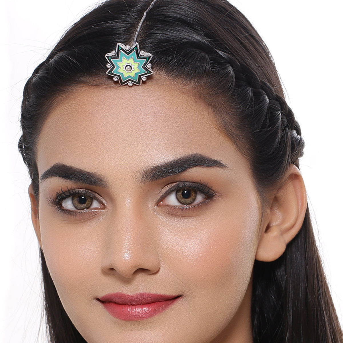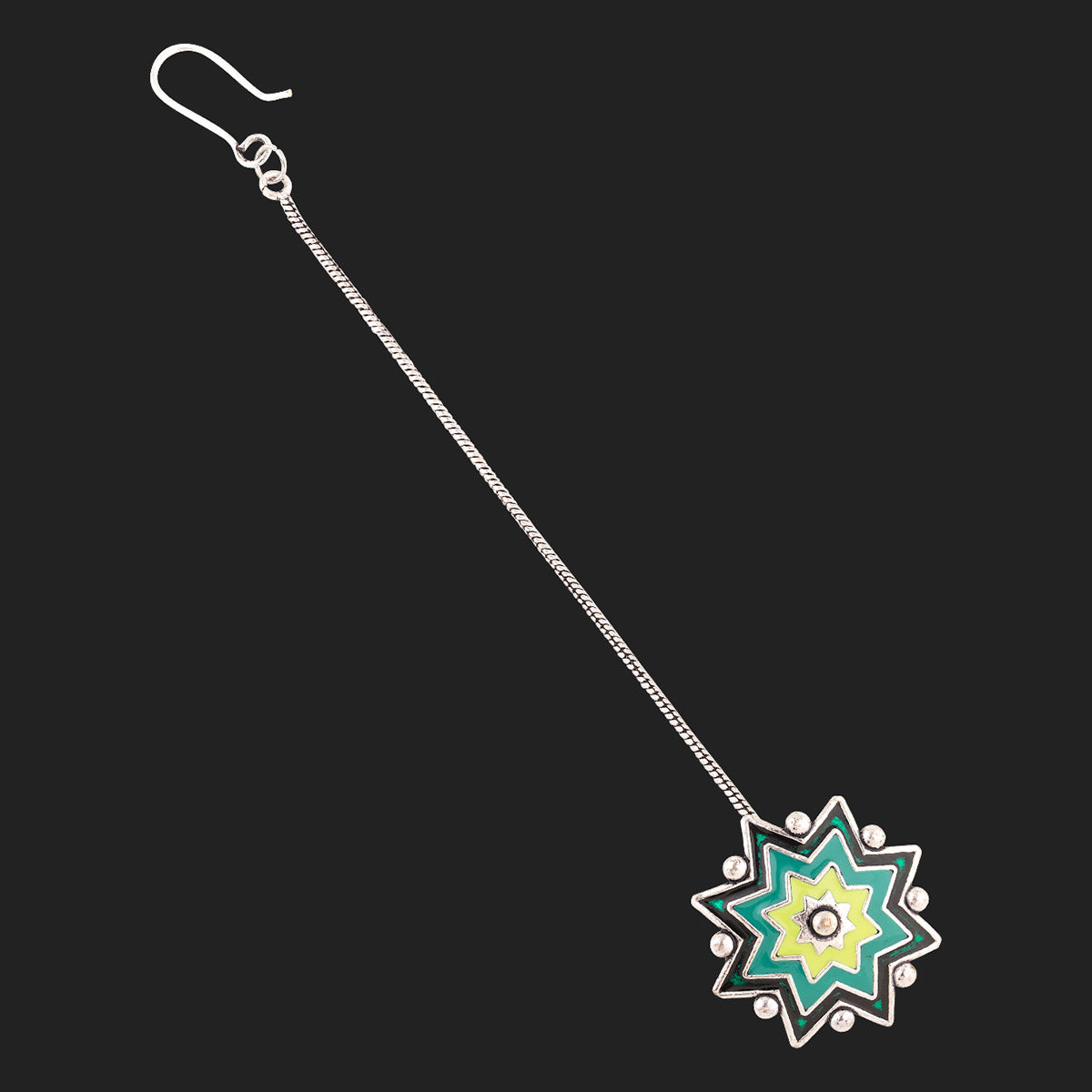 Green enameled maang tika made from brass and designed as a tribute to the Rajasthani dyeing pattern of creating a waves-like design. Oxidised silver plated. Pair with ethnic looks.