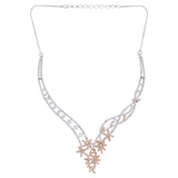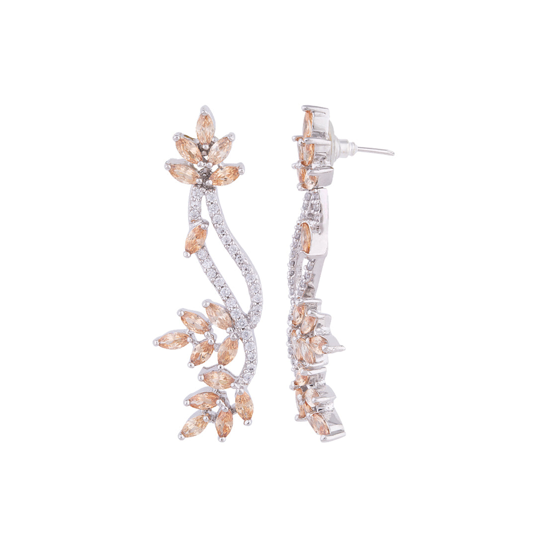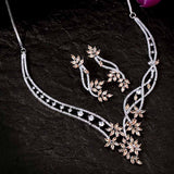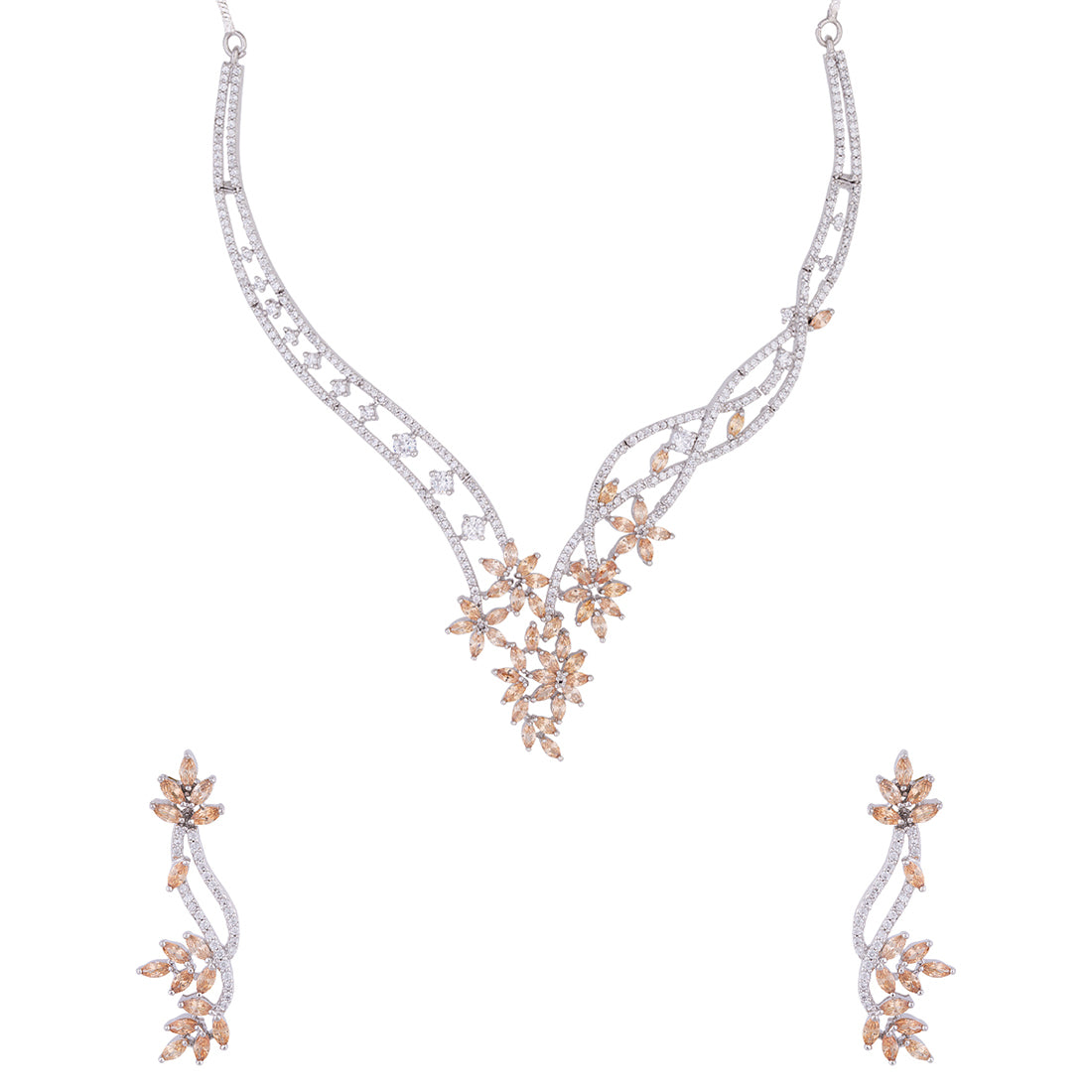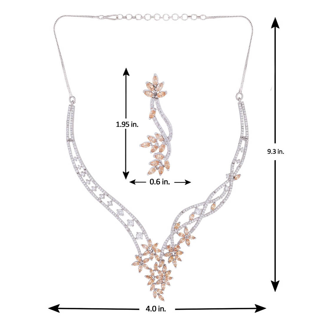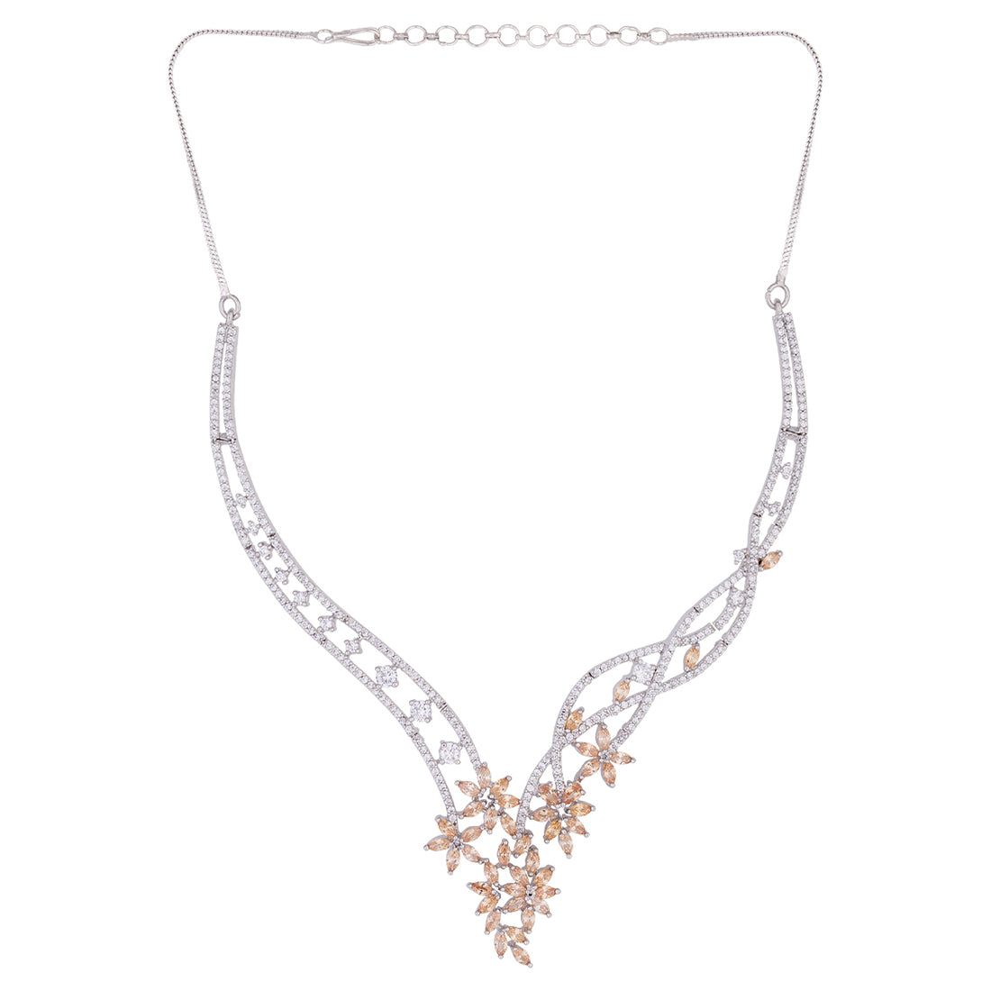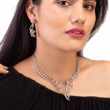 Long chain necklace set made from brass. American Diamond gems embellished and silver plated. Wear with a trendy saree.