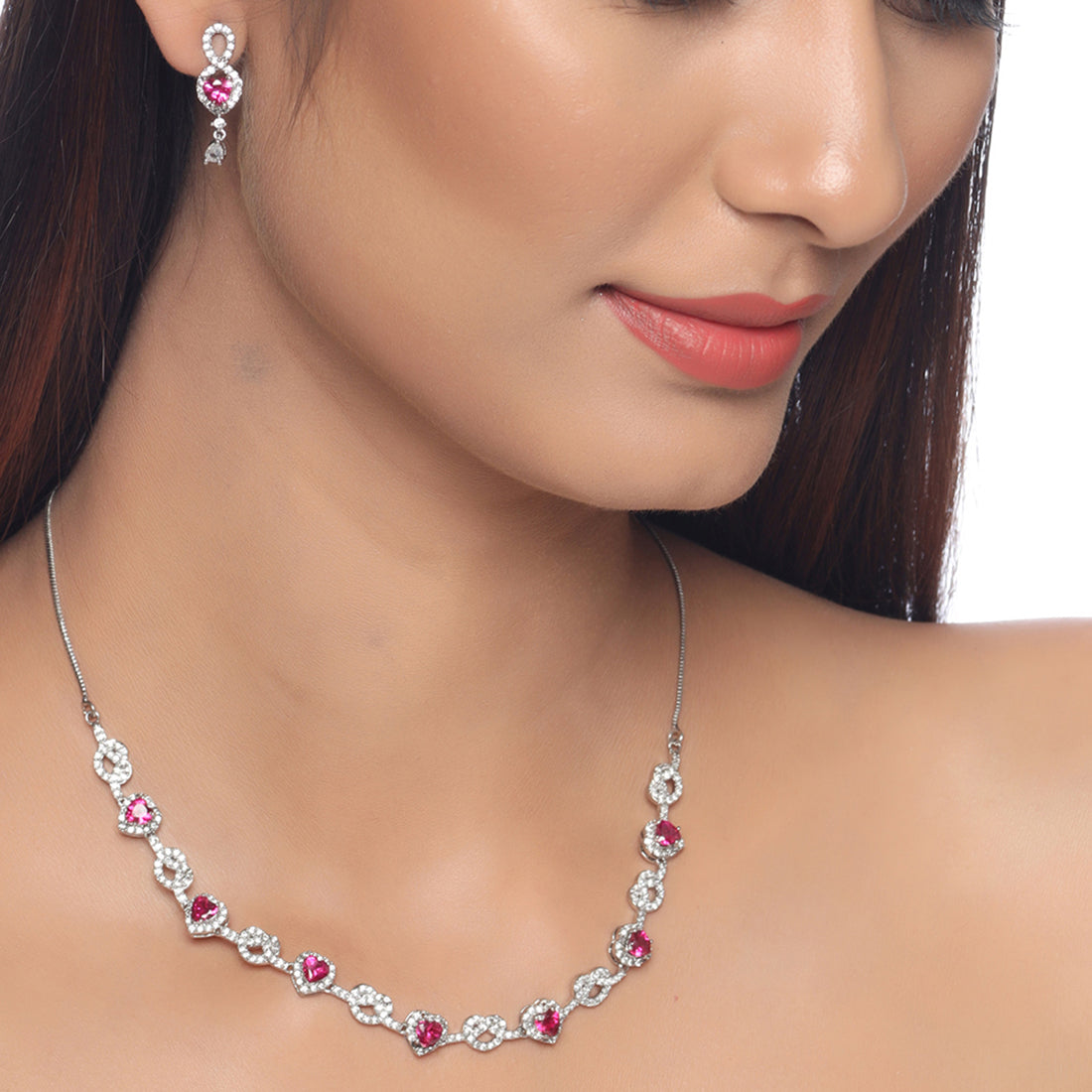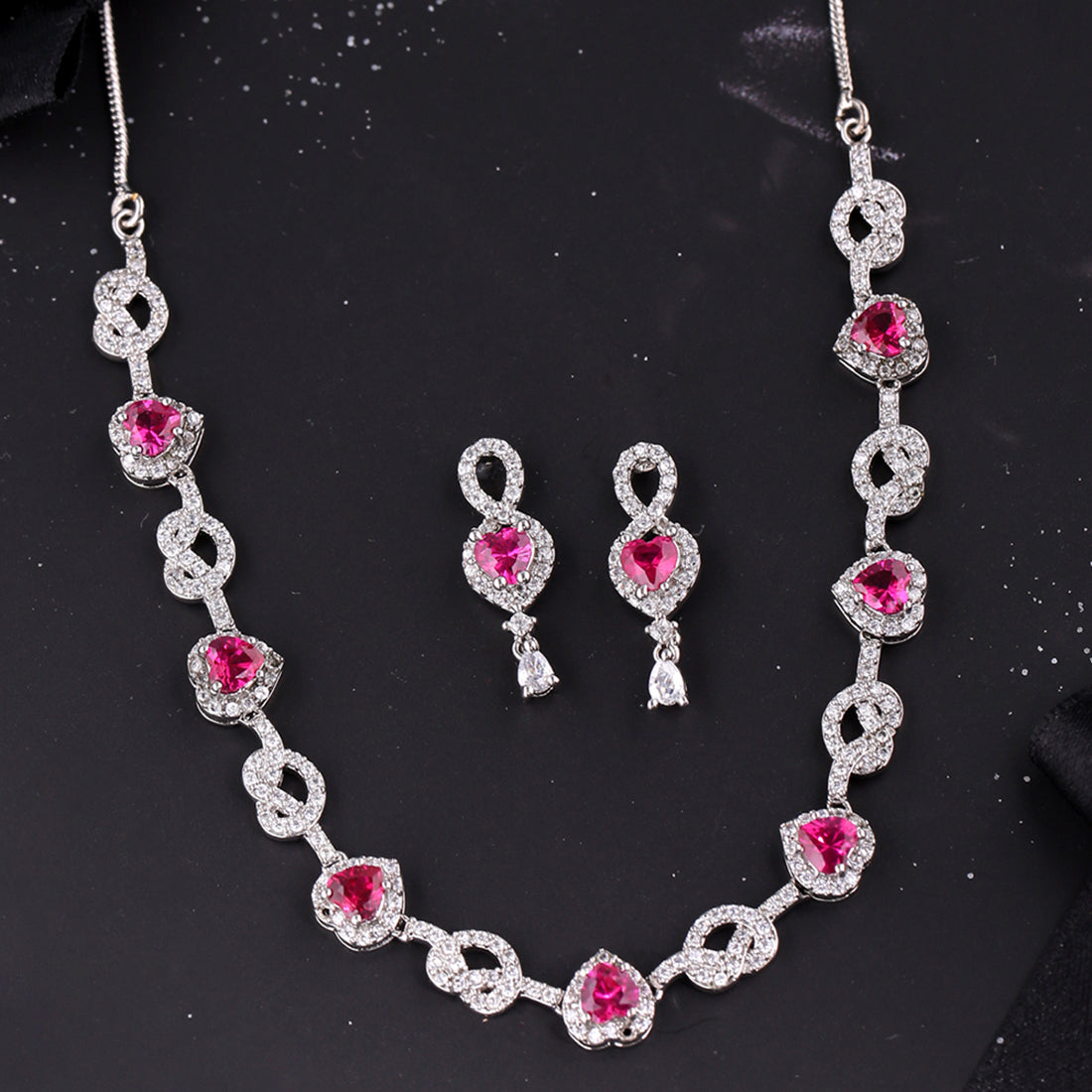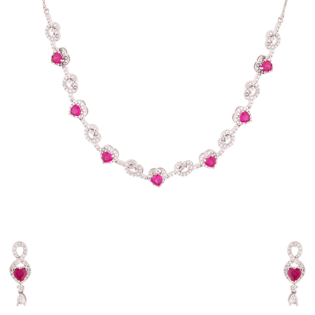 Hearts motifs necklace set, inspired by the classic True Lover's Knot symbol, which stands for unbreakable bonds and true affection. Fashioned out of brass and silver plated, the set has been embellished with zircon gemstones. Pair with a cocktail gown.