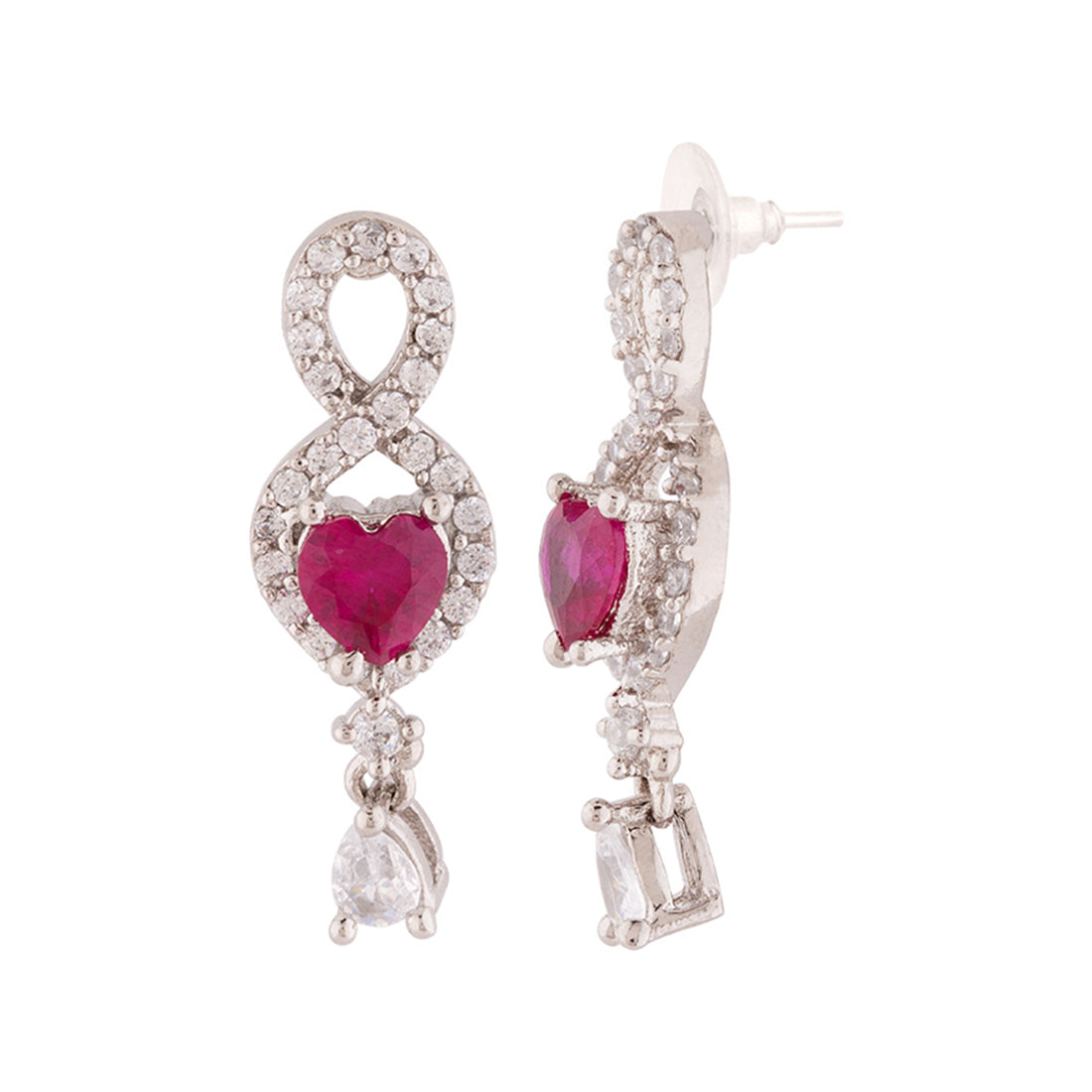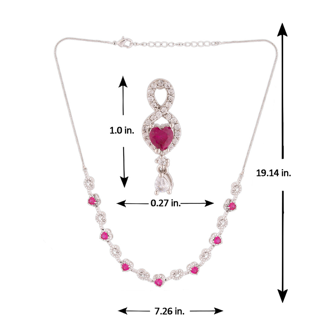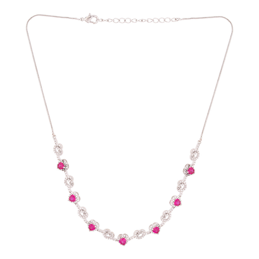Hearts motifs necklace set, inspired by the classic True Lover's Knot symbol, which stands for unbreakable bonds and true affection. Fashioned out of brass and silver plated, the set has been embellished with zircon gemstones. Pair with a cocktail gown.
