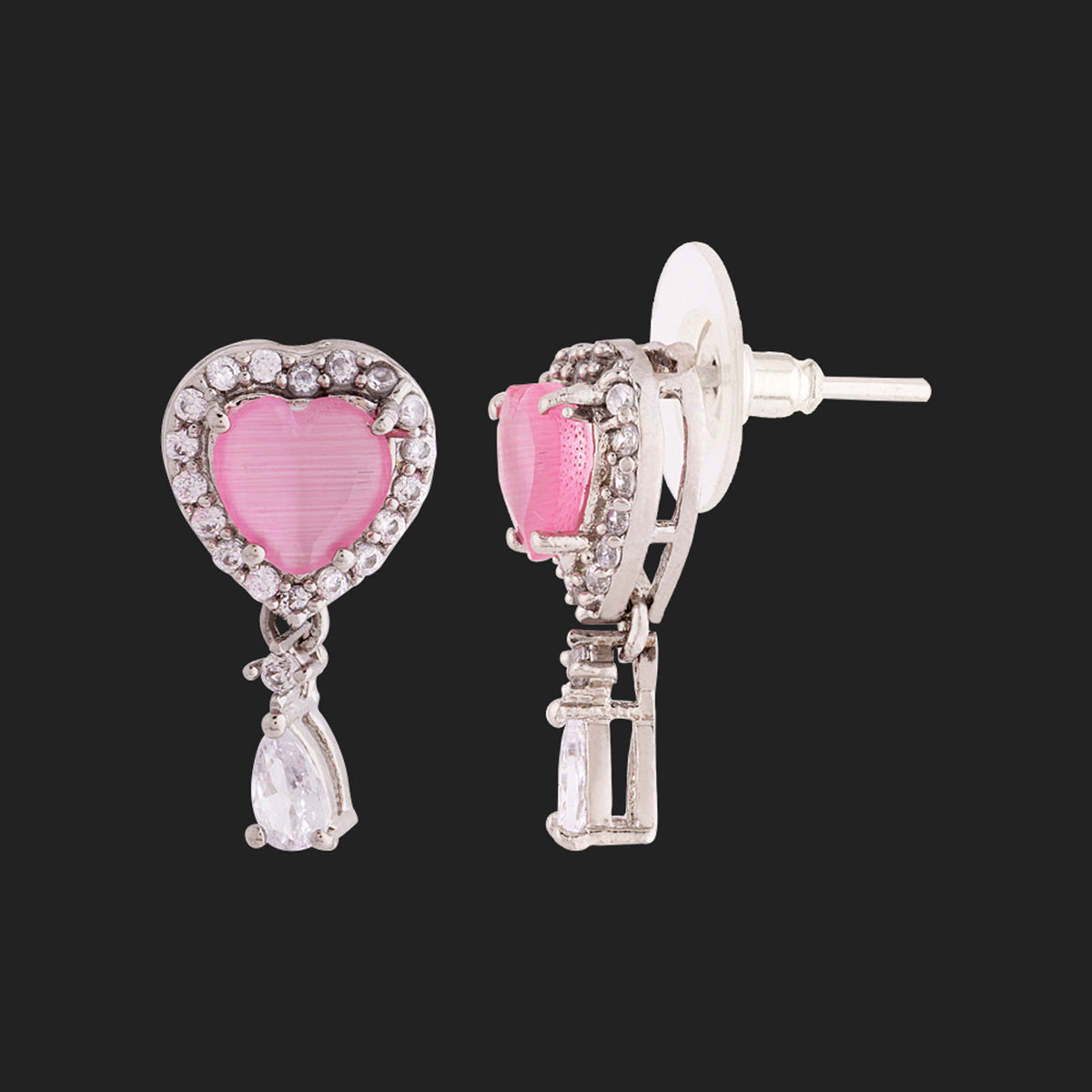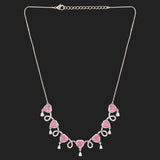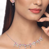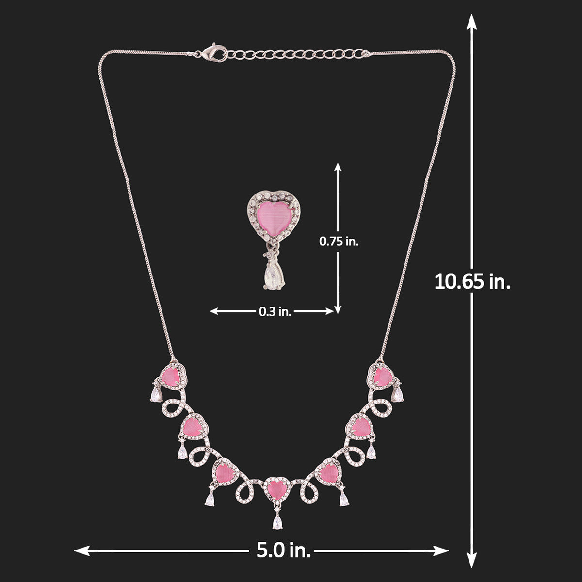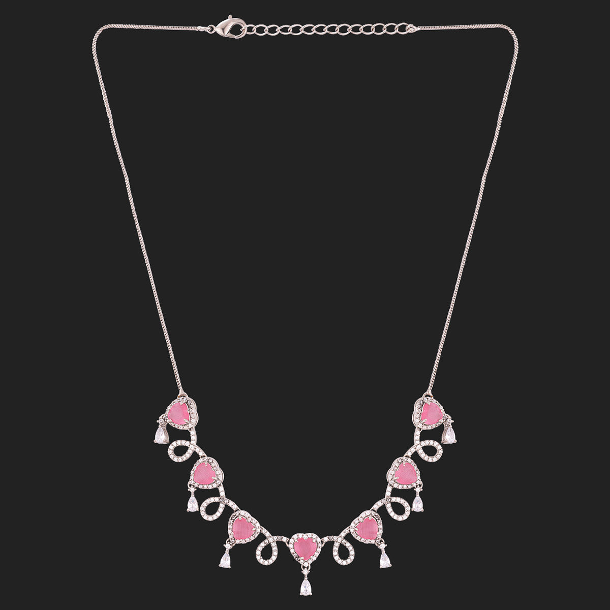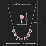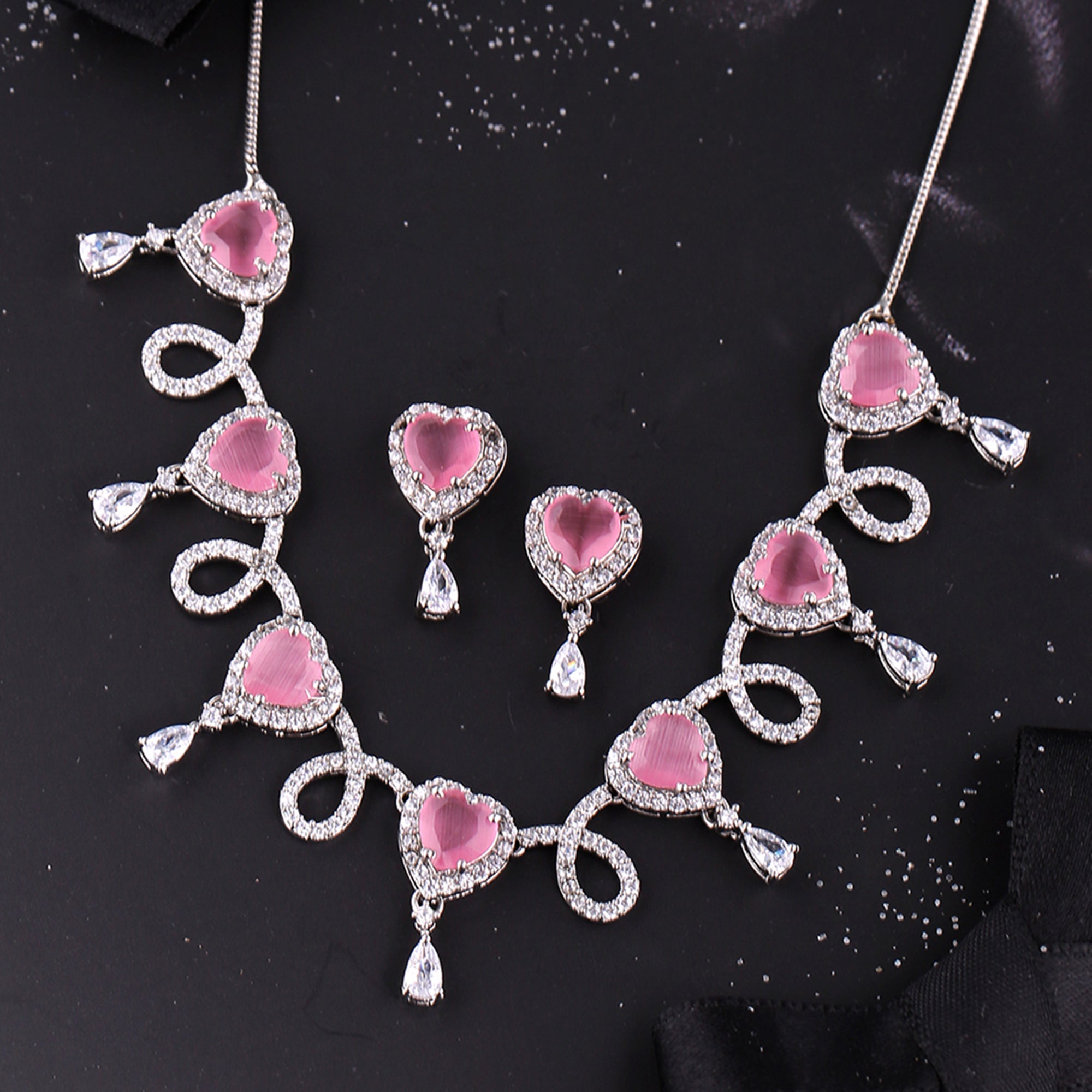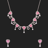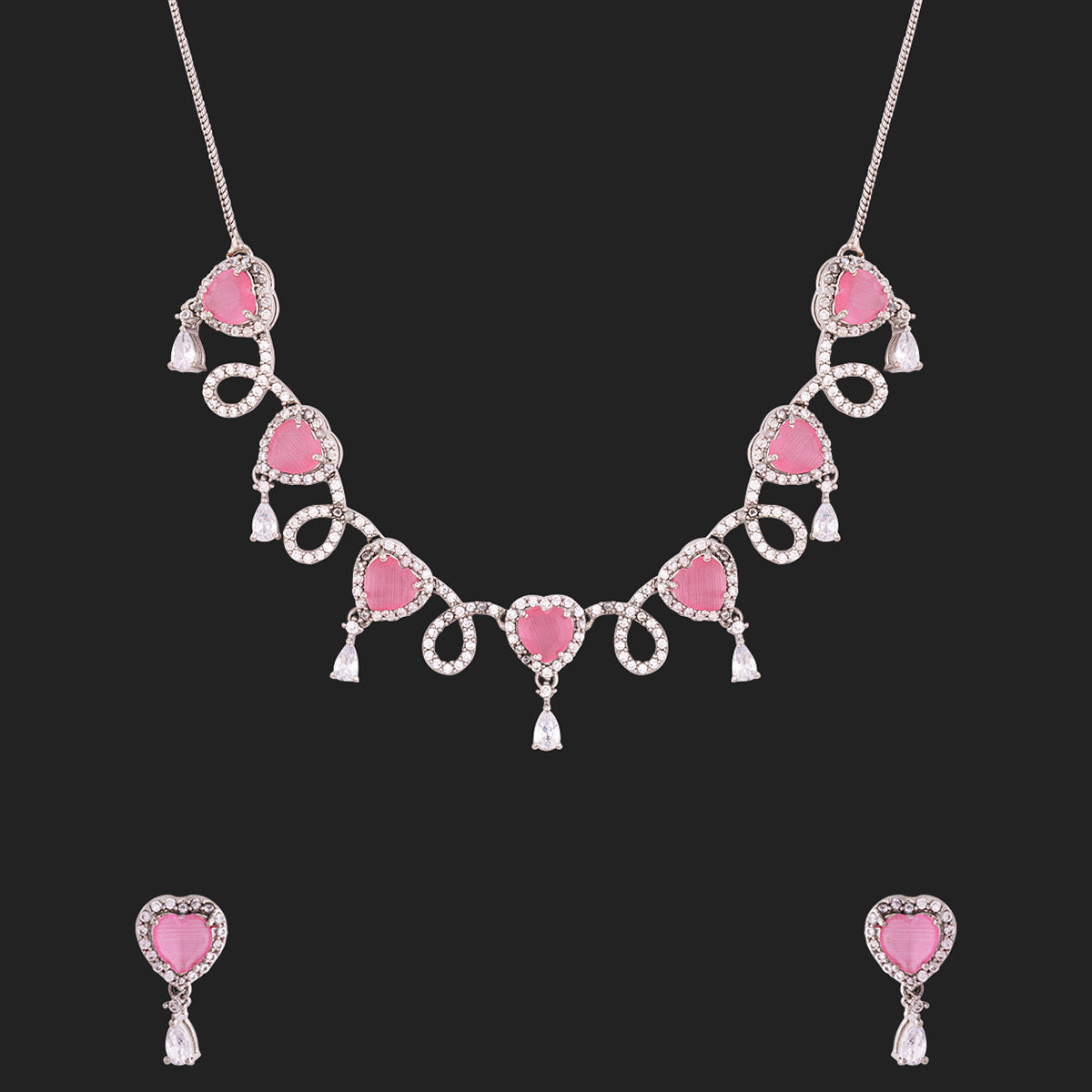 Looping hearts motifs necklace set, inspired by the True Lover's Knot, a symbol of unbreakable bonds and love. Made from brass and silver plated, the zircon gemstones adorned set can be paired with a cocktail dress or trendy saree.