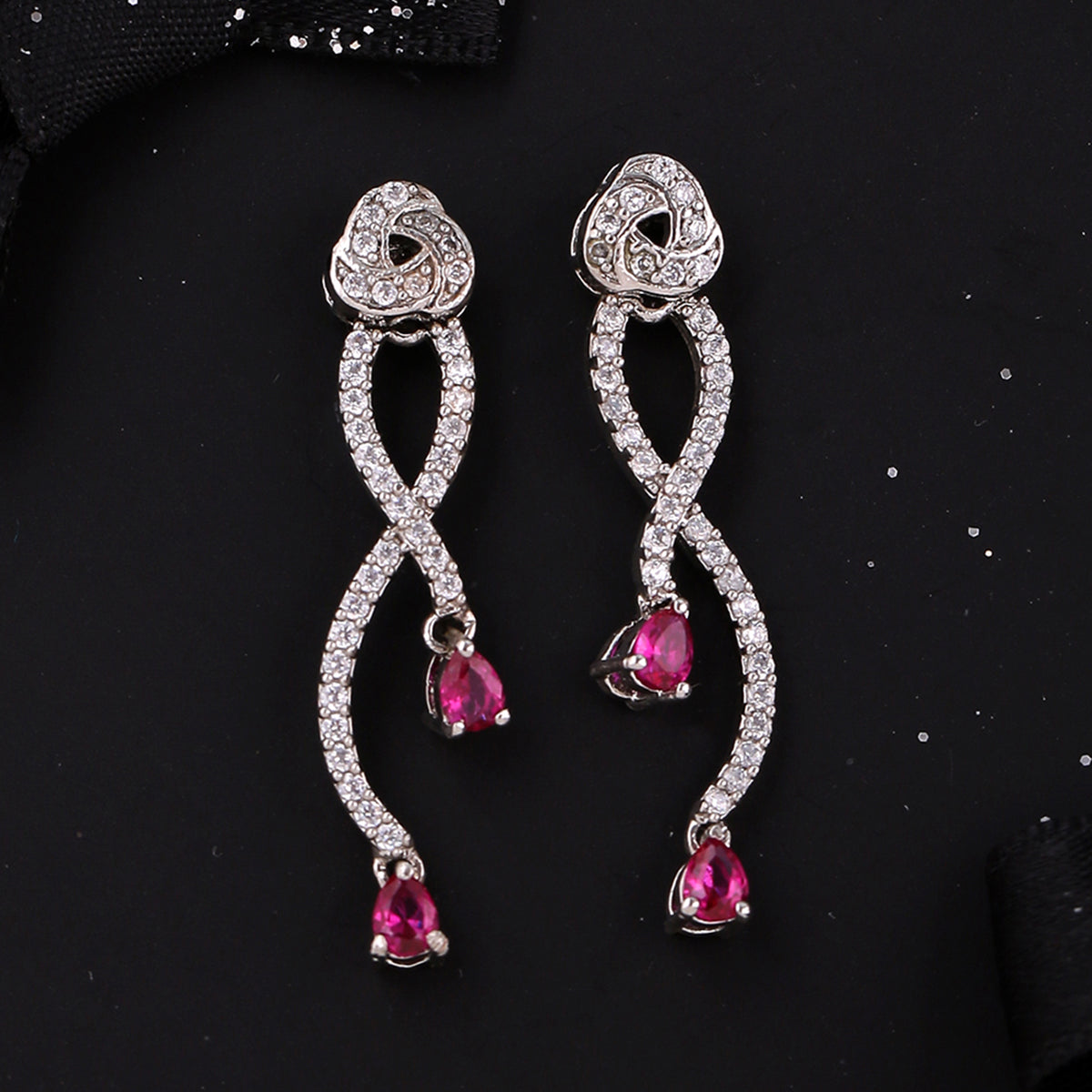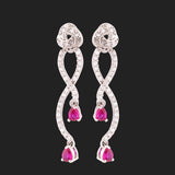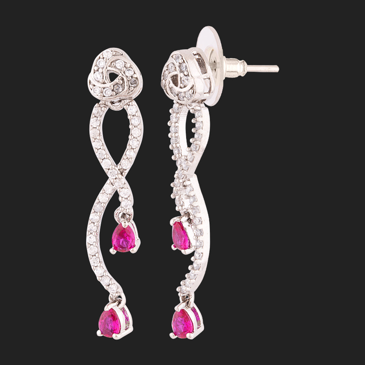 Inspired by the True Lover's Knot formation, a symbol of unbreakable bonds and affection, these twist pattern earrings have been fashioned out of brass. Embellished with American Diamond gemstones and silver plated, the versatile earrings can be paired with ethnic, Indo-Western and Western looks.