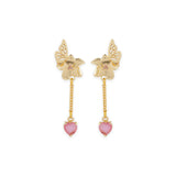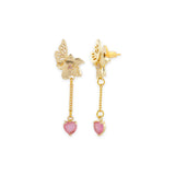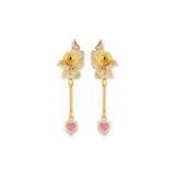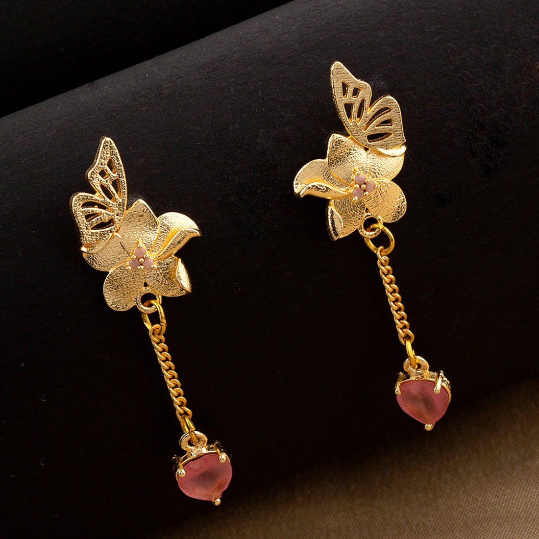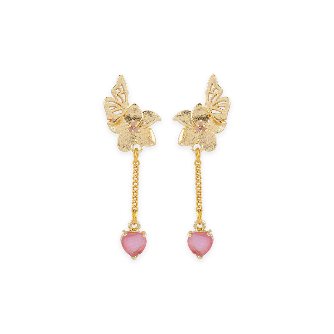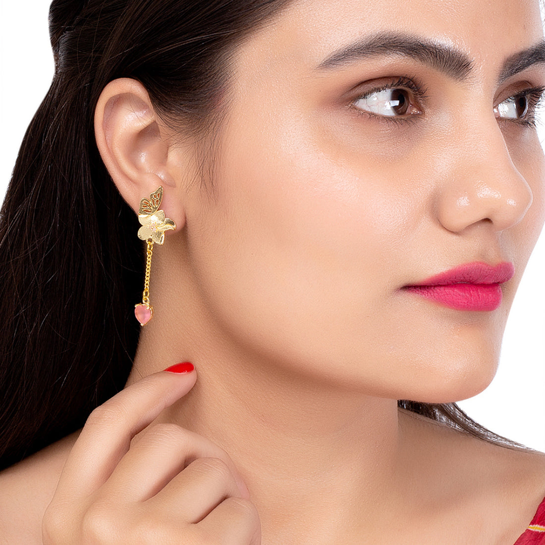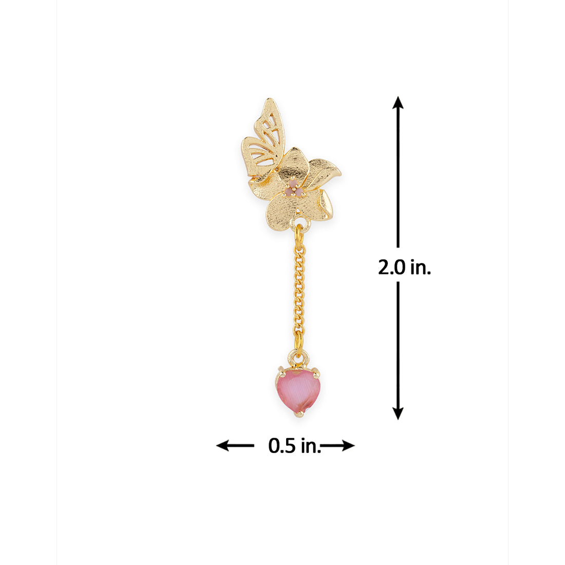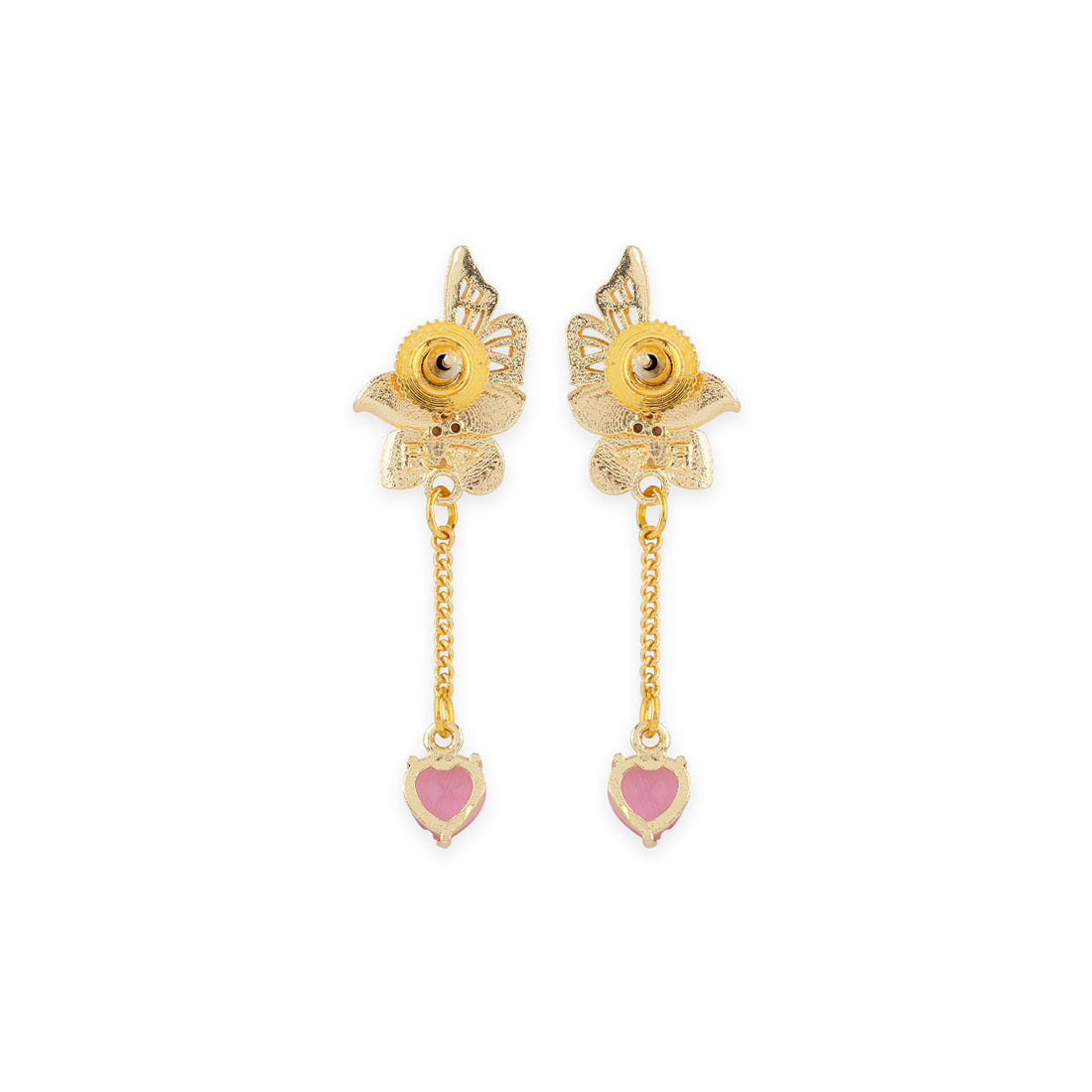 Bring the magic of Spring into your day-to-day wear these dainty butterfly drop earrings alone for a magical look. This brass pair has been given a shiny die gold finish and studded with pink gemstones. Pair them with your formal party dress.