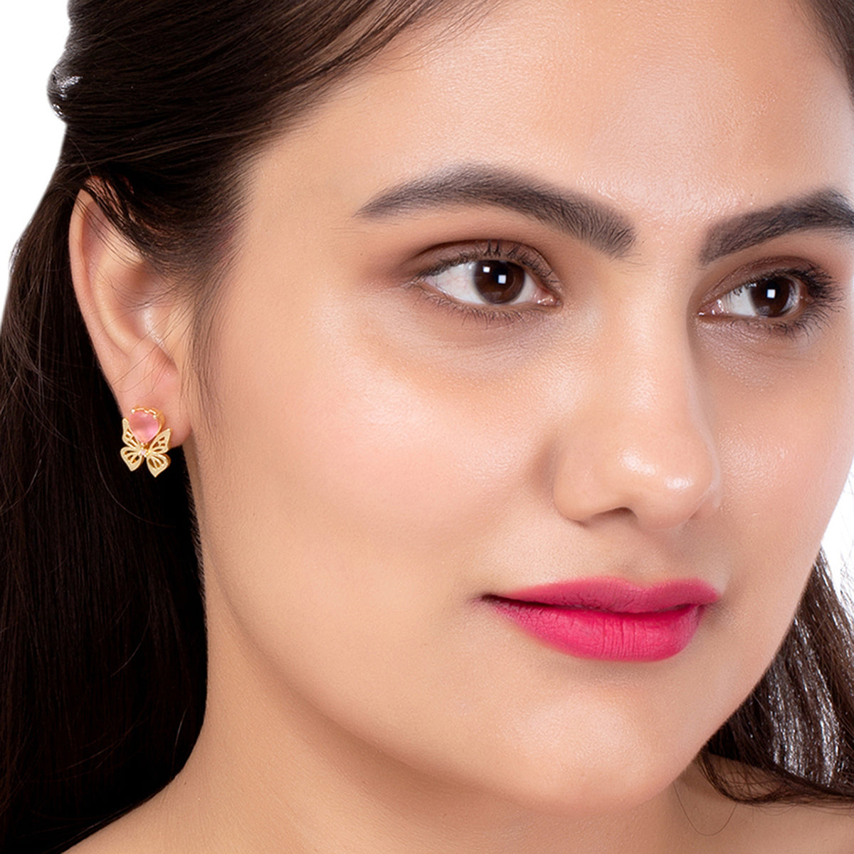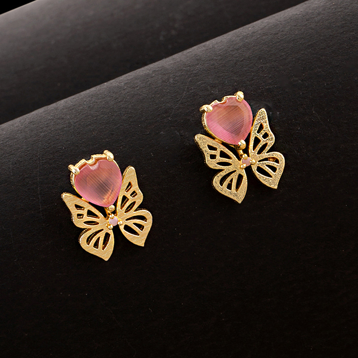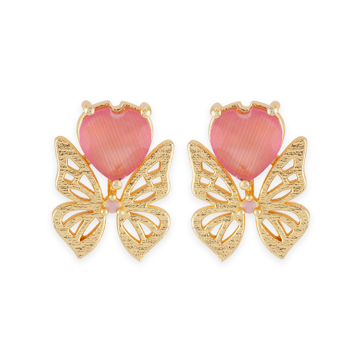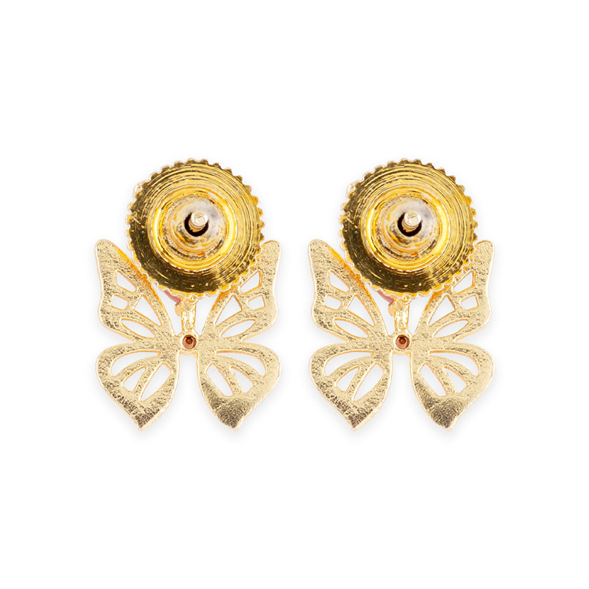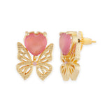 These gorgeous brass earrings are sure to be an eye-catcher. This pair has given a die gold plating and features a butterfly motif with pink gems. Pair them with a classy, formal dress.