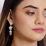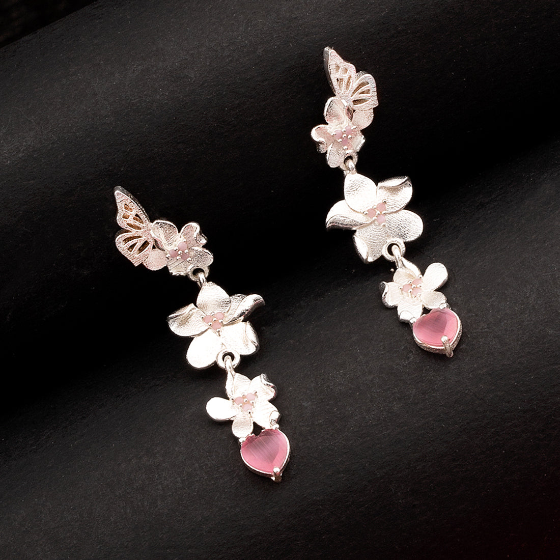 Create a refreshing appeal with these flower earrings that are a statement of their own. Plated with silver and dressed up with baby pink gemstone. Pair it up with a pretty floral print dress and you are good to go for a happening day out or at a party.