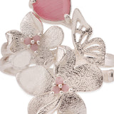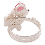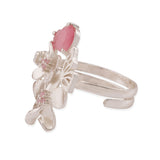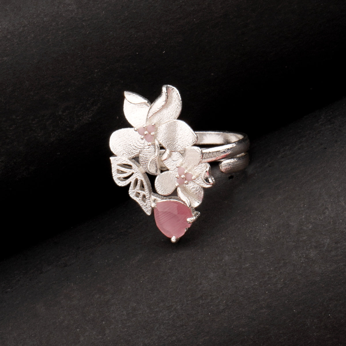 A perfect combination of cute and charismatic. This cute ring is all about keeping it fun with a statement. The floral and butterfly wing detailing catches the attention of anyone who has a taste in artistic jewelry. The silver finish and pink color stone, make this statement ring perfect for any occasion or attire.