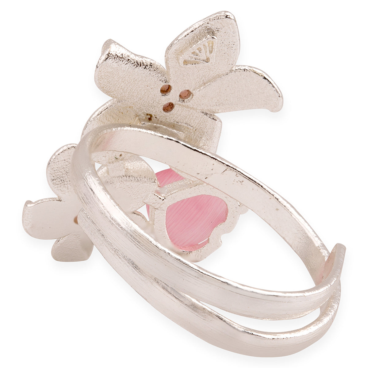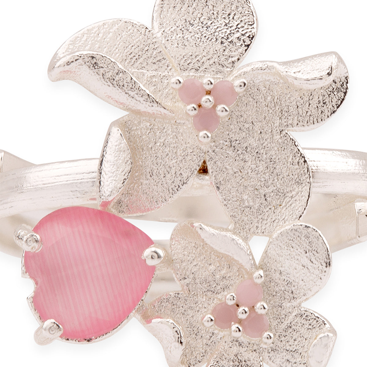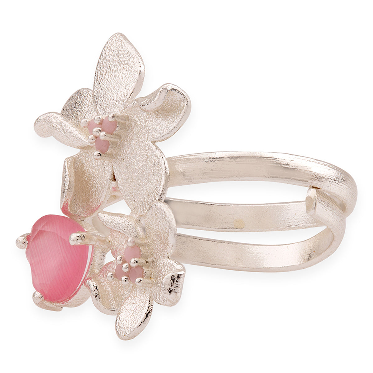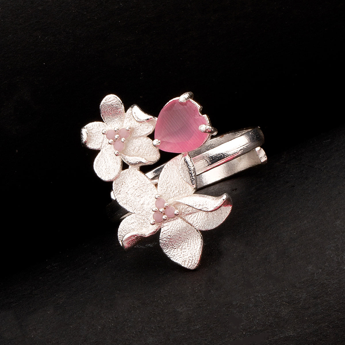 This gorgeous ring can be added to unmissable addition to your ever growing floral collection. The tri floral pattern and a heart shaped pink gemstone make this ring perfectly appropriate for any spring event.