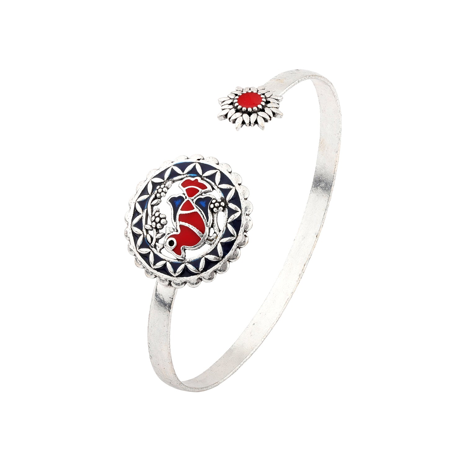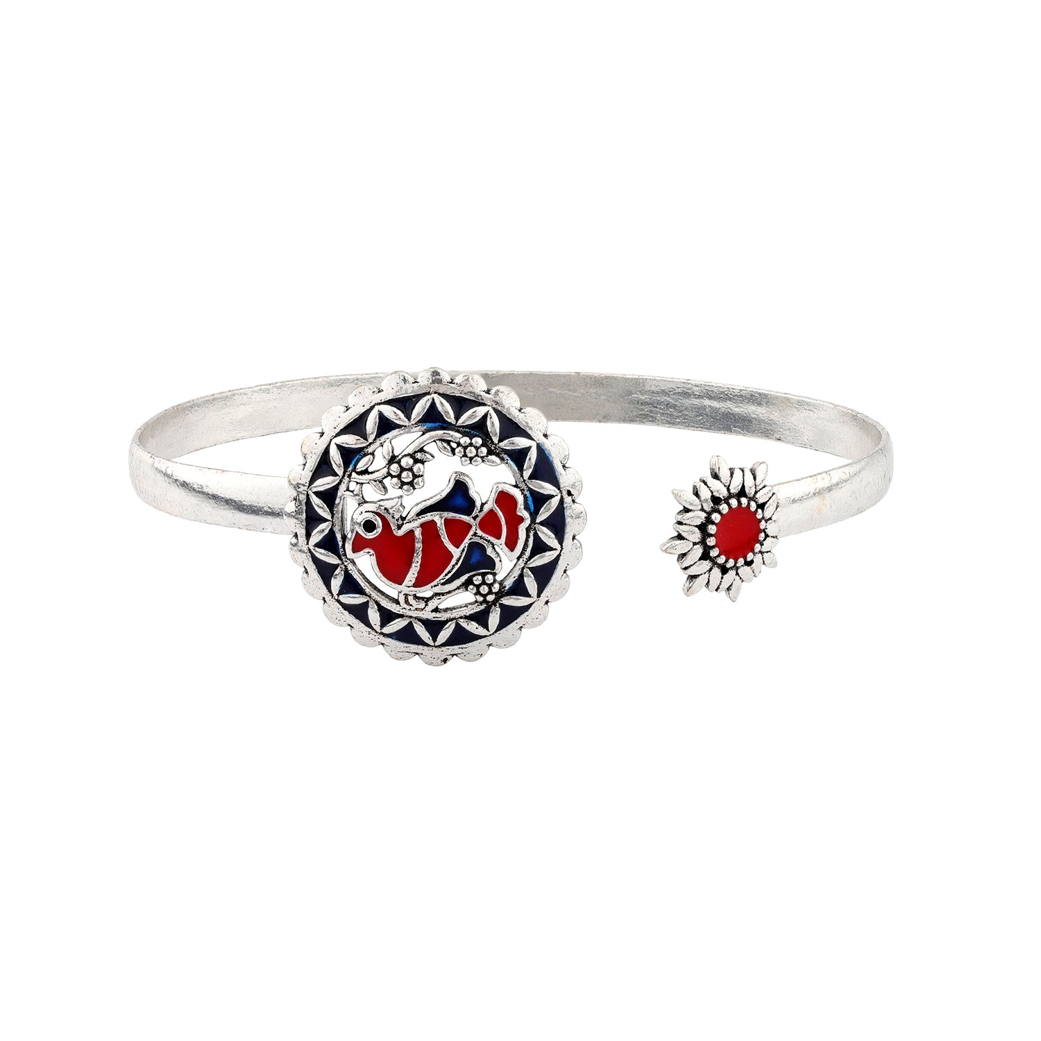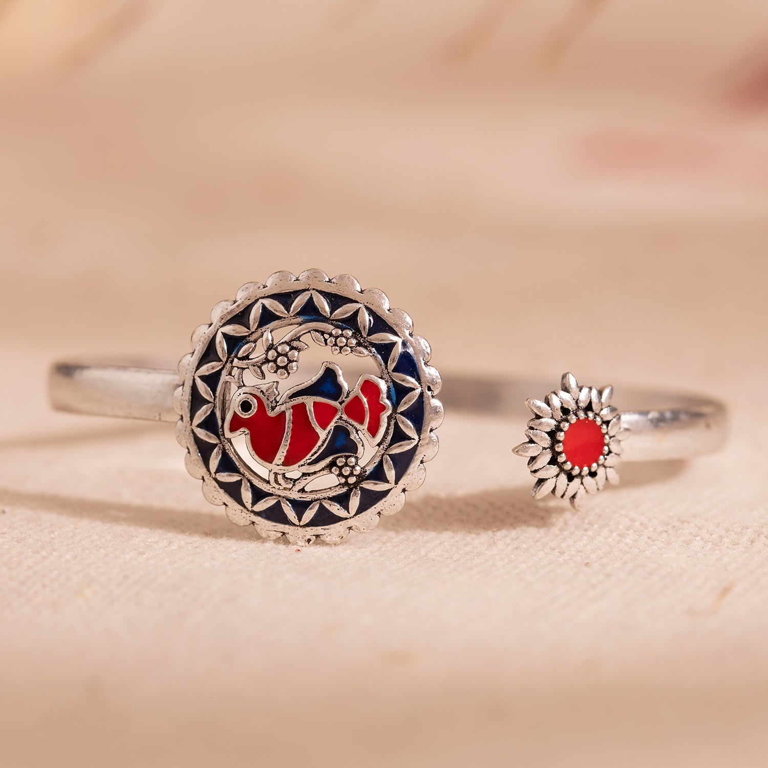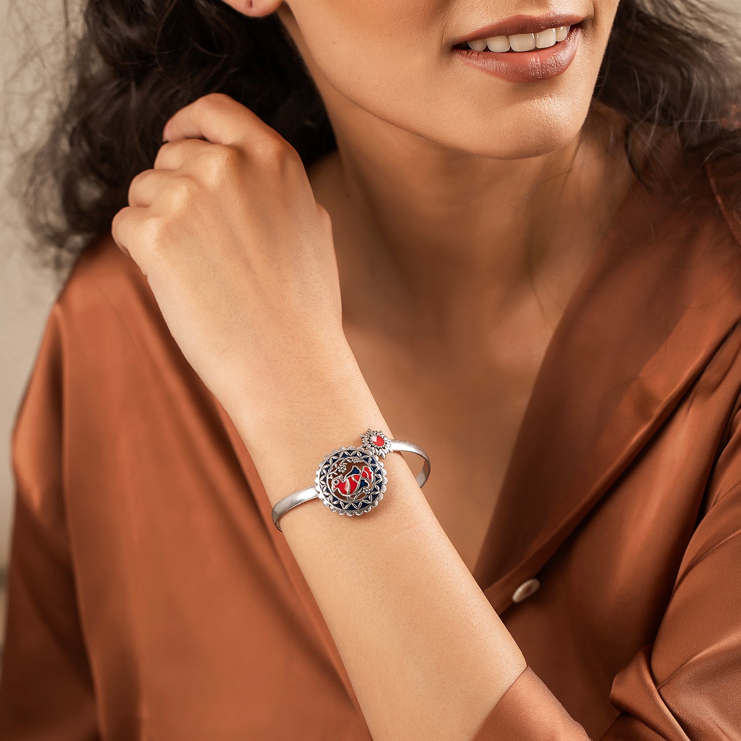 A beautiful blend of heritage and contemporary elegance, the Madhubani Pakhi Phool Oxidised Enamel Bangle is a statement piece designed for the modern woman who loves celebrating culture in style. Crafted from high-quality brass with a silver oxidized finish, this cuff bangle showcases intricate Madhubani-inspired motifs, blending delicate jali work with bold enameled floral and bird designs. The vibrant hues of red and blue enamel add a pop of color to your everyday ensemble, while its artistic detailing makes it effortlessly chic for office wear, travel, or festive occasions like Diwali, Rakshabandhan, Holi, and Christmas. Whether you pair it with ethnic attire for a traditional look or wear it as a trendy Indo-western statement piece, this oxidised bangle for women is all about sophistication and storytelling. A perfect gift for women, whether for Valentine’s Day, a rakhi gift for sisters, or a thoughtful present for a girlfriend, wife, mother, or lover—this designer piece is a true reflection of timeless craftsmanship and style