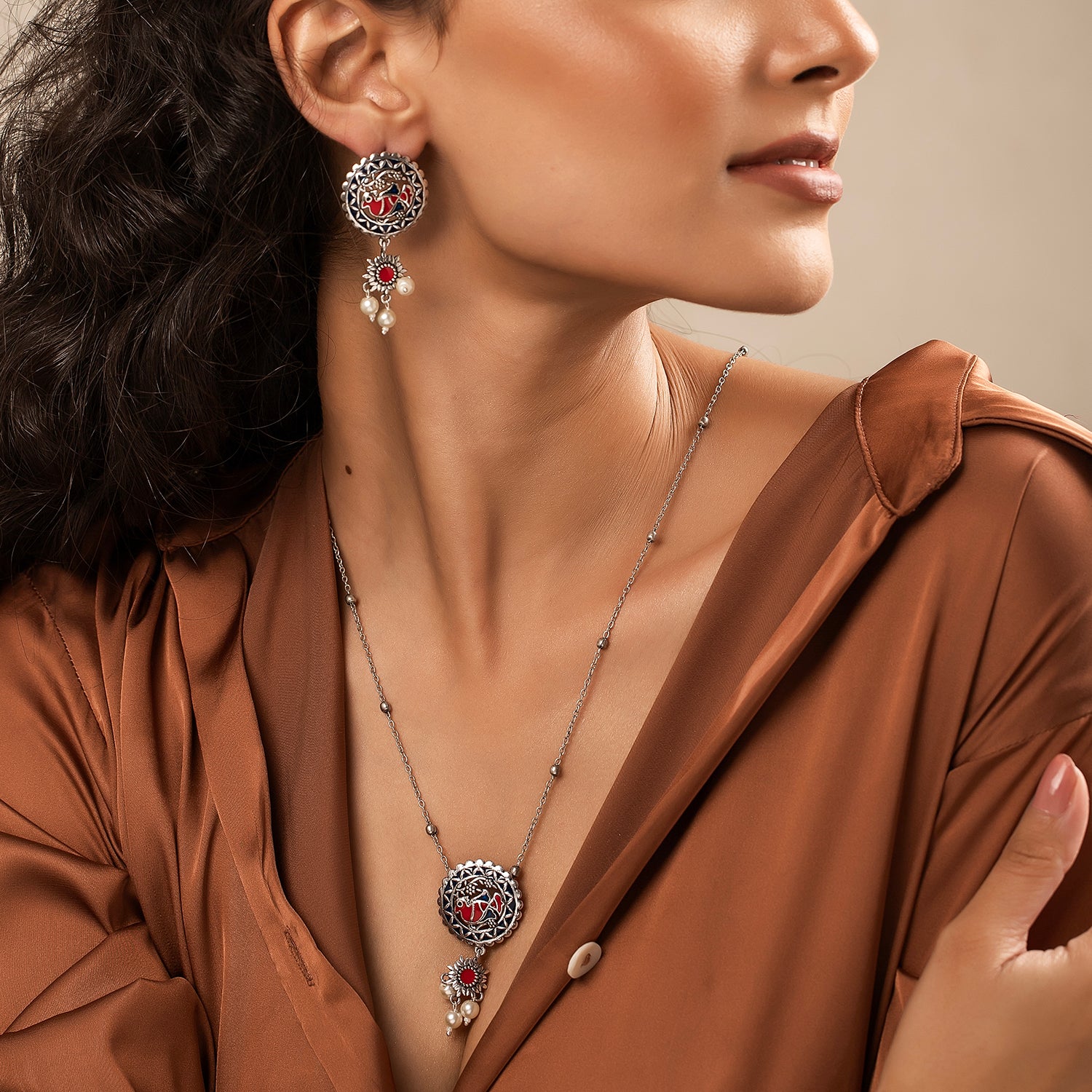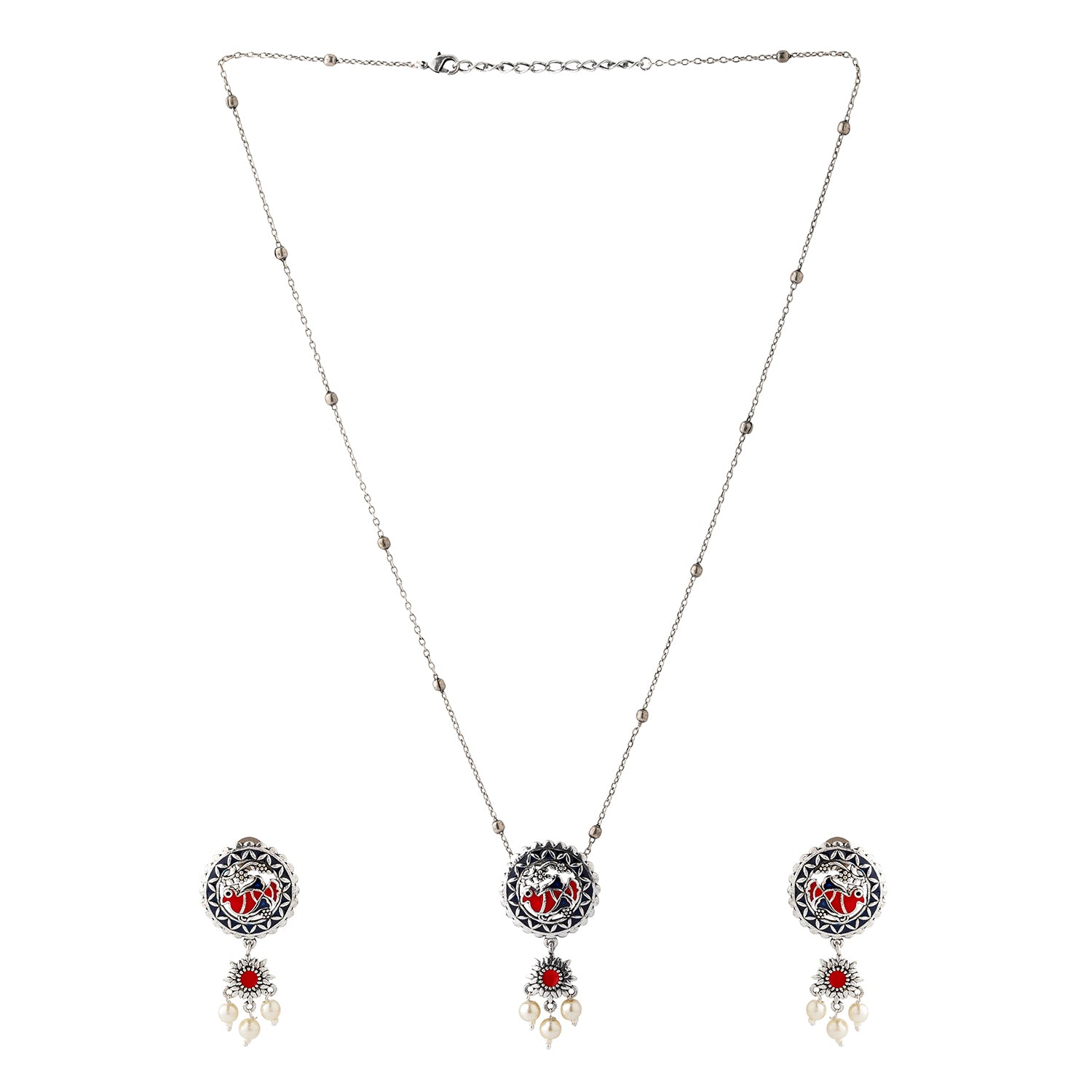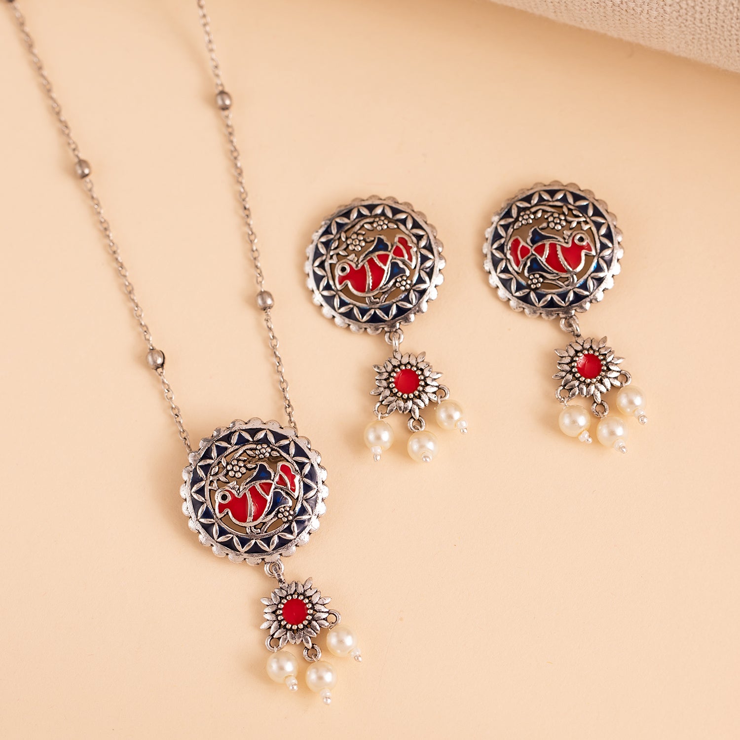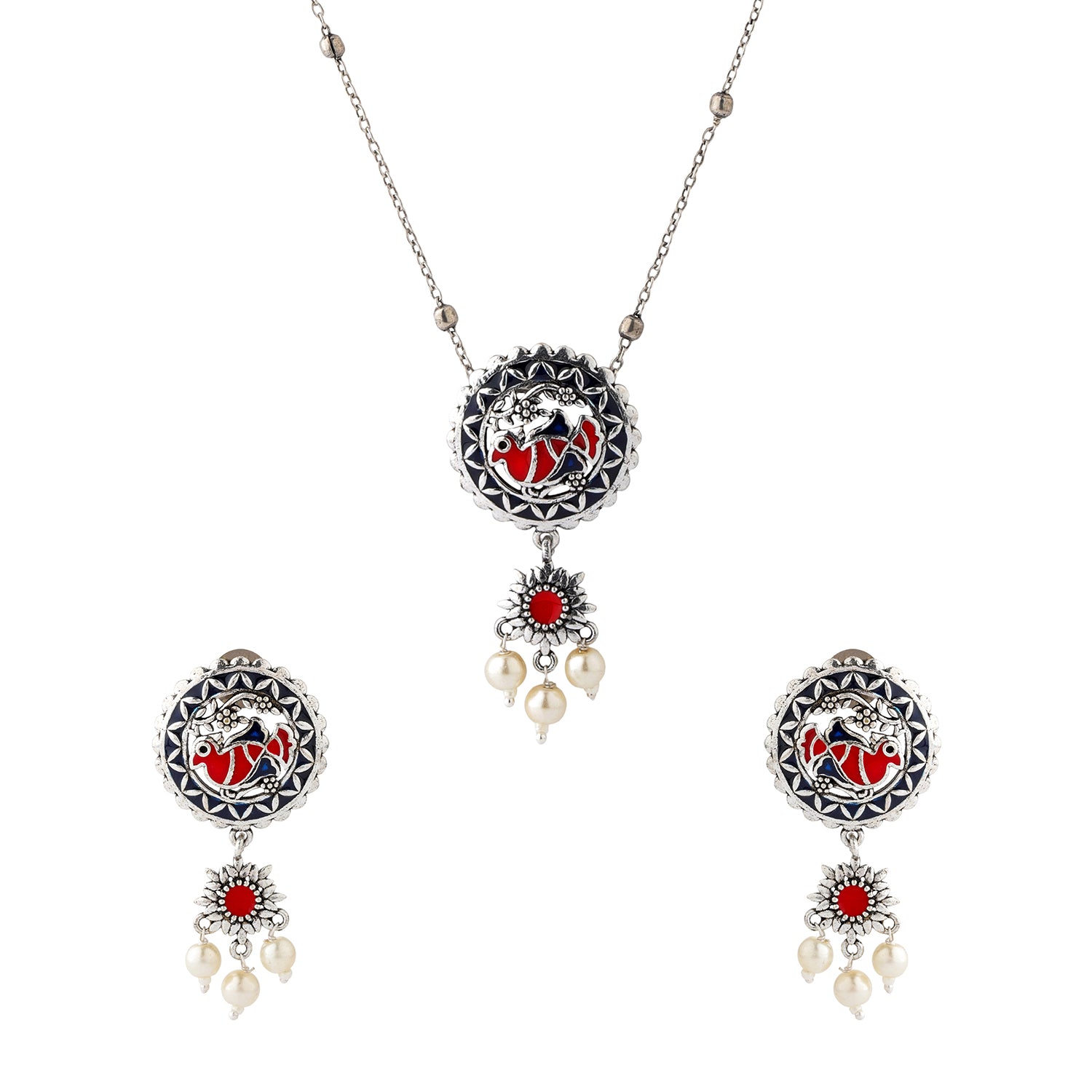 Madhubani Pakhi Phool Oxidised Enamel Pendant Set