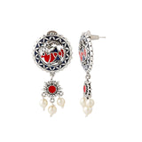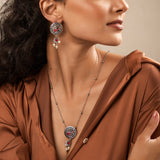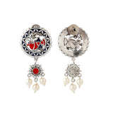 Madhubani Pakhi Phool Oxidised Enamel Pendant Set – A masterful blend of tradition and contemporary elegance, this statement pendant set is a true testament to artistic craftsmanship. Designed in brass with silver plating, it features intricate jali work and vibrant enamel detailing, inspired by the time-honored Madhubani art—a tradition that has flourished for over 2500 years. The pendant and matching earrings showcase delicate bird and floral motifs, symbolizing harmony, beauty, and freedom, all brought to life through deep red and blue enamel accents with pearl embellishments for a refined touch. A perfect vacation wear accessory, this trendy pendant set effortlessly complements both traditional and Indo-Western outfits, making it ideal for daily wear, office jewelry, and festive occasions like Diwali, Raksha Bandhan, Holi, and even a Valentine’s gift. Whether gifting it to your mother, sister, wife, or girlfriend, or styling it for a chic, effortless look, this designer piece celebrates culture in a wearable form, ensuring timeless elegance and heritage-inspired charm.