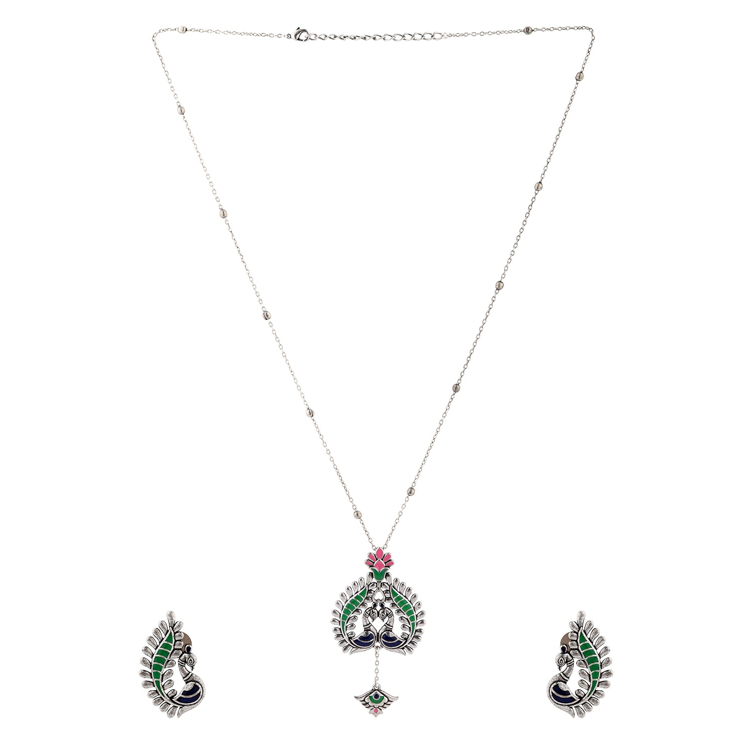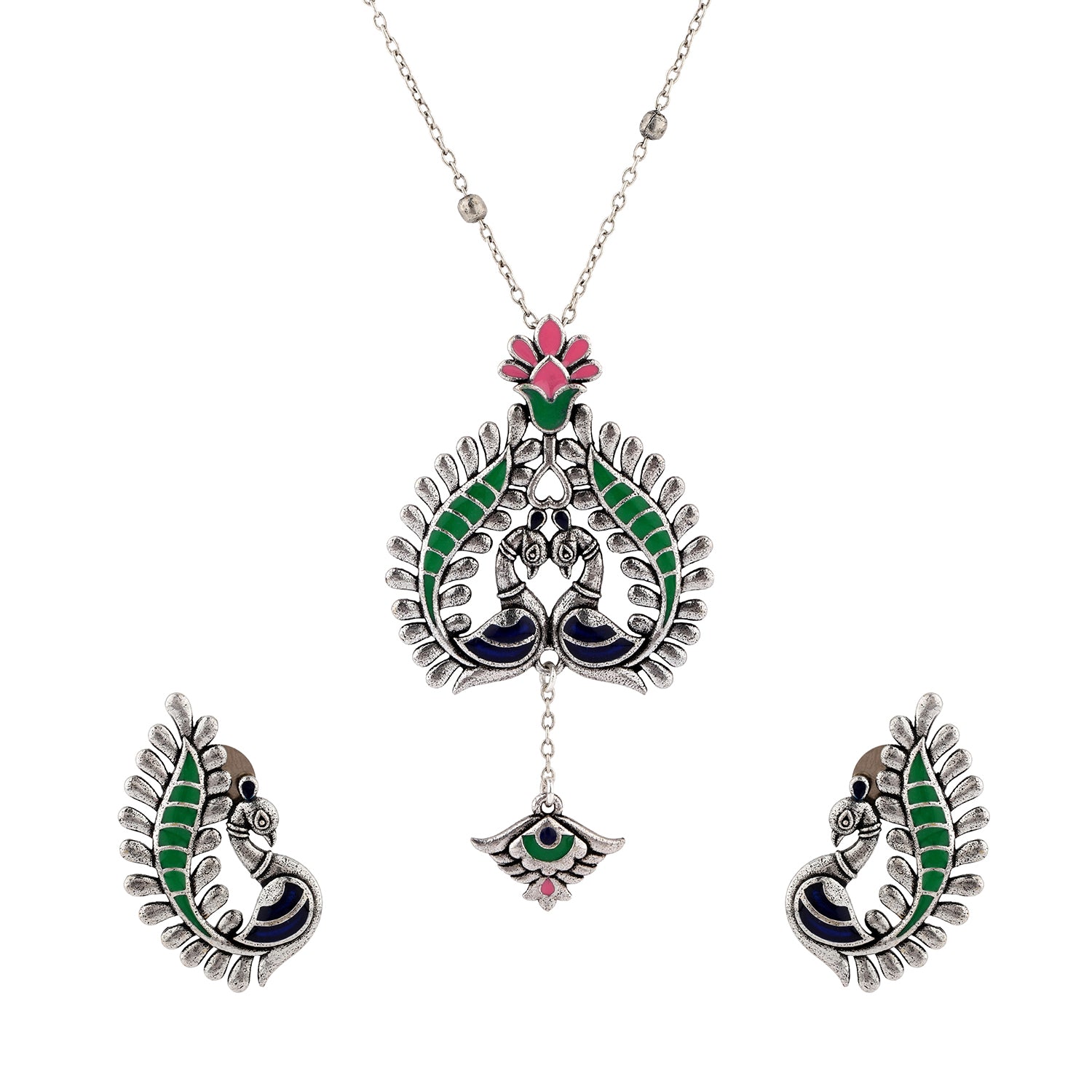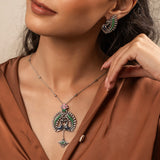 Madhubani Peacock Pratha Oxidised Enamel Pendant Set